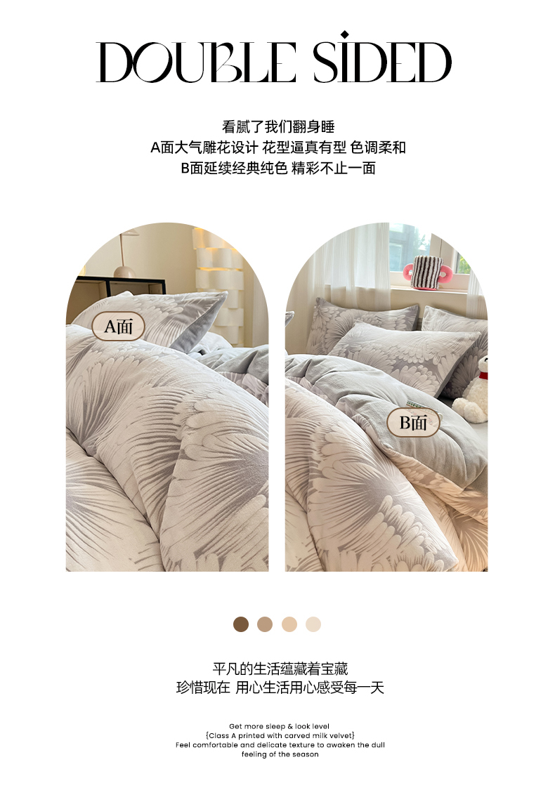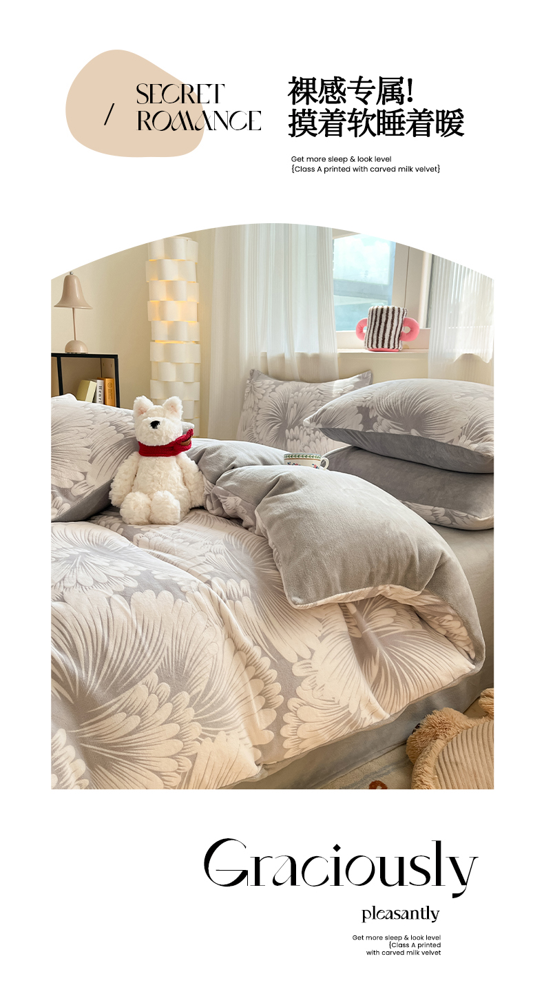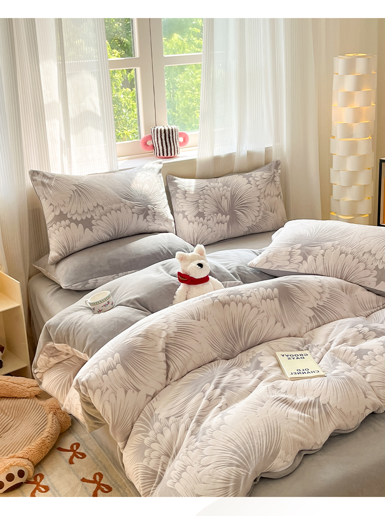 莱茵家居 2024新款a类加厚立体雕花牛奶绒四件套 烟花-灰