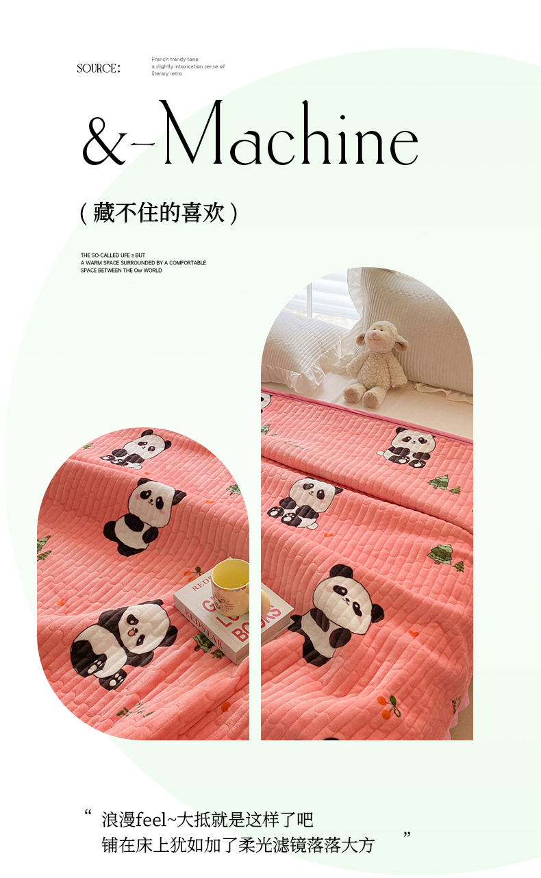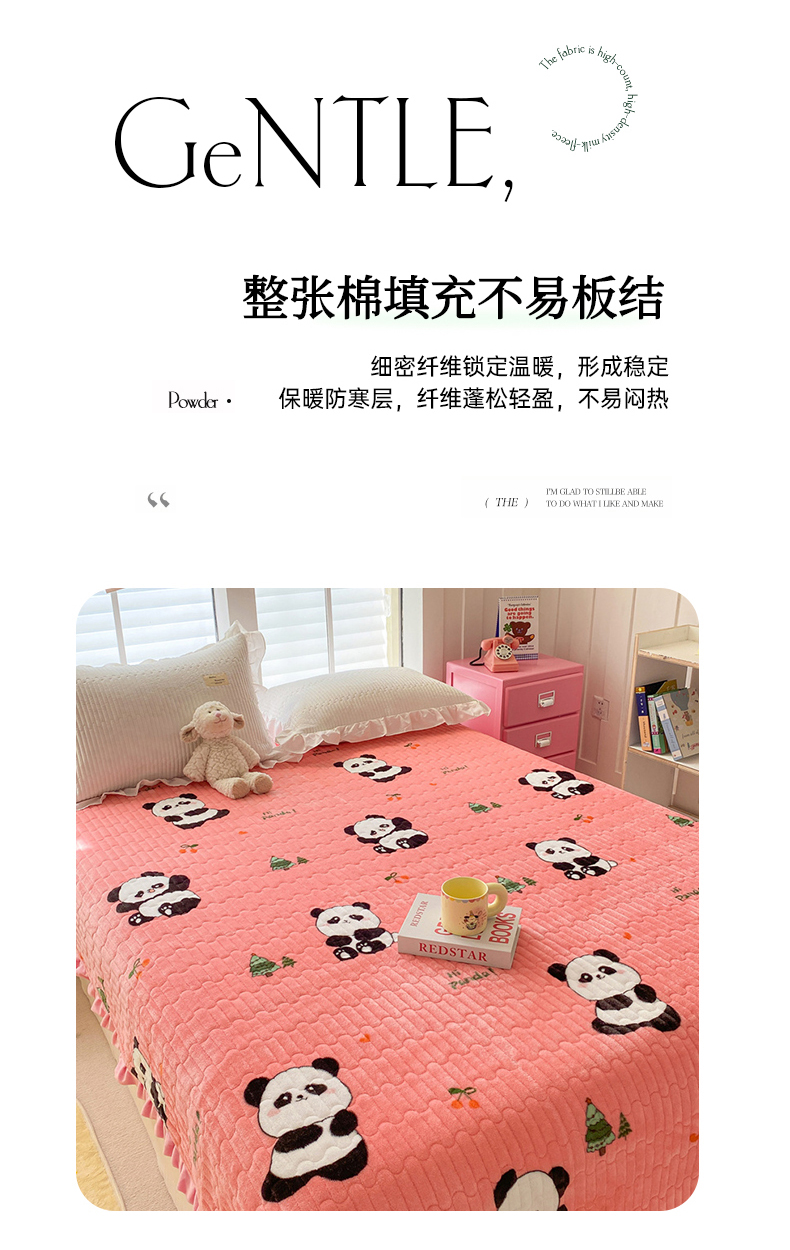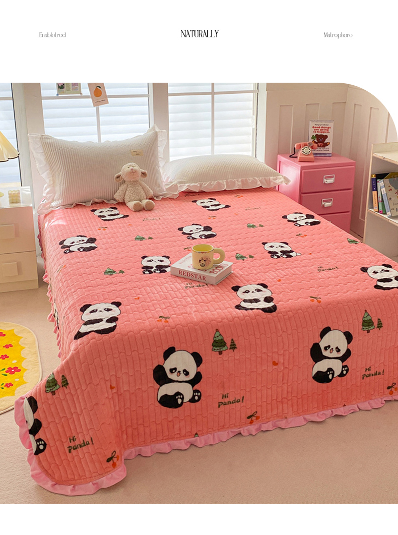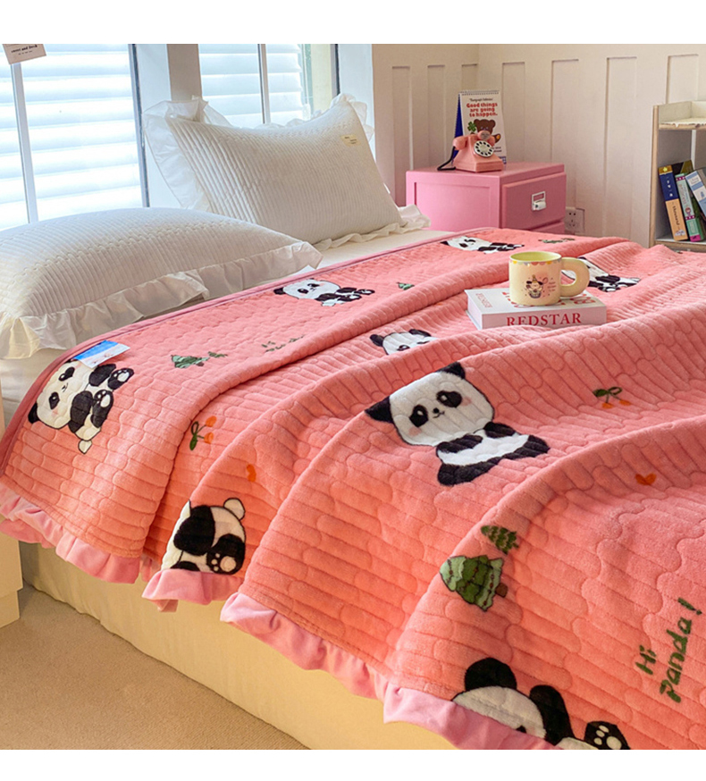 胜权家纺 2024秋冬新款印花牛奶绒加厚保暖圆角花边夹棉床盖 可爱熊猫粉