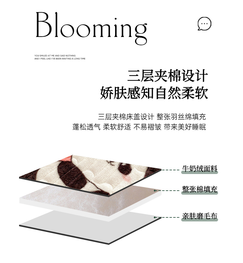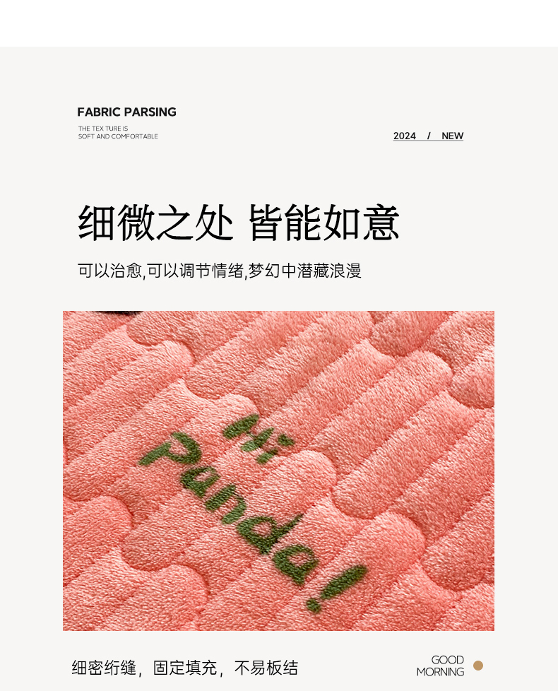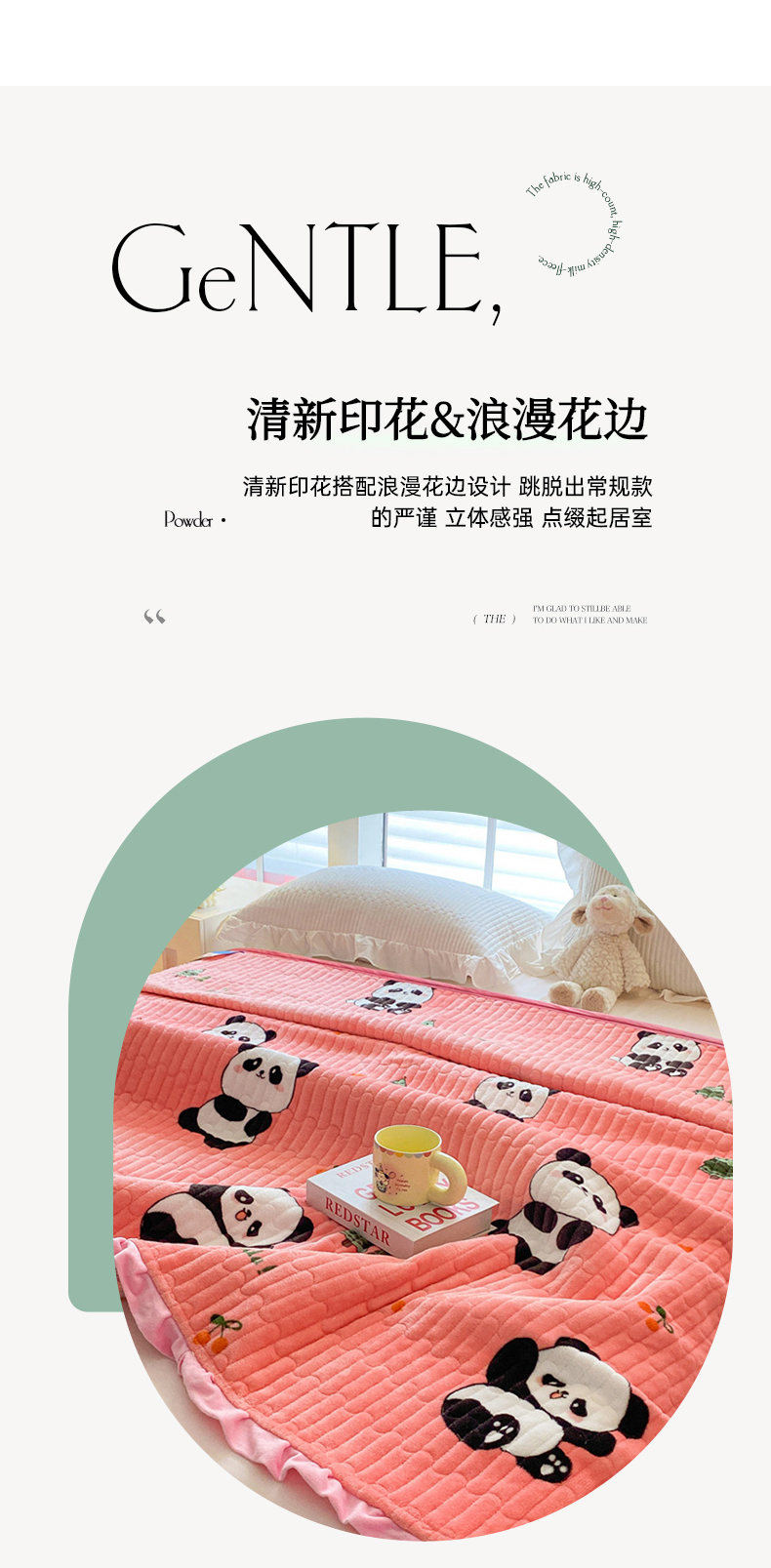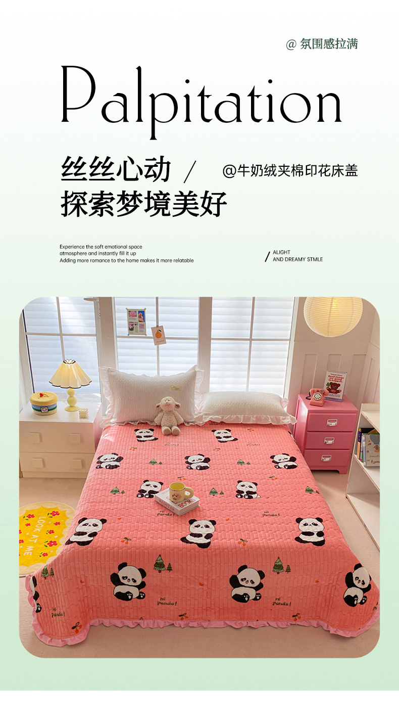 商品名称:胜权家纺 2024秋冬新款印花牛奶绒加厚保暖圆角花边夹棉床盖 可爱熊猫粉