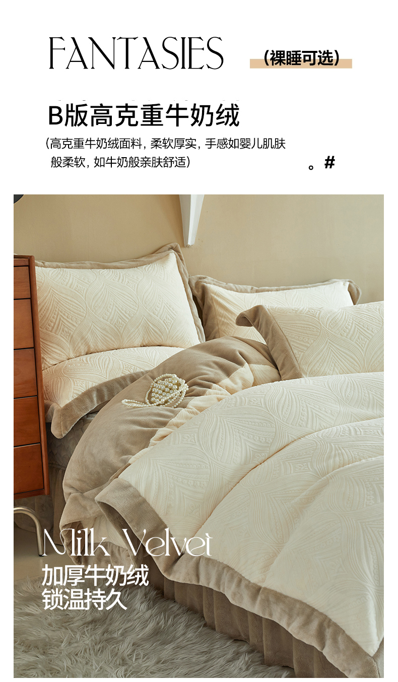 (总)舒梦琪家纺 2024新款加厚牛奶绒夹棉绣床盖四件套12斤左右,粉色,灰色,蓝色,绿色,奶白,紫色