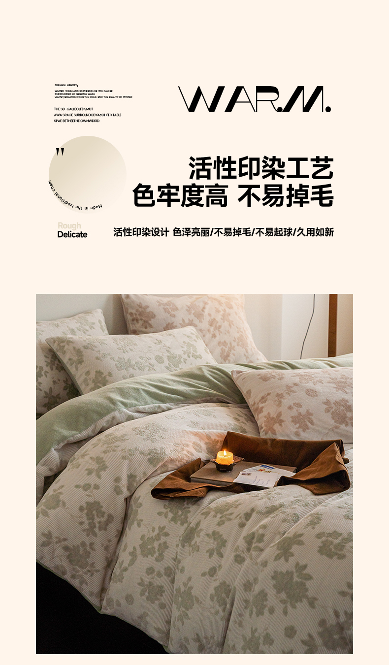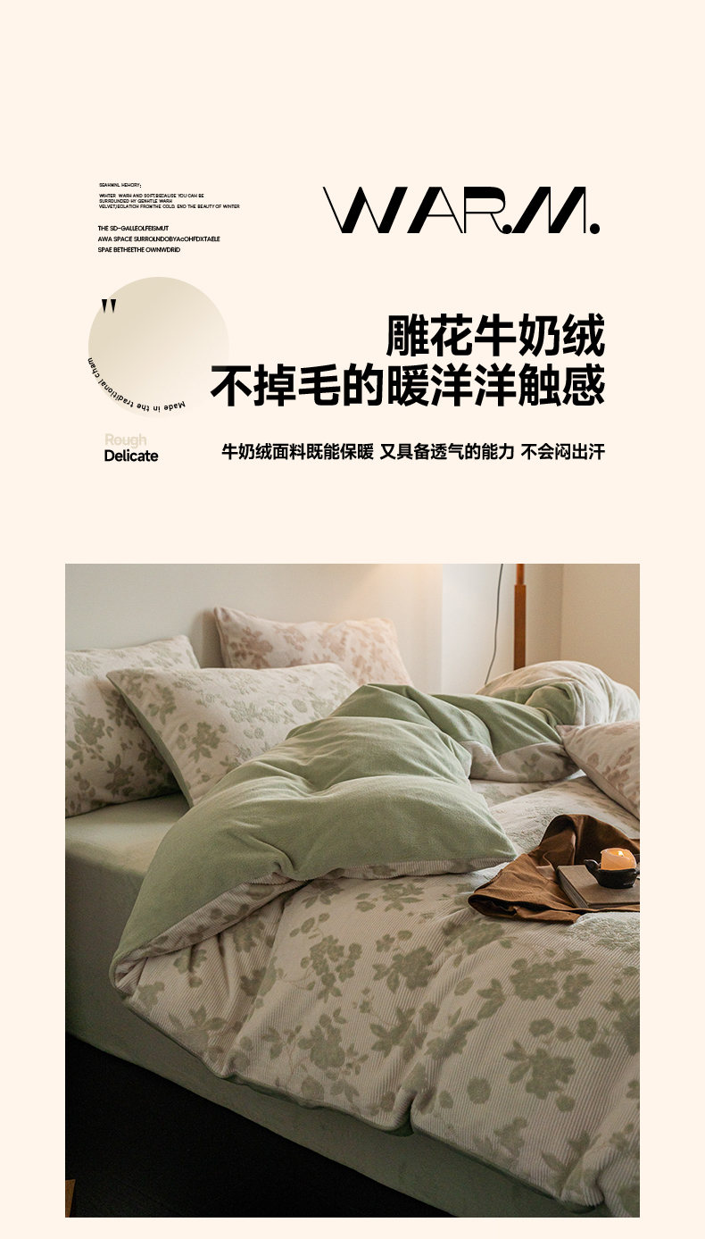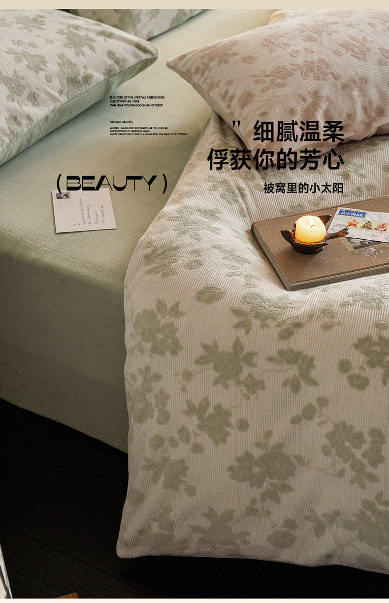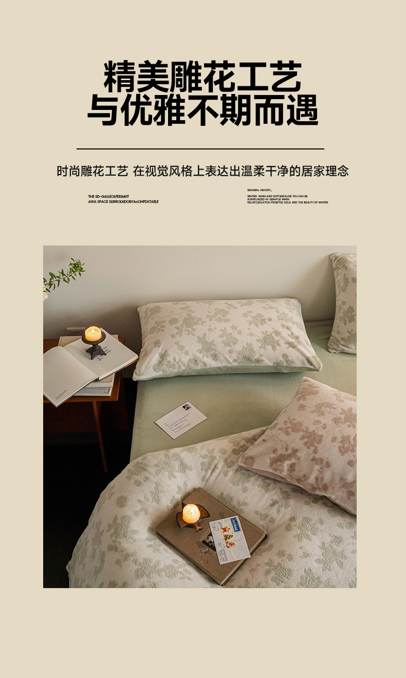 当前位置: 91家纺网 > 商品网购 > 床品套件 > 四件套 > 牛奶绒四件套 > 华超针织 2024新款雕花绒四件套-繁花+花千朵系列 花千朵-豆绿