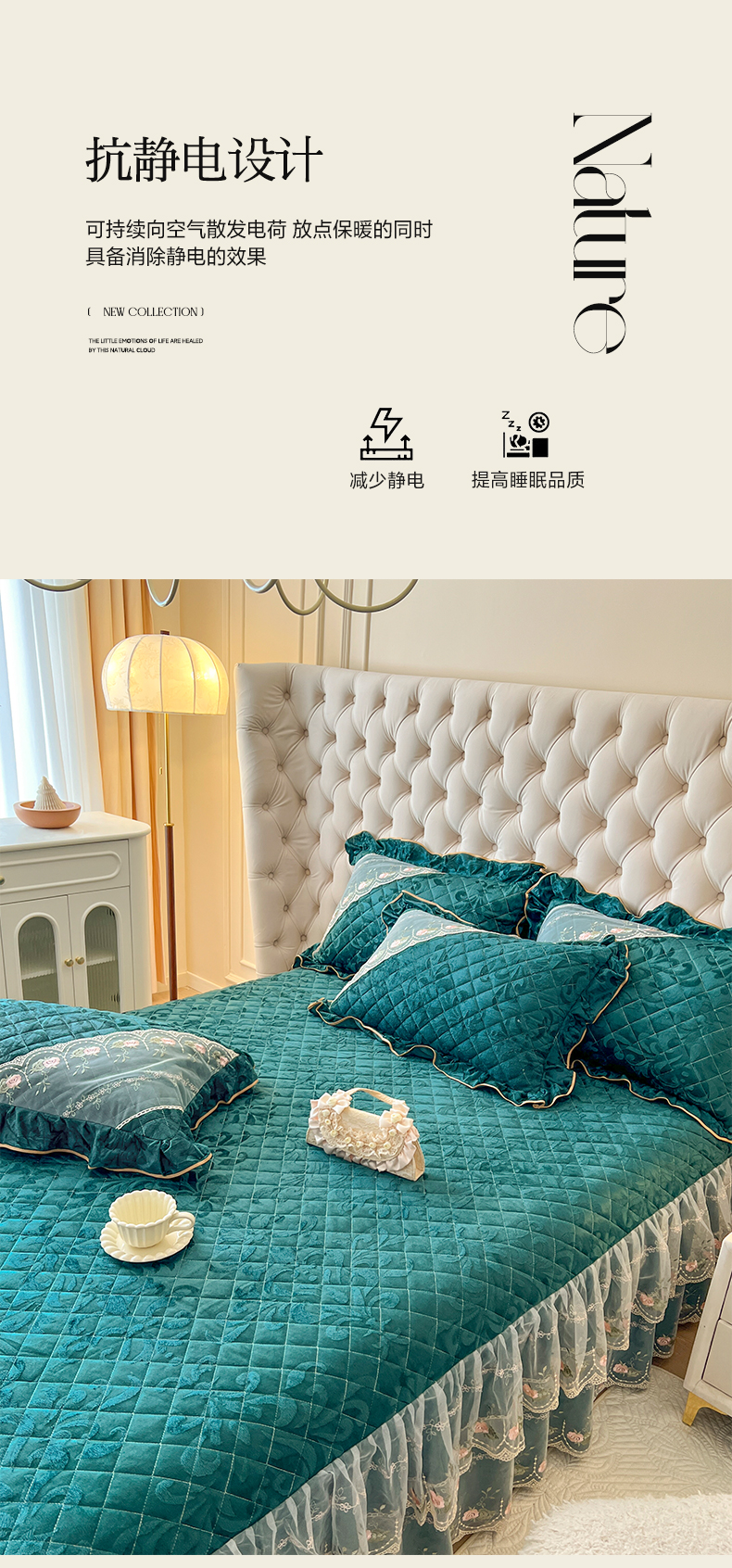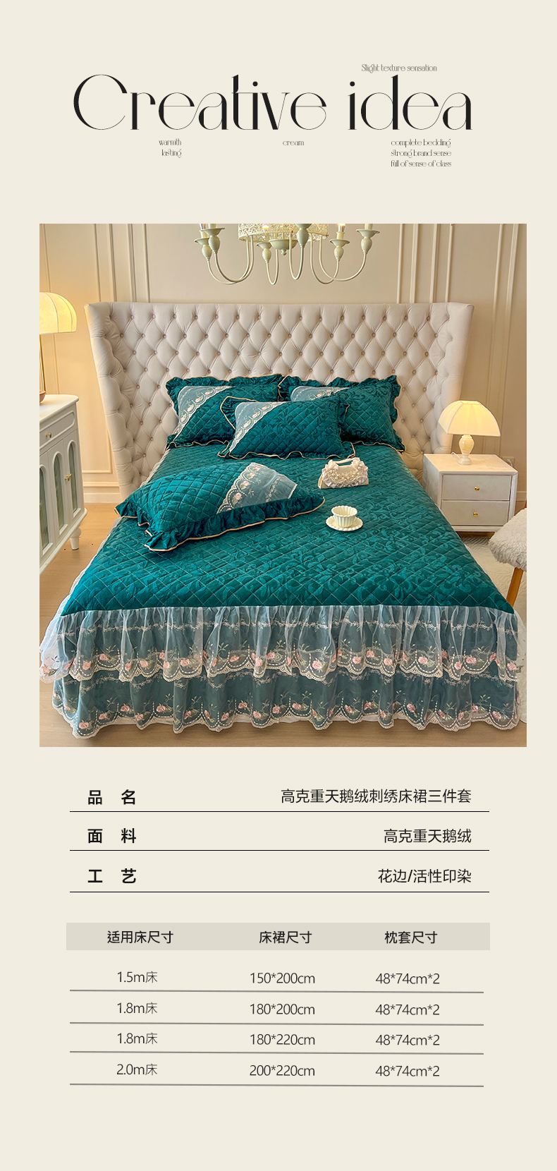 商品名称:网红馆(ck家纺) 2025新款高克重天鹅绒刺绣床裙三件套-花语秘境 花语秘境-湖绿
