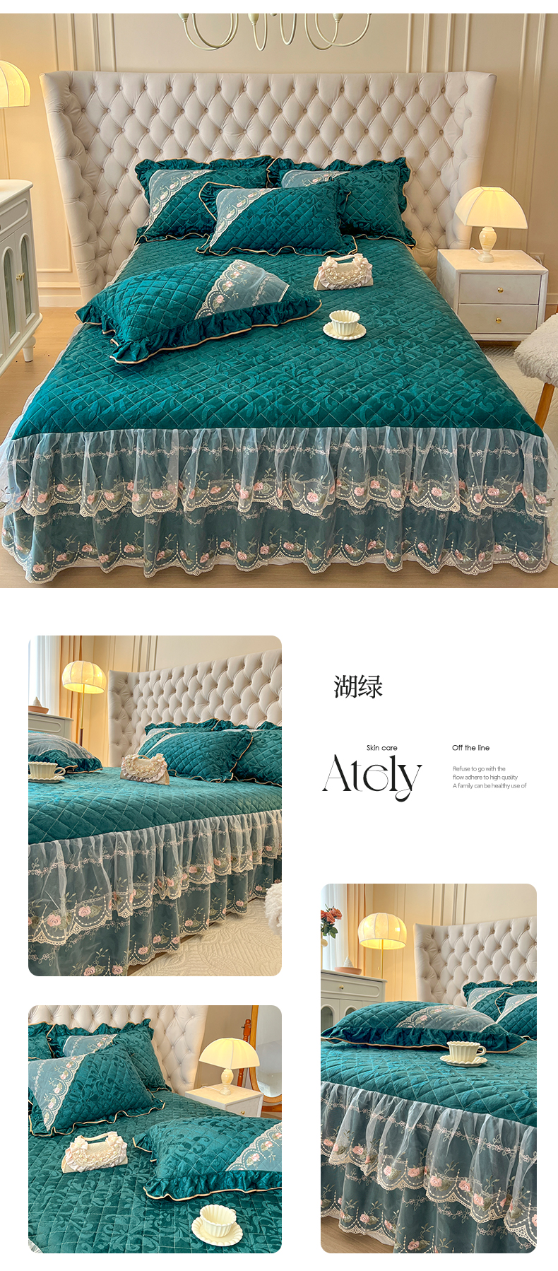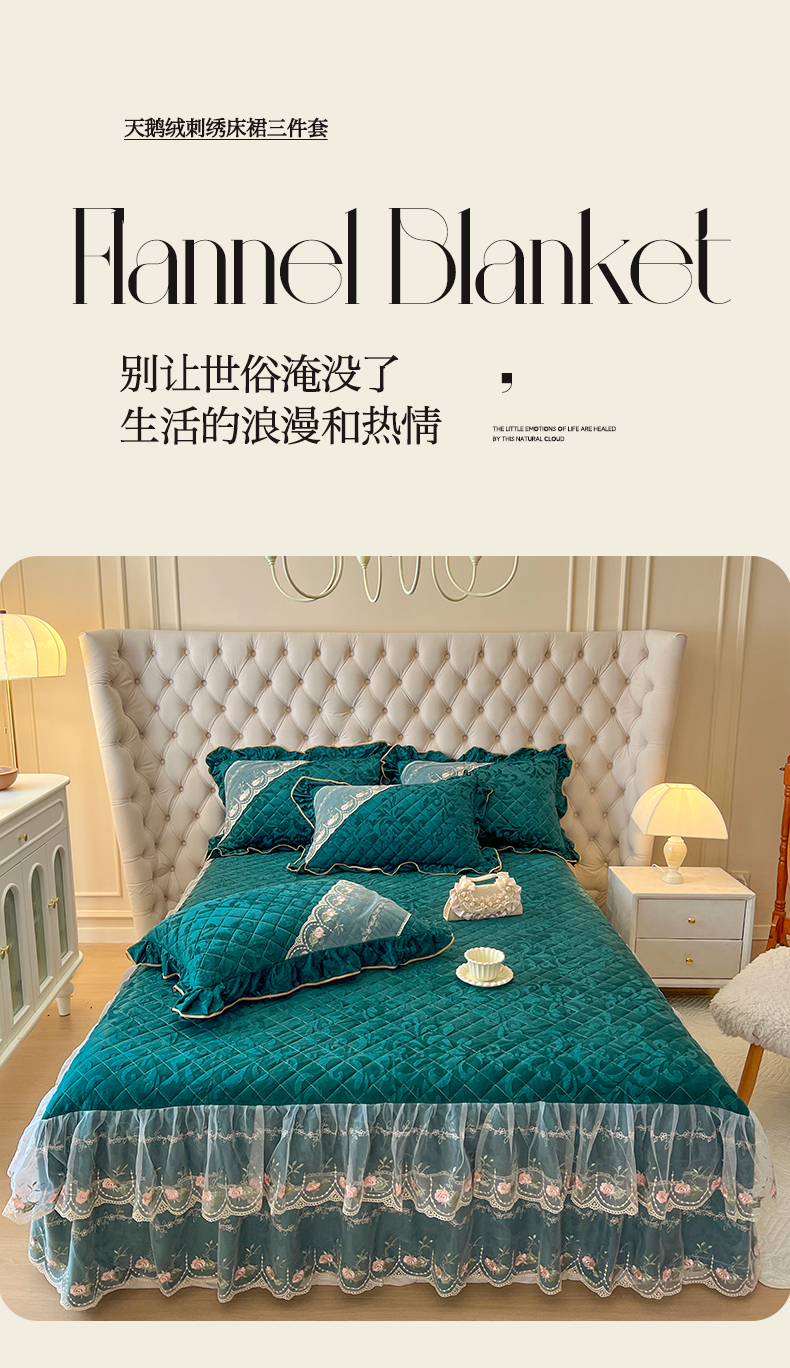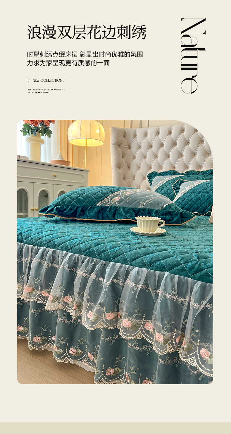 网红馆(ck家纺) 2025新款高克重天鹅绒刺绣床裙三件套-花语秘境 花语秘境-湖绿