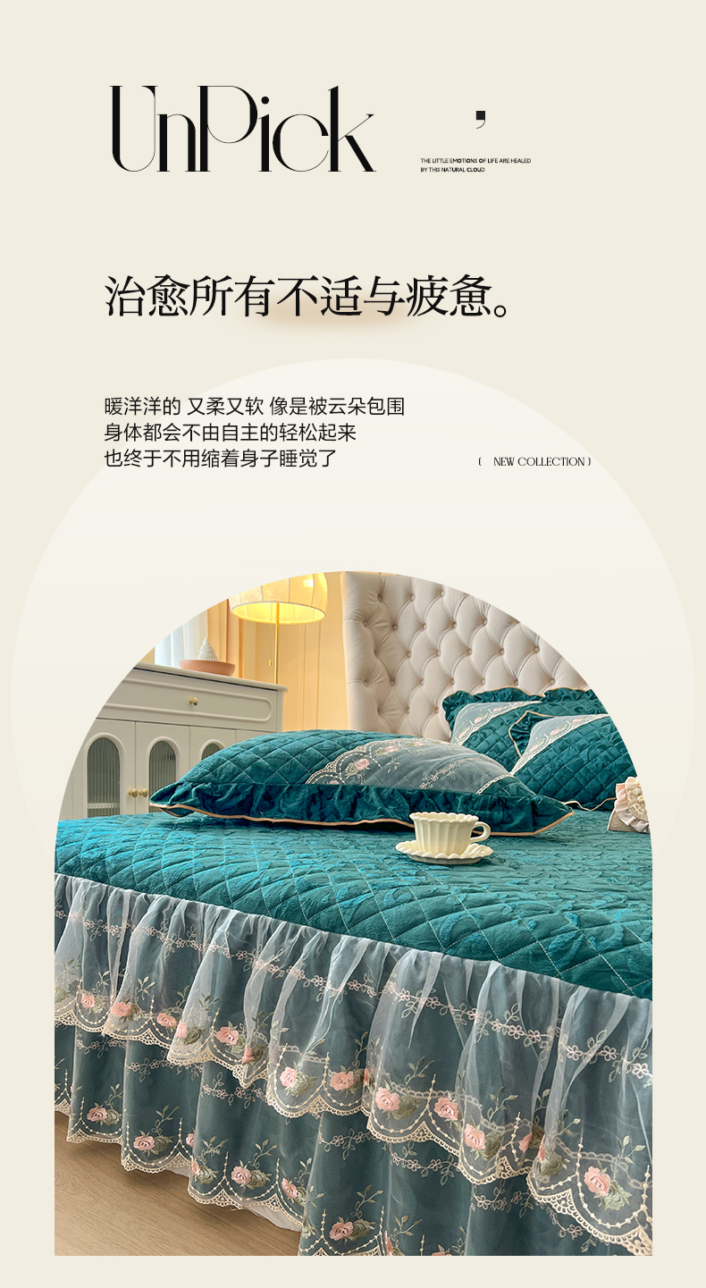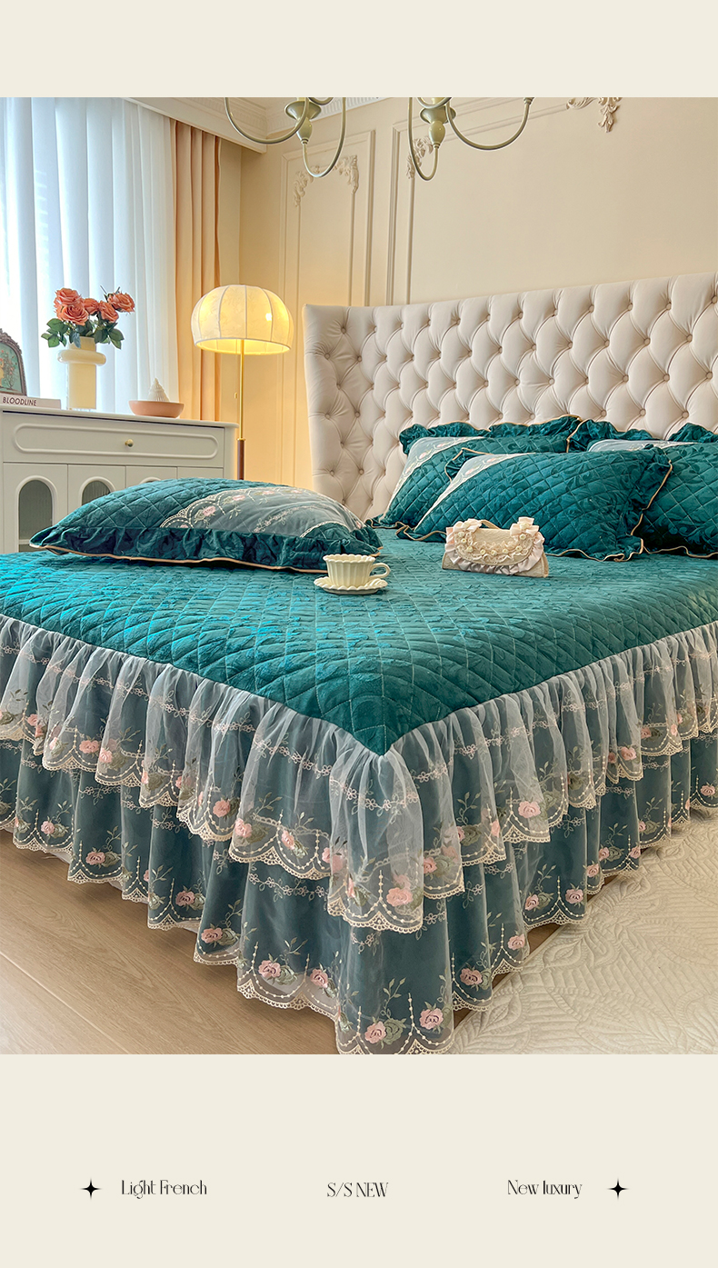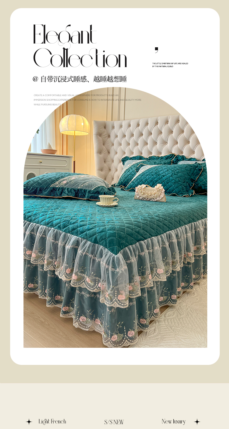 网红馆(ck家纺) 2025新款高克重天鹅绒刺绣床裙三件套-花语秘境 花语秘境-湖绿