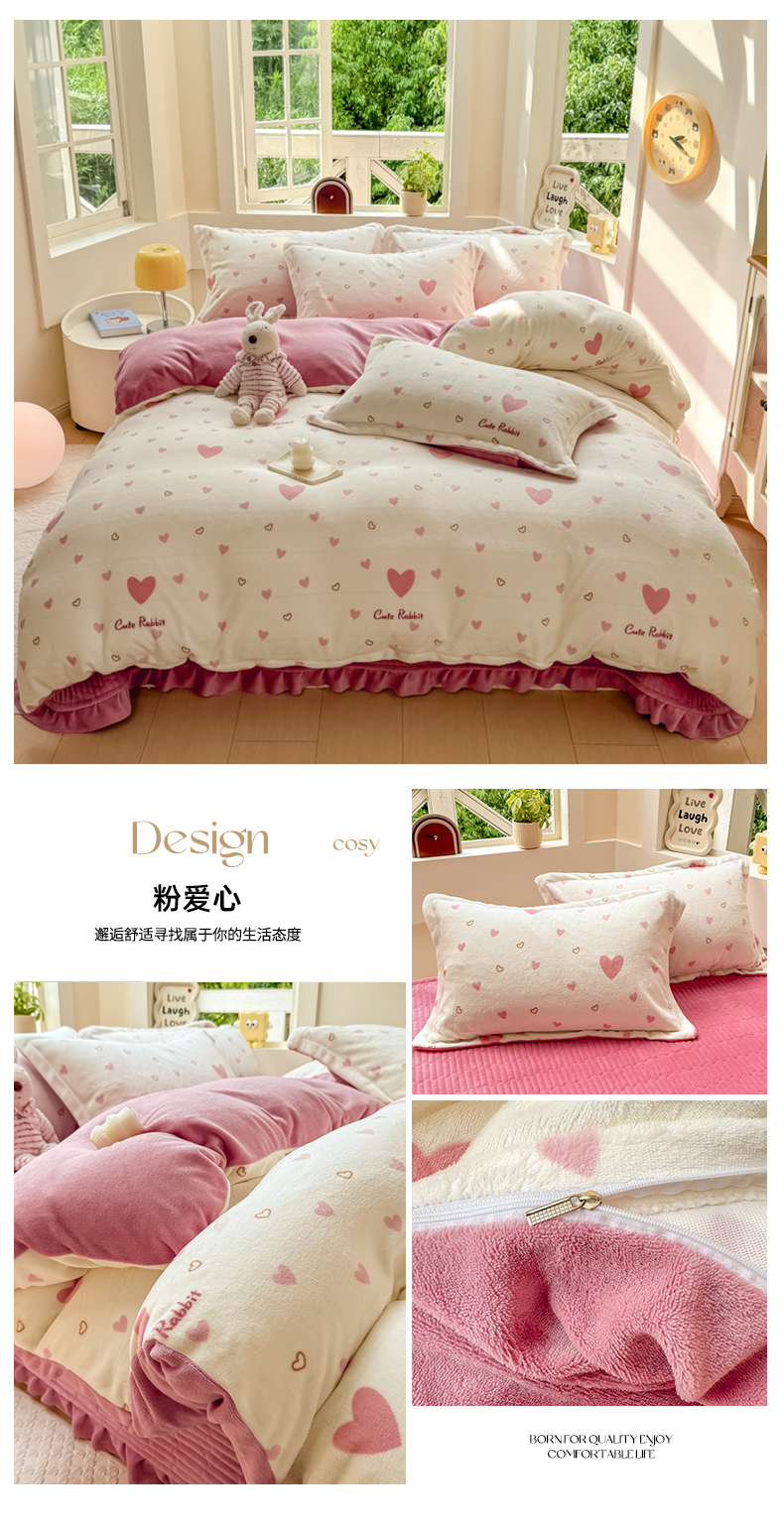 尚美 2024新款高克重印花花边牛奶绒床盖四件套 粉爱心