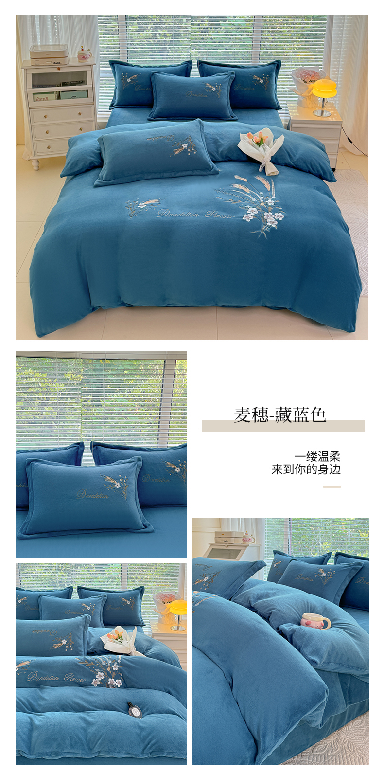 金米诺 2024新款绣花牛奶绒四件套 麦穗-藏蓝色