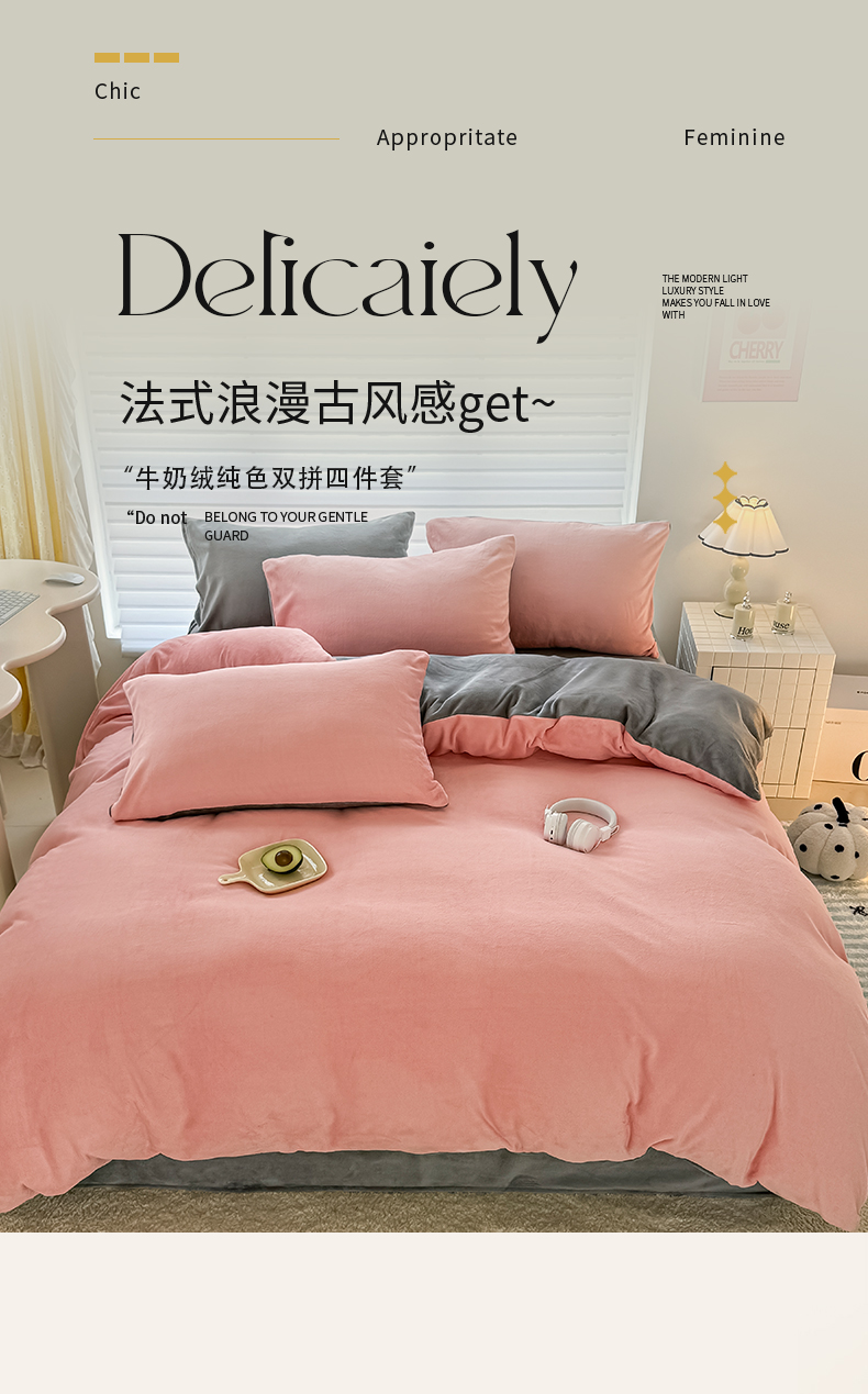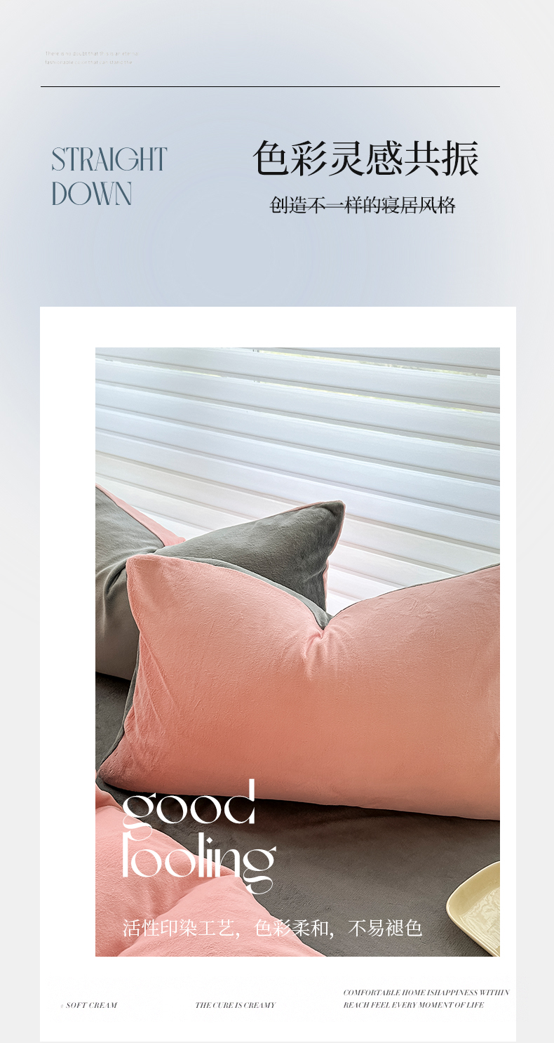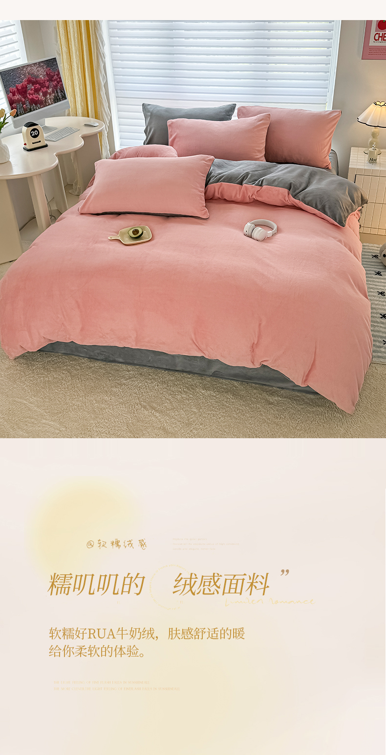 (总)觅妮家纺 2025新款纯色高克重牛奶绒四件套系列,果绿粉,宝石蓝,高级黑,卡其黑,柠檬粉,浅粉灰,深浅灰,树莓粉