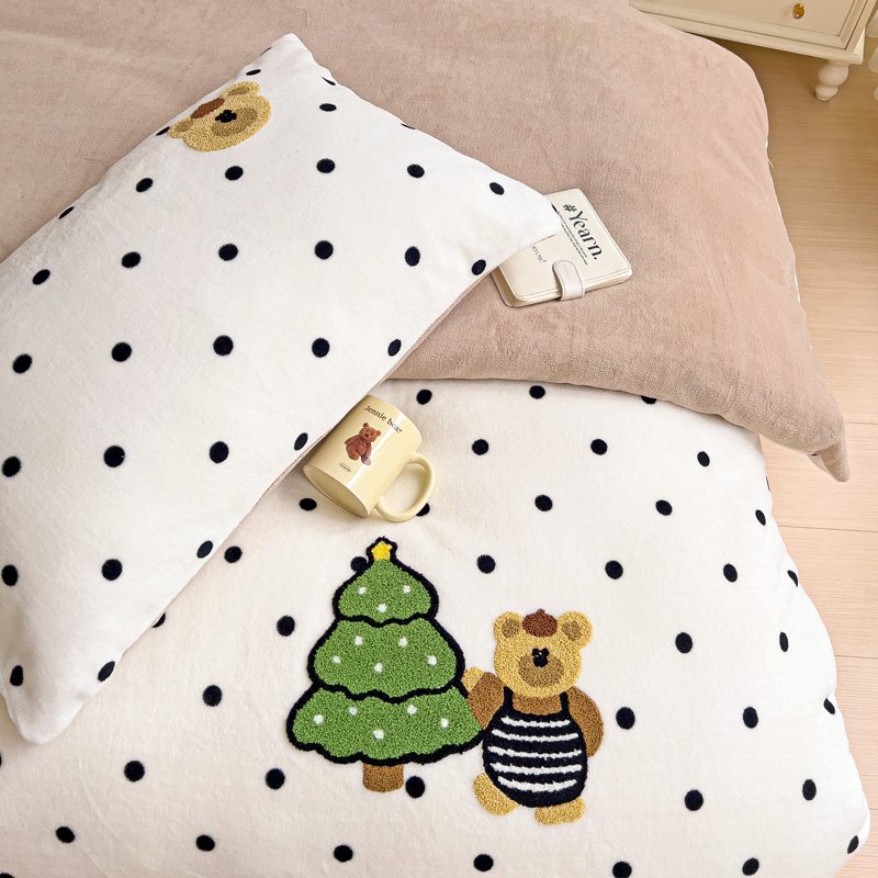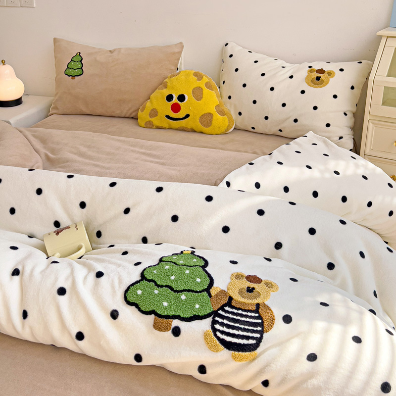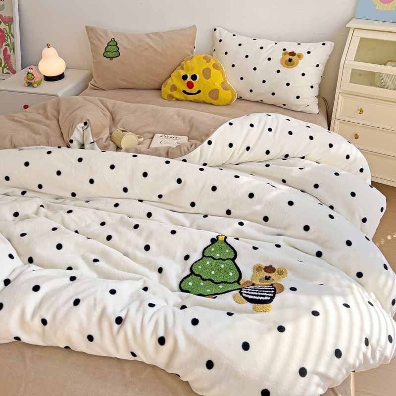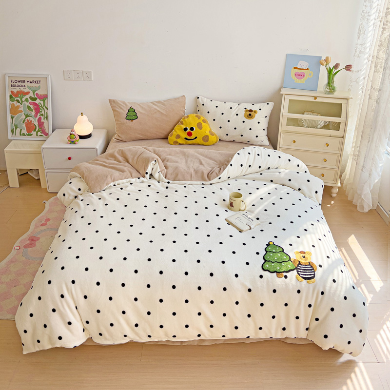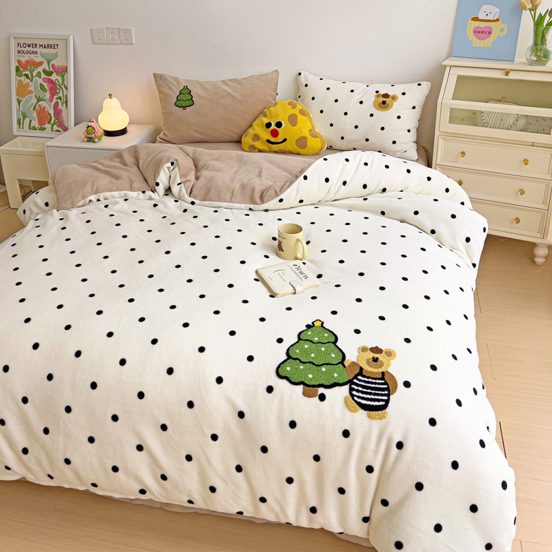 乐童家纺 2024新款高克重牛奶绒小清新印+绣系列四件套 波点小熊