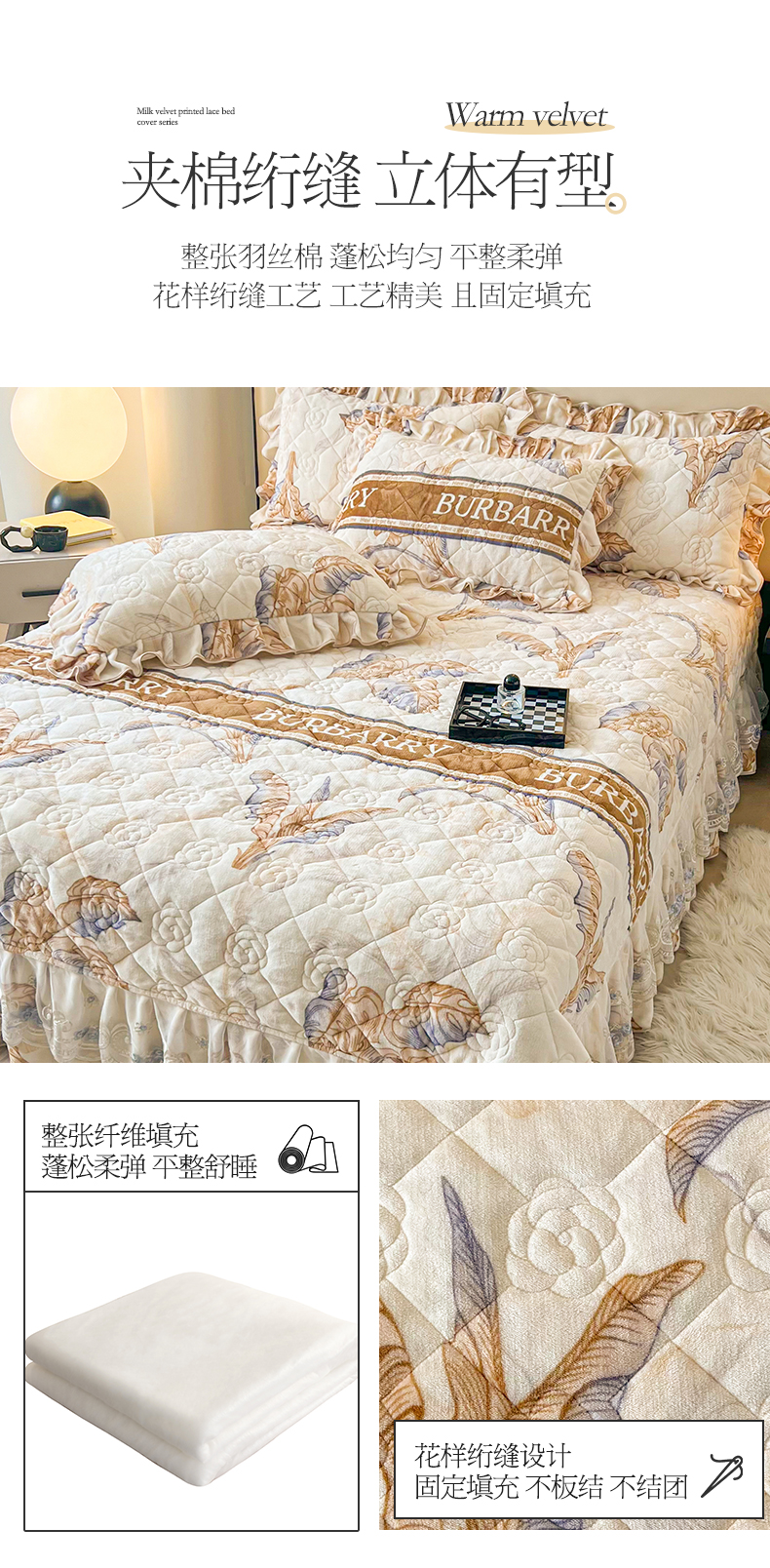 商品名称:宜凡家纺 2024新款牛奶绒印花夹棉花边床盖四件套 浮世花梦