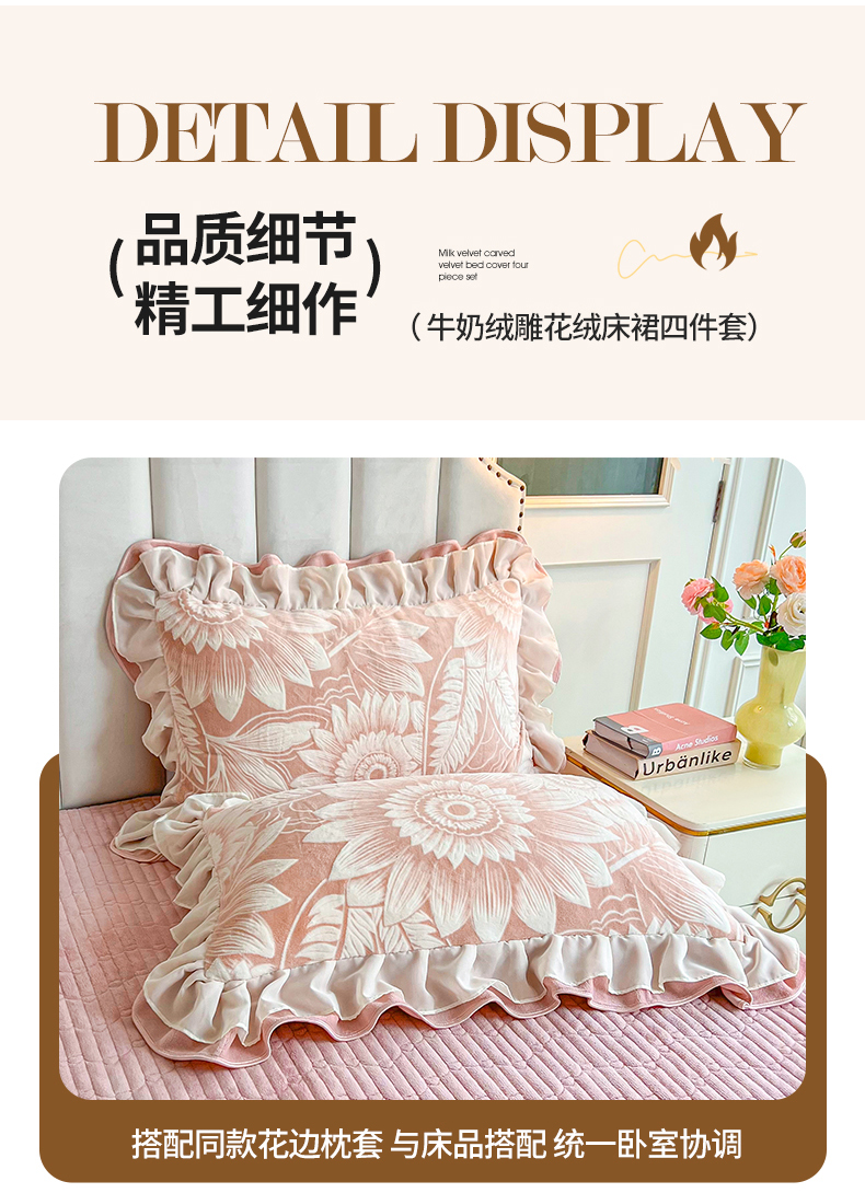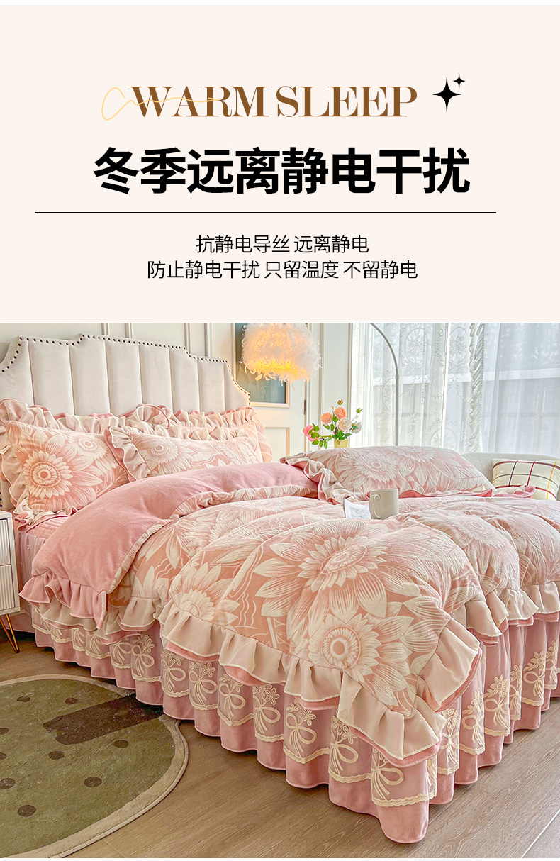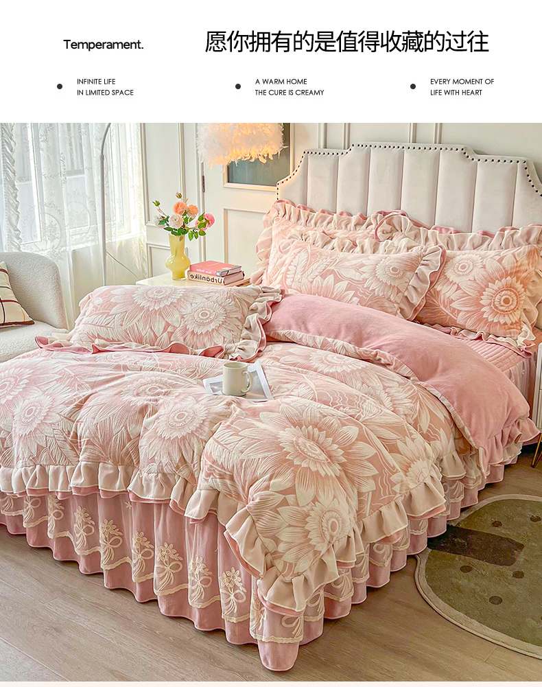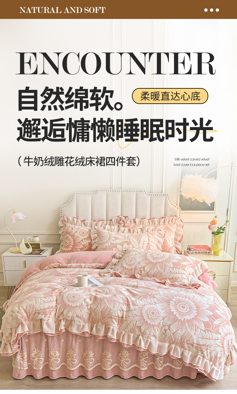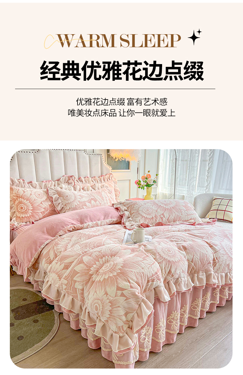 商品名称:宜凡家纺 2024新款牛奶绒雕花绒床裙四件套 海棠花开
