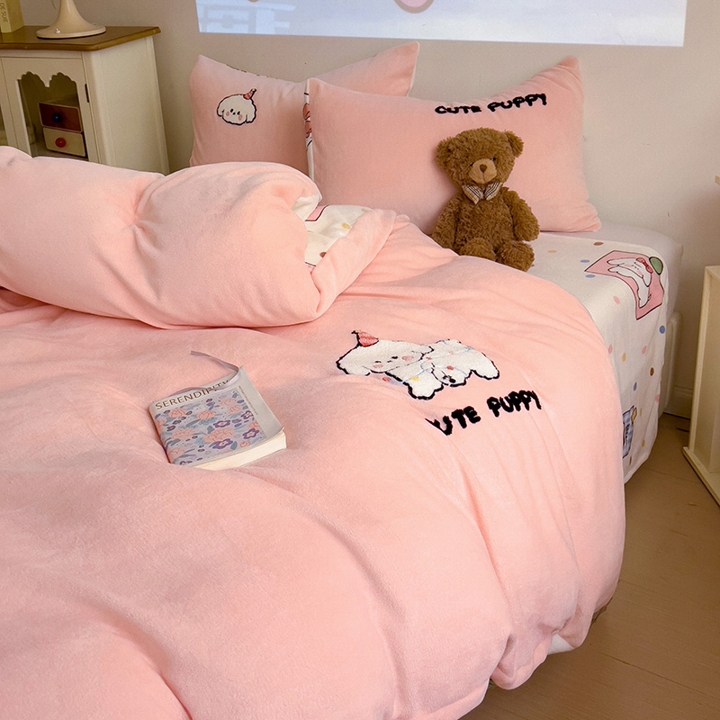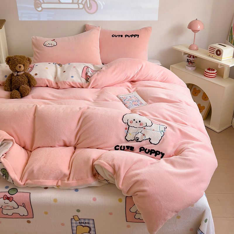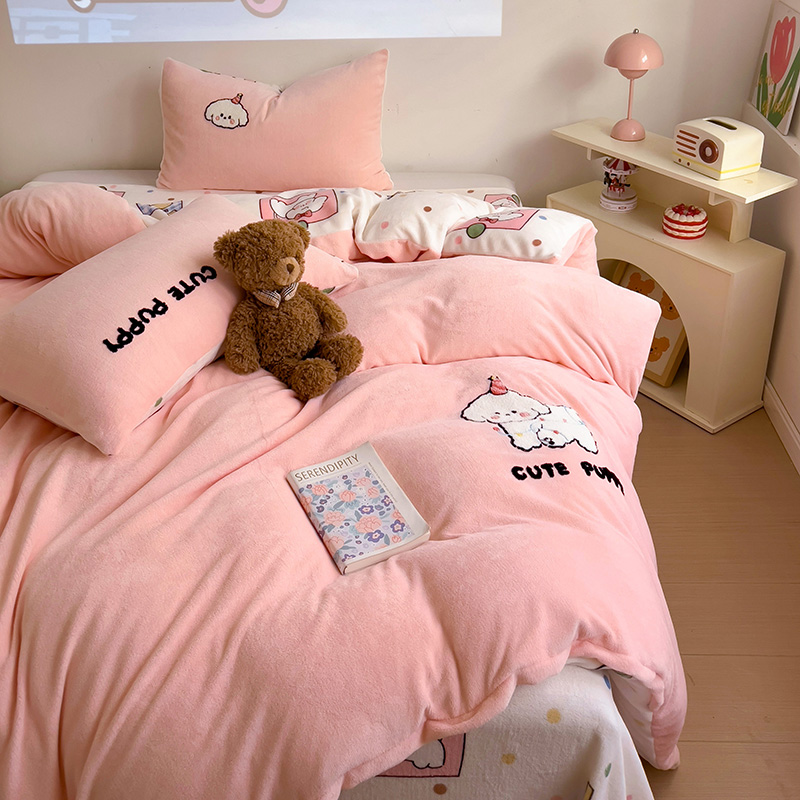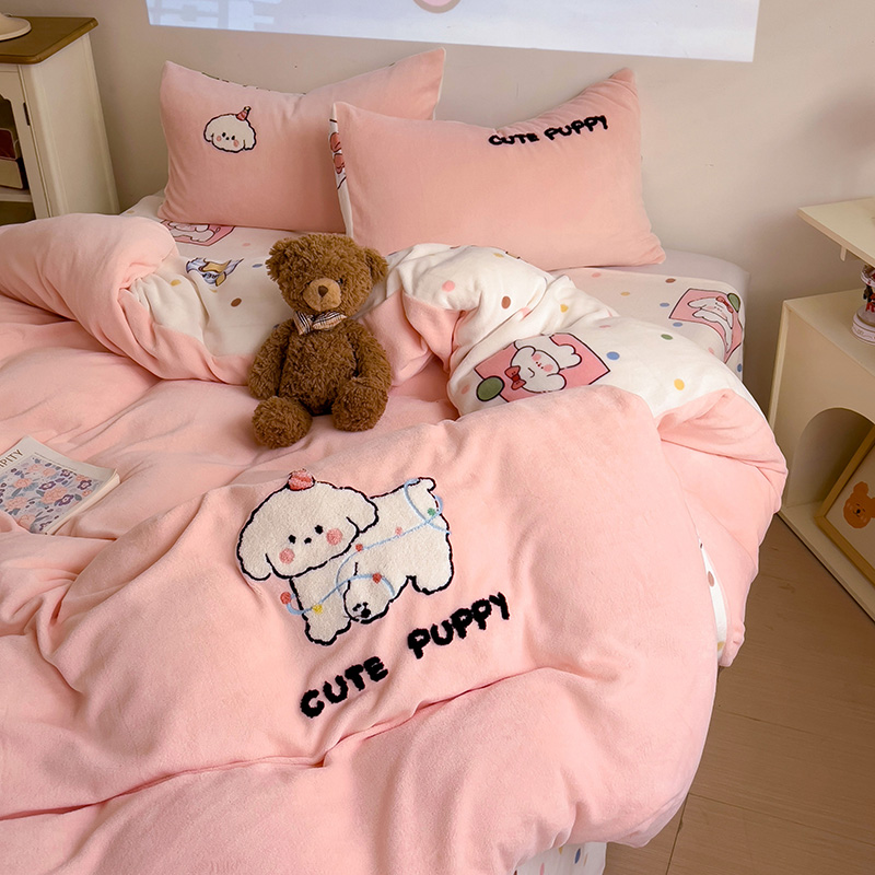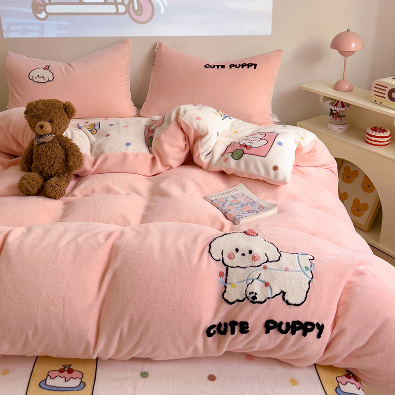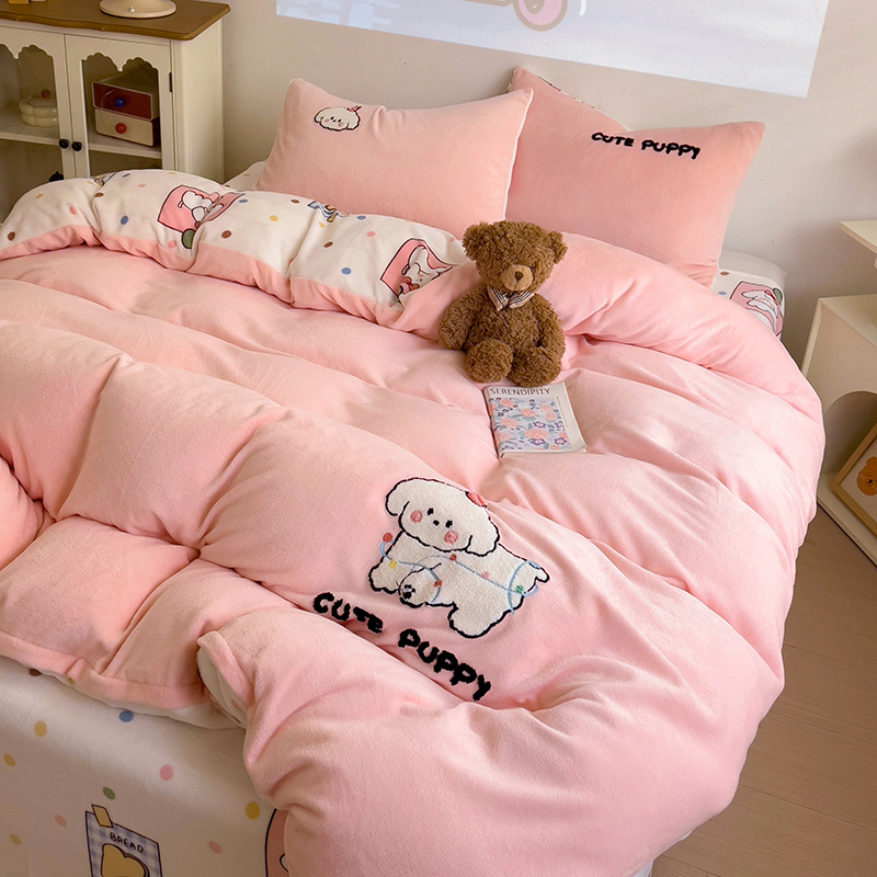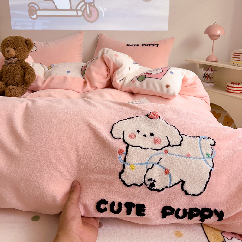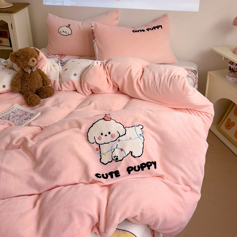 乐童家纺 2024新款高克重牛奶绒小清新印+绣系列四件套 可爱狗狗