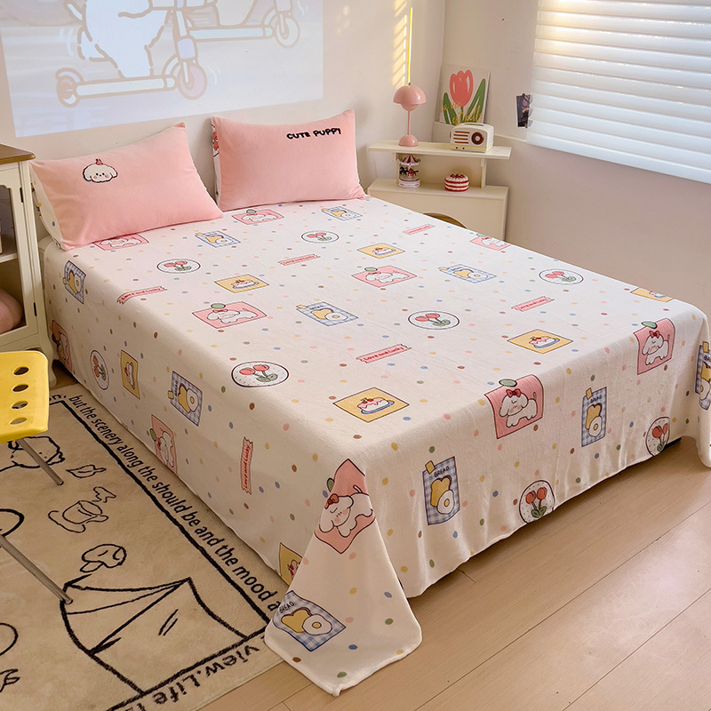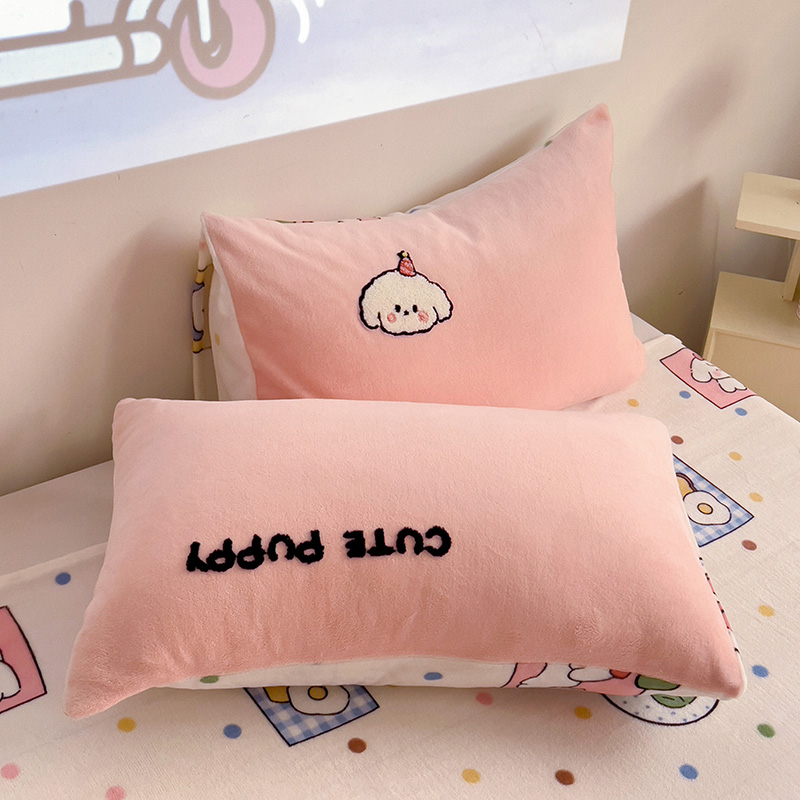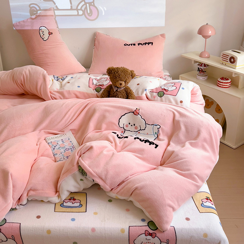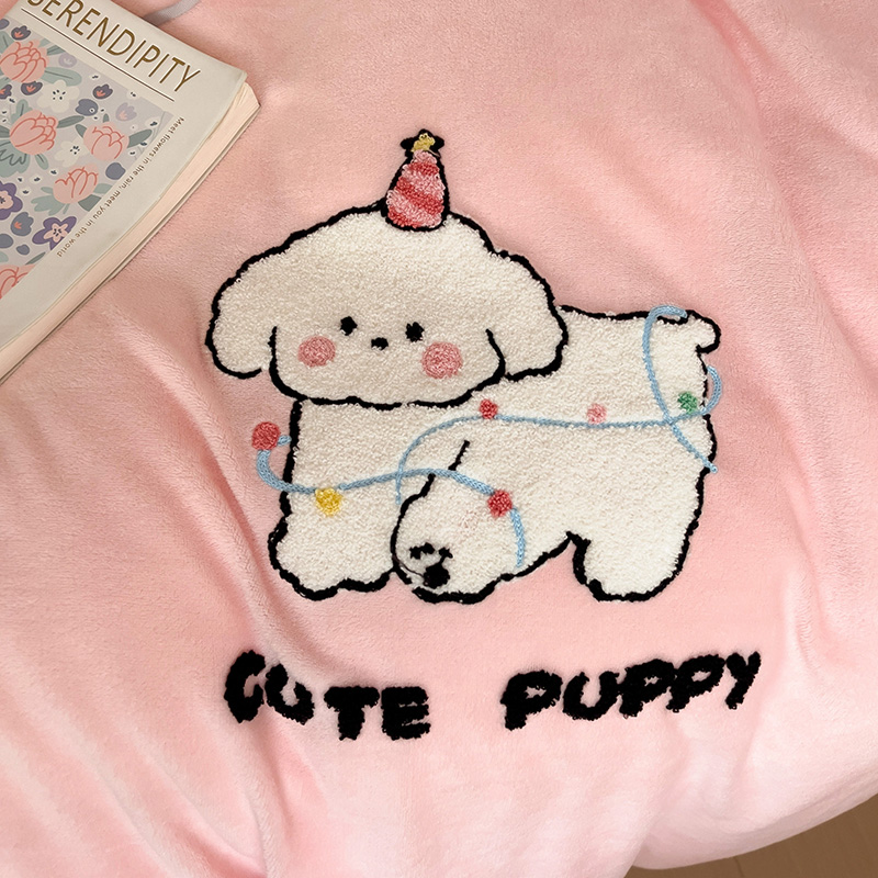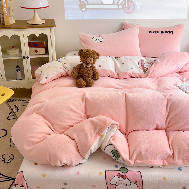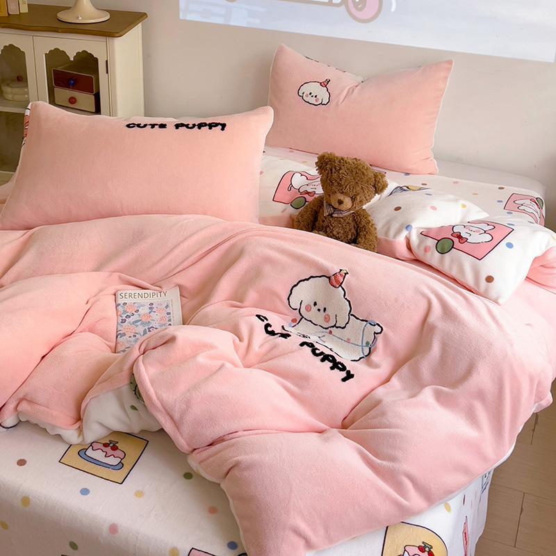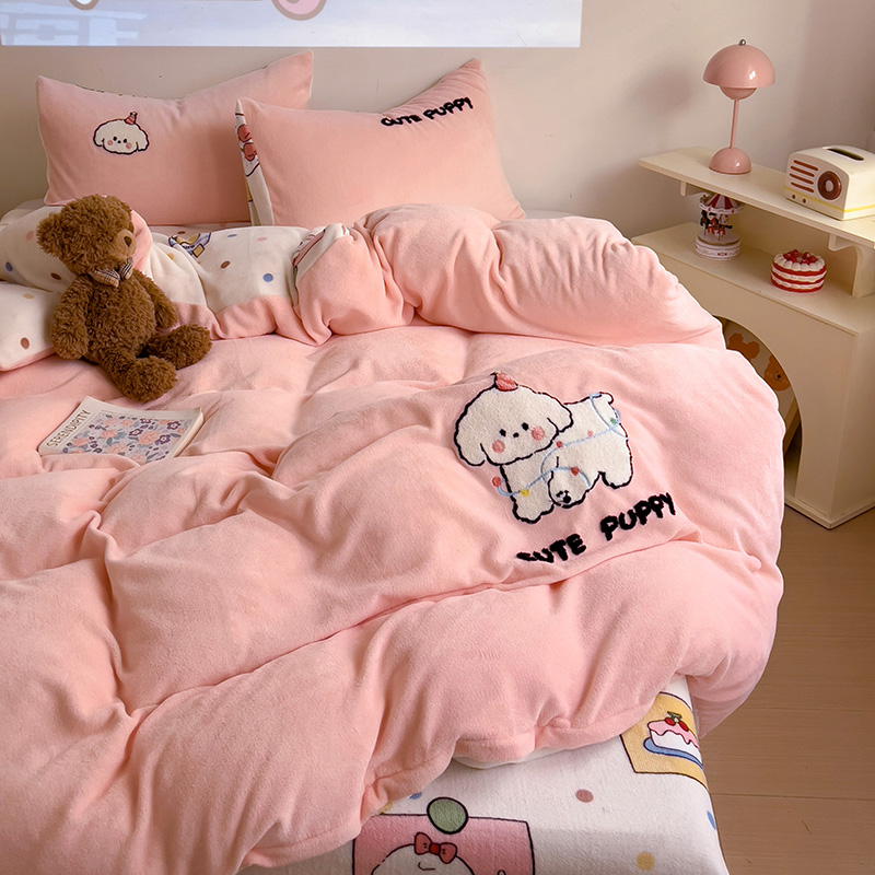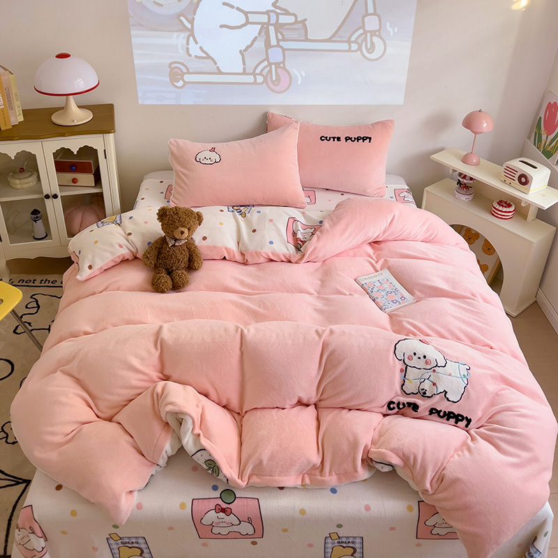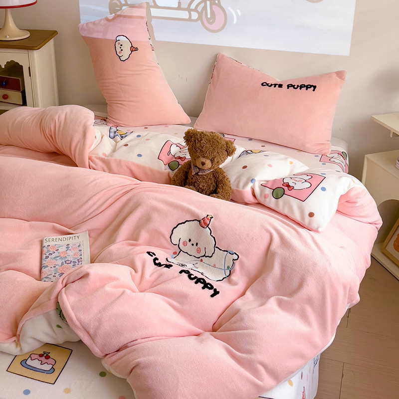 乐童家纺 2024新款高克重牛奶绒小清新印+绣系列四件套 可爱狗狗