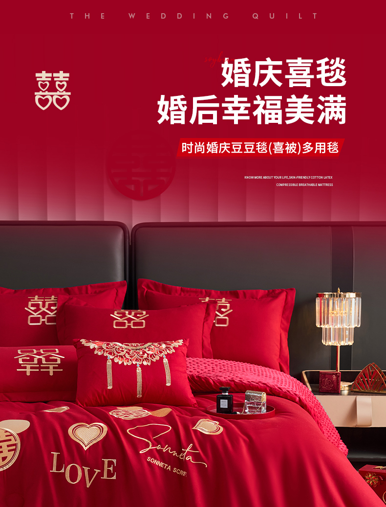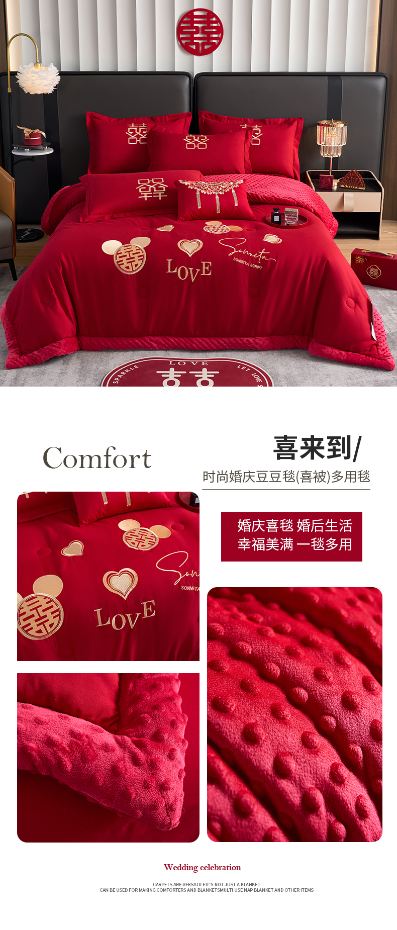 商品名称:玉雅家纺 2025新款婚庆两用豆豆被毛毯喜被婚庆被芯 婚庆被毯-喜来到
