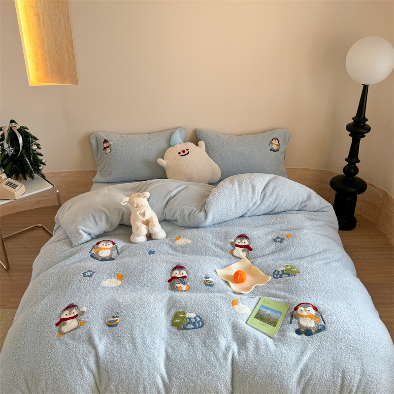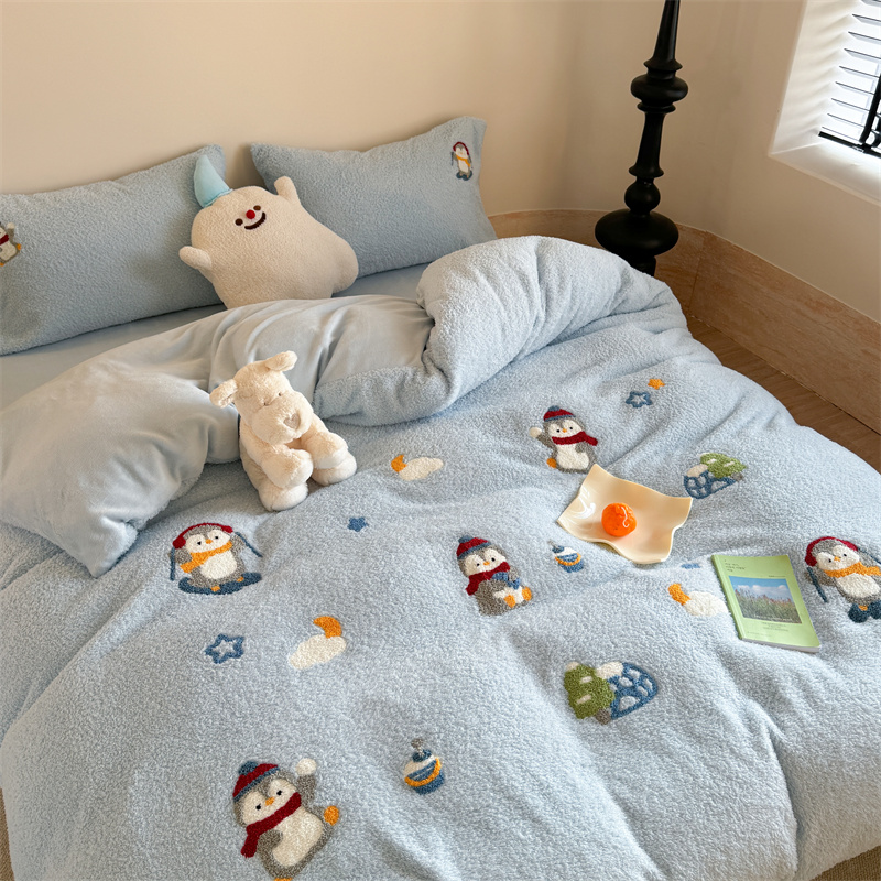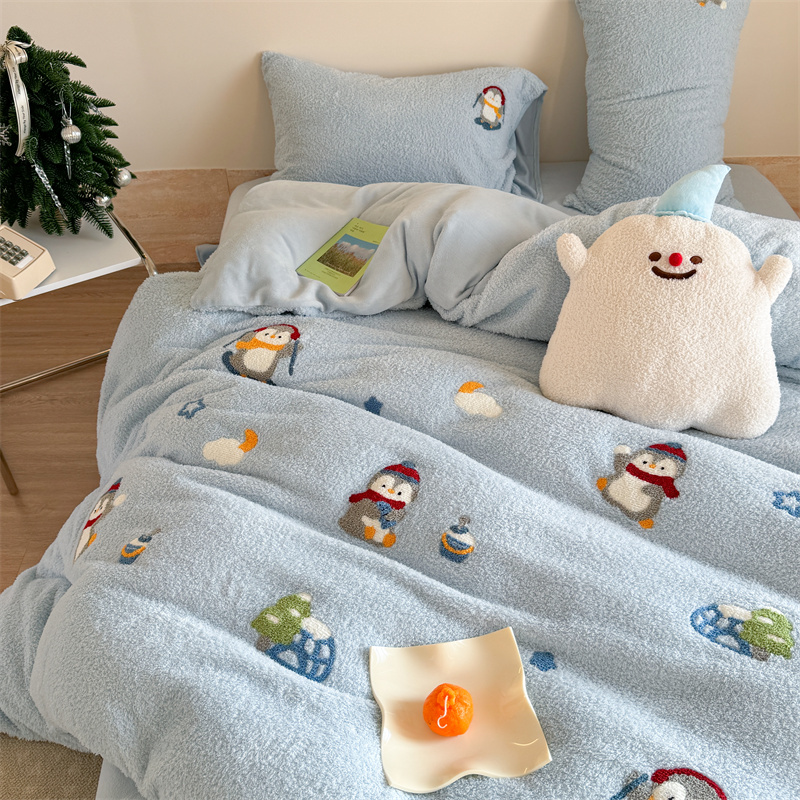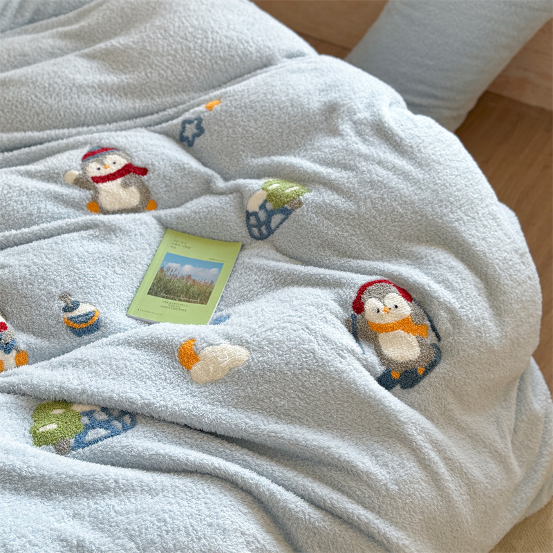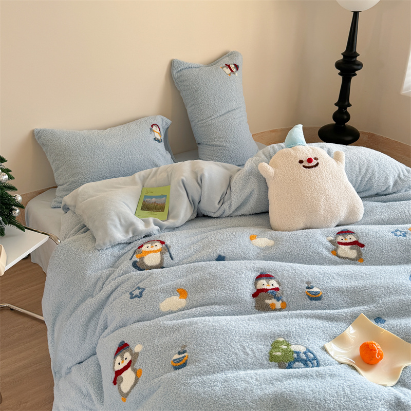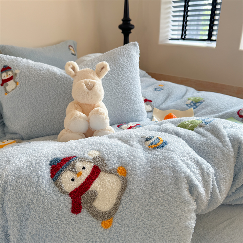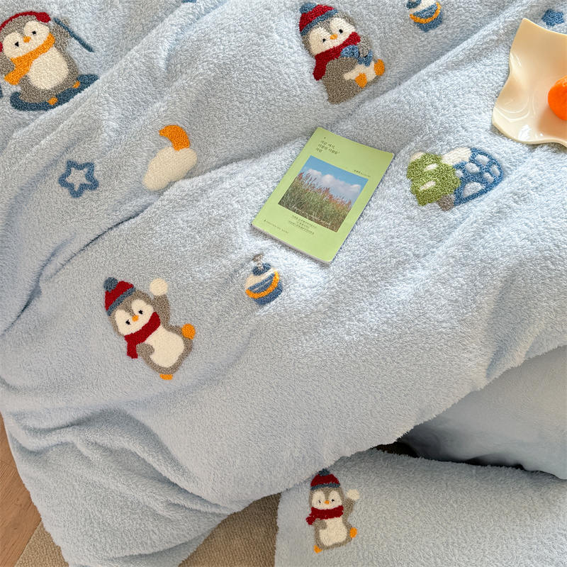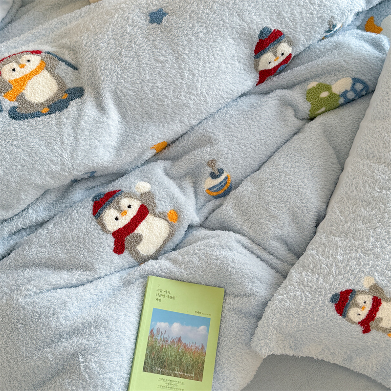 柚子YOUTH 2024新款双面泰迪绒毛巾绣四件套快乐企鹅