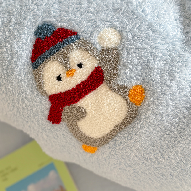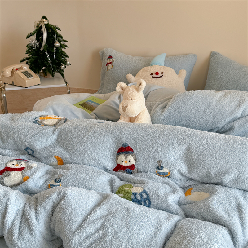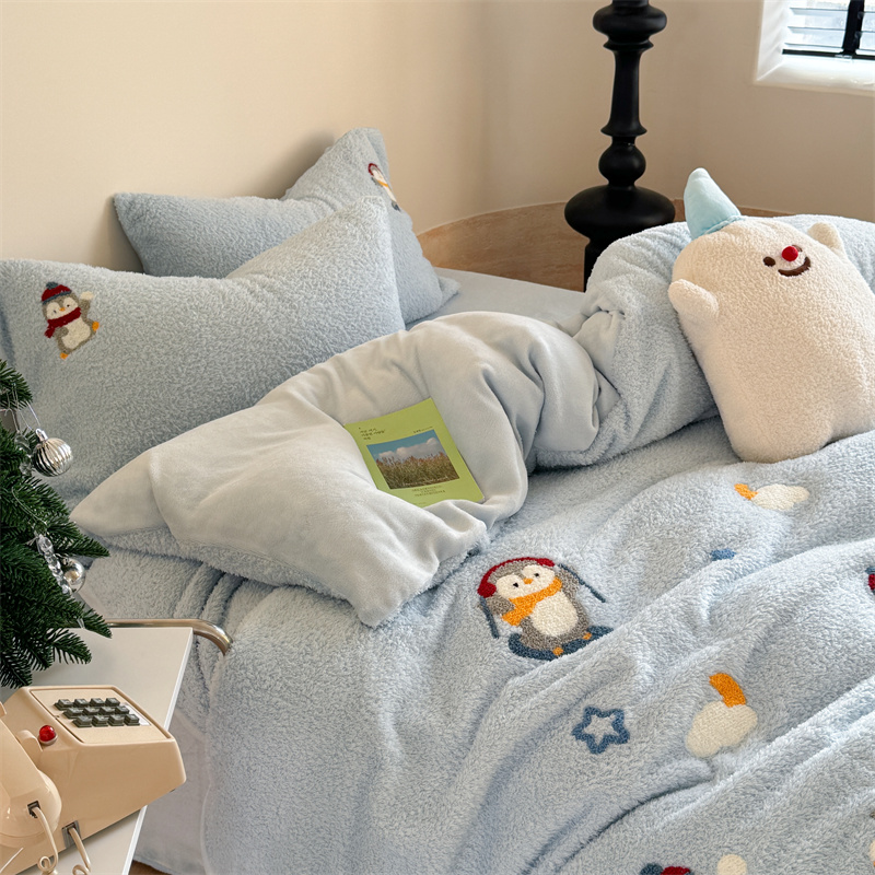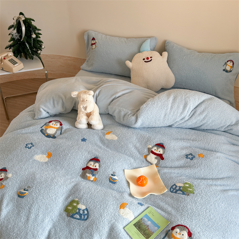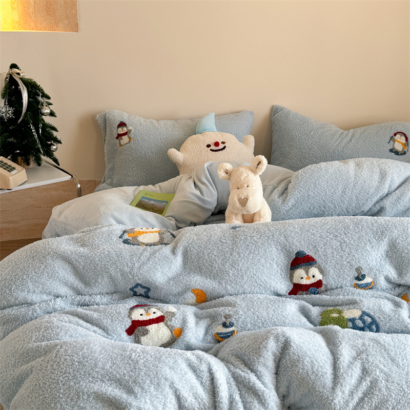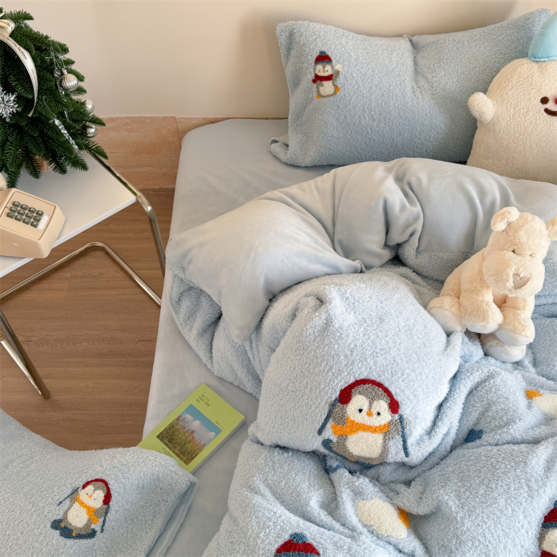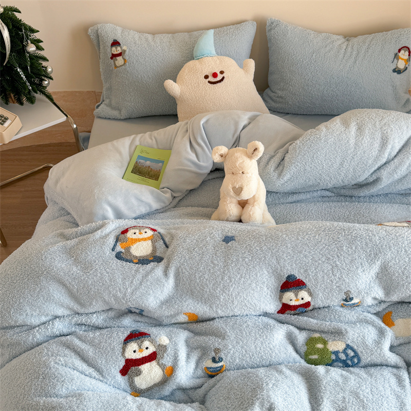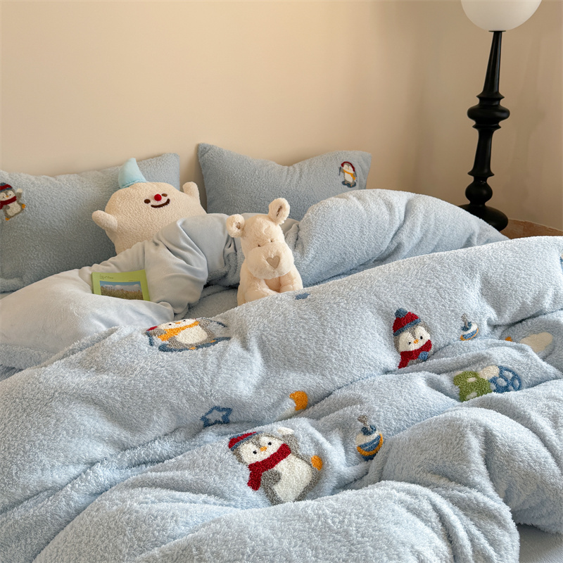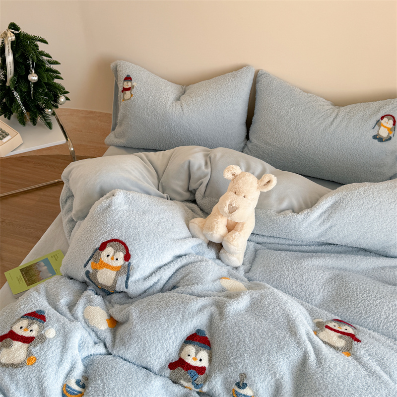 柚子YOUTH 2024新款双面泰迪绒毛巾绣四件套快乐企鹅