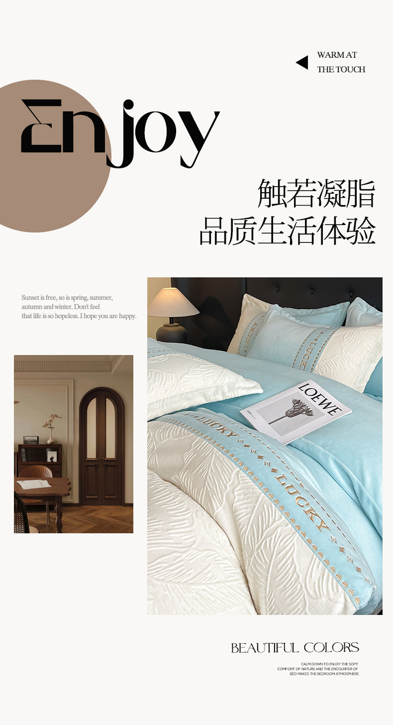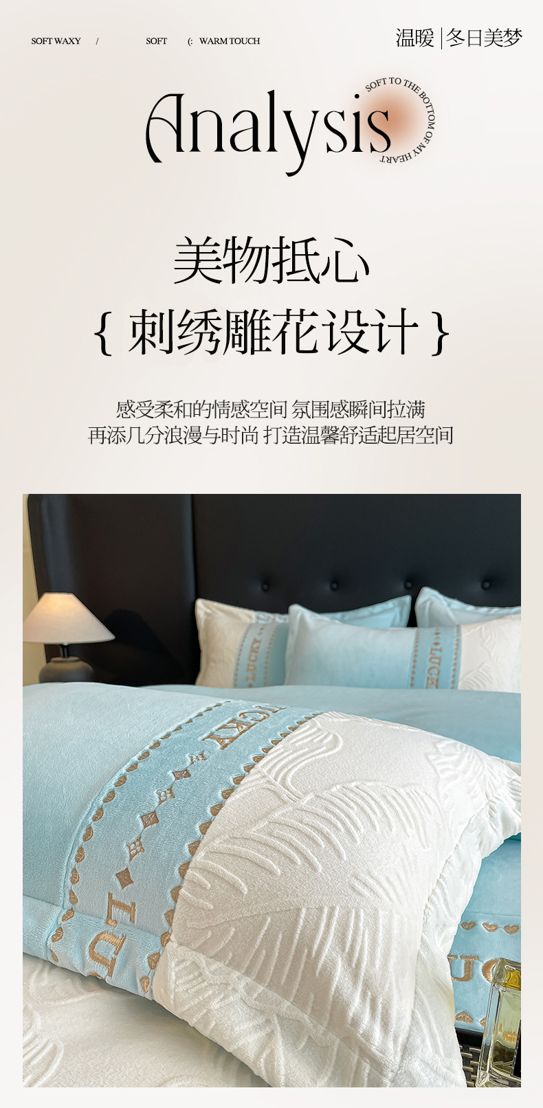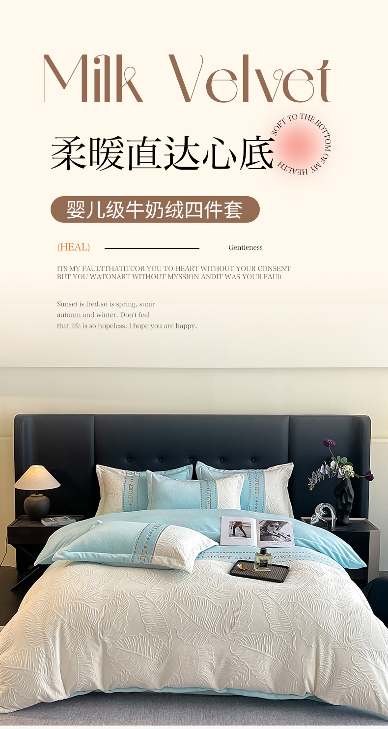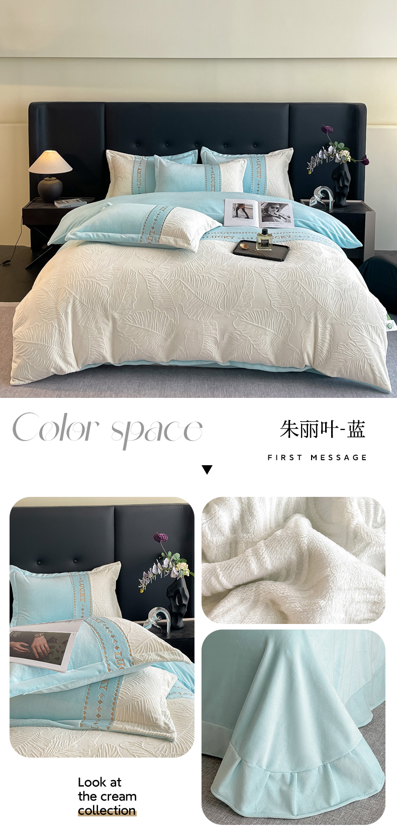 金窝窝家纺 2024新款婴儿级牛奶绒拼接刺绣烂花雕花绒四件套--朱丽叶系列 朱丽叶-蓝