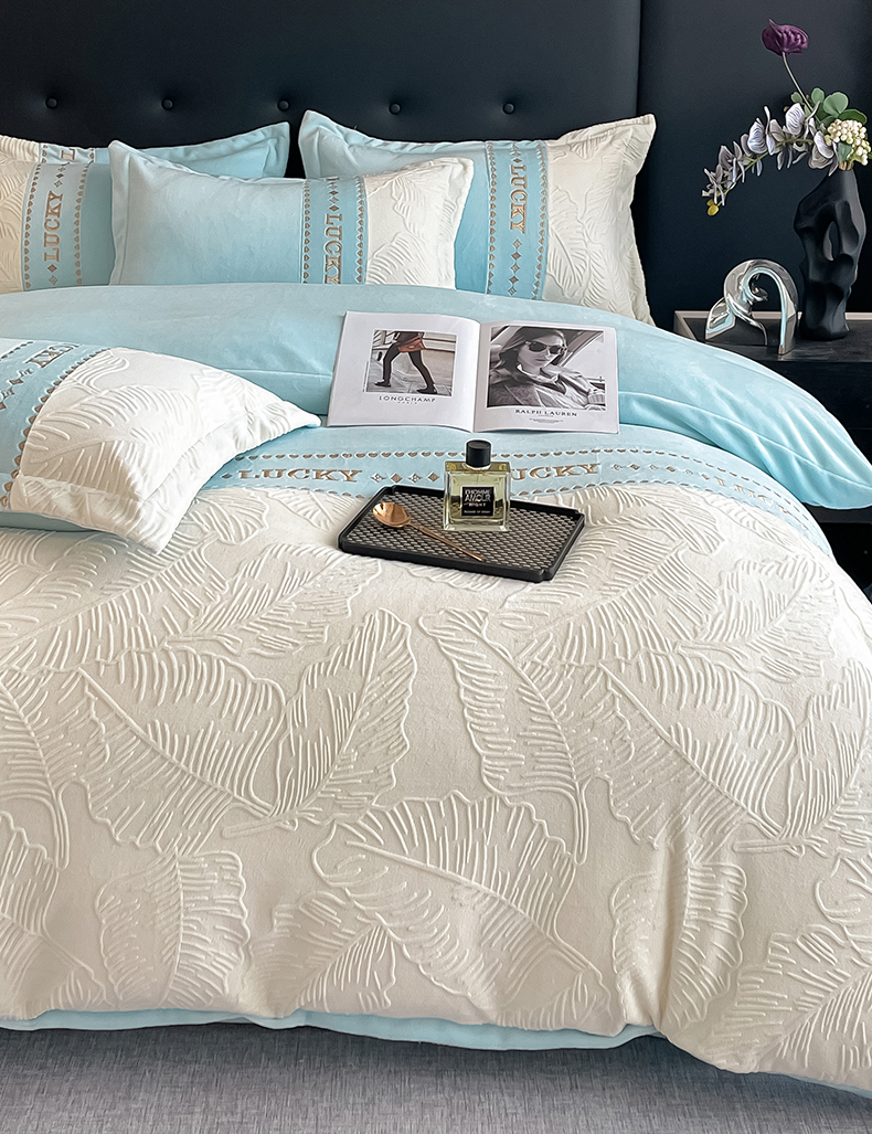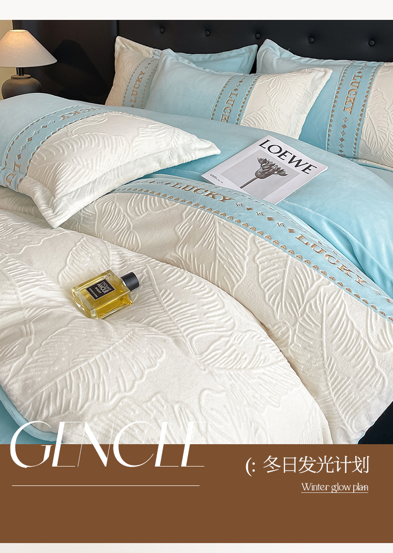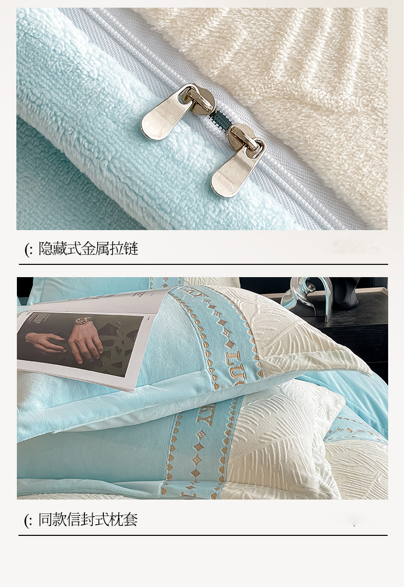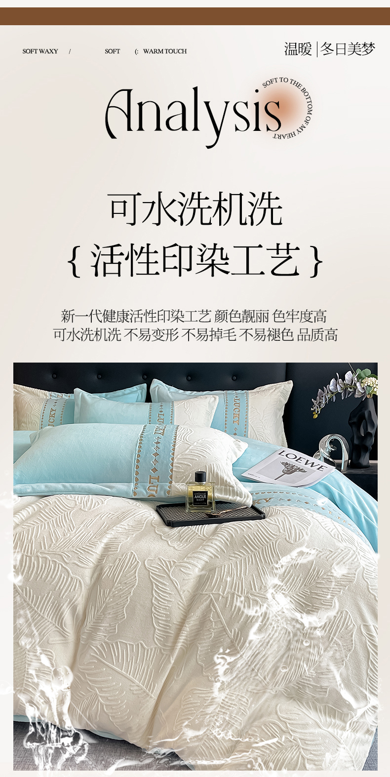 金窝窝家纺 2024新款婴儿级牛奶绒拼接刺绣烂花雕花绒四件套--朱丽叶系列 朱丽叶-蓝