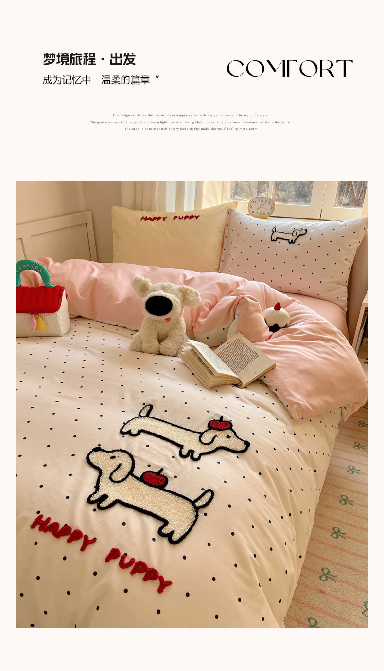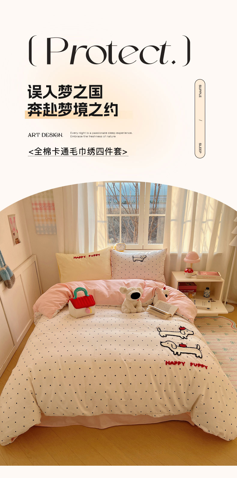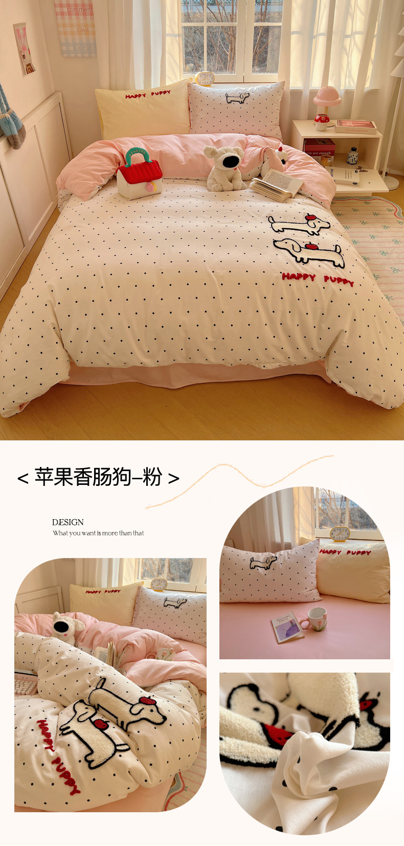 丽涵家纺 2025新款全棉印花毛巾绣卡通四件套 苹果香肠狗-粉