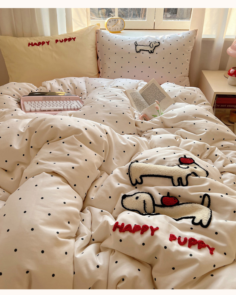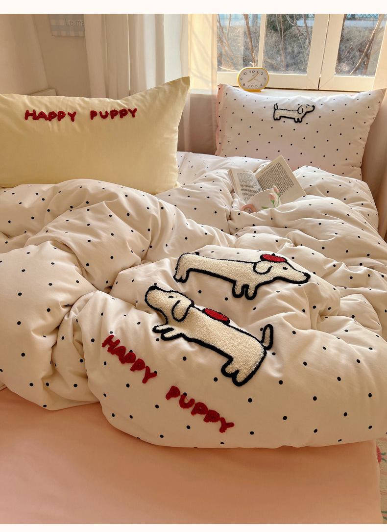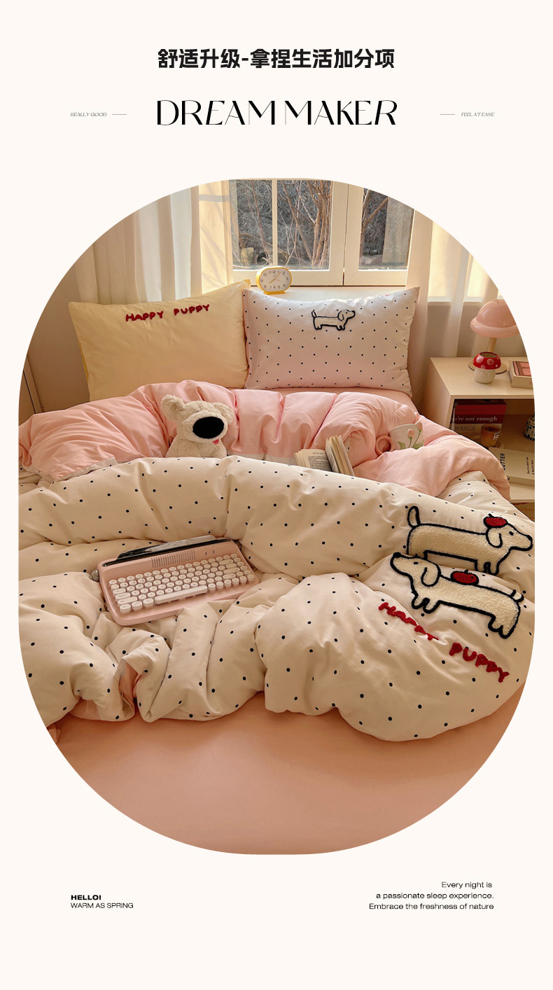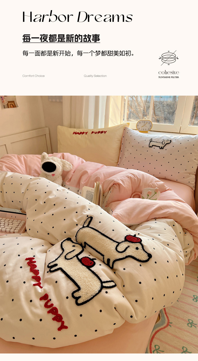 丽涵家纺 2025新款全棉印花毛巾绣卡通四件套 苹果香肠狗-粉