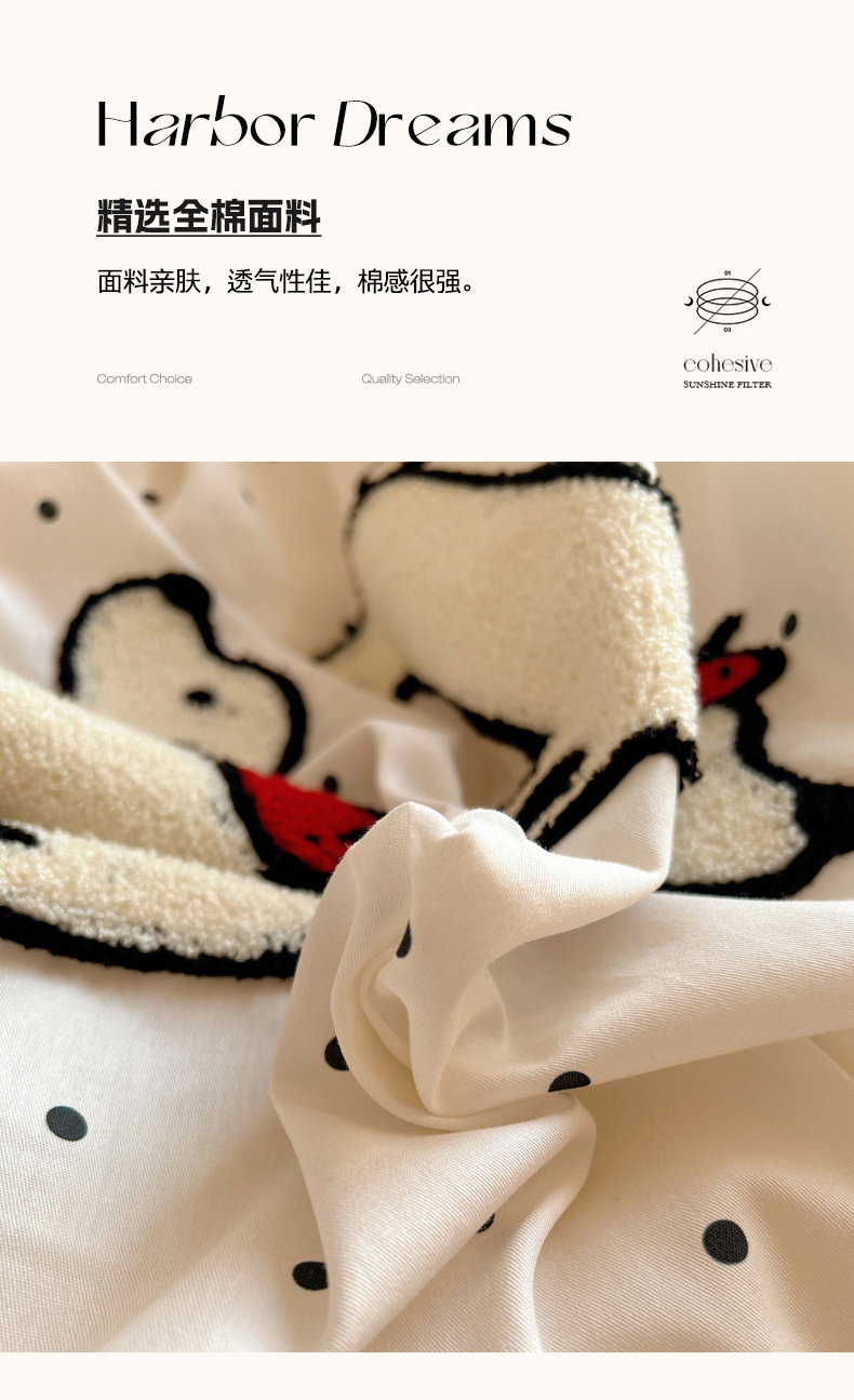商品名称:丽涵家纺 2025新款全棉印花毛巾绣卡通四件套 苹果香肠狗-粉