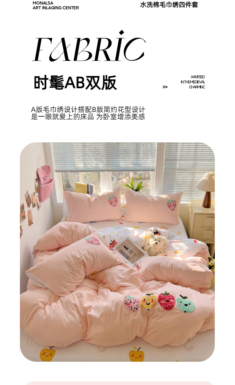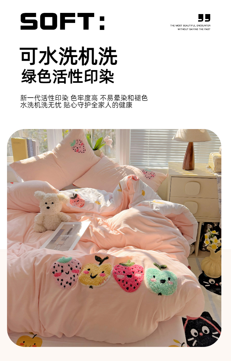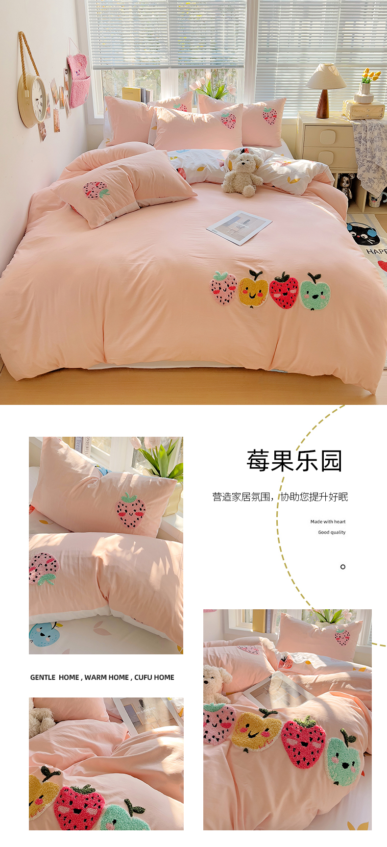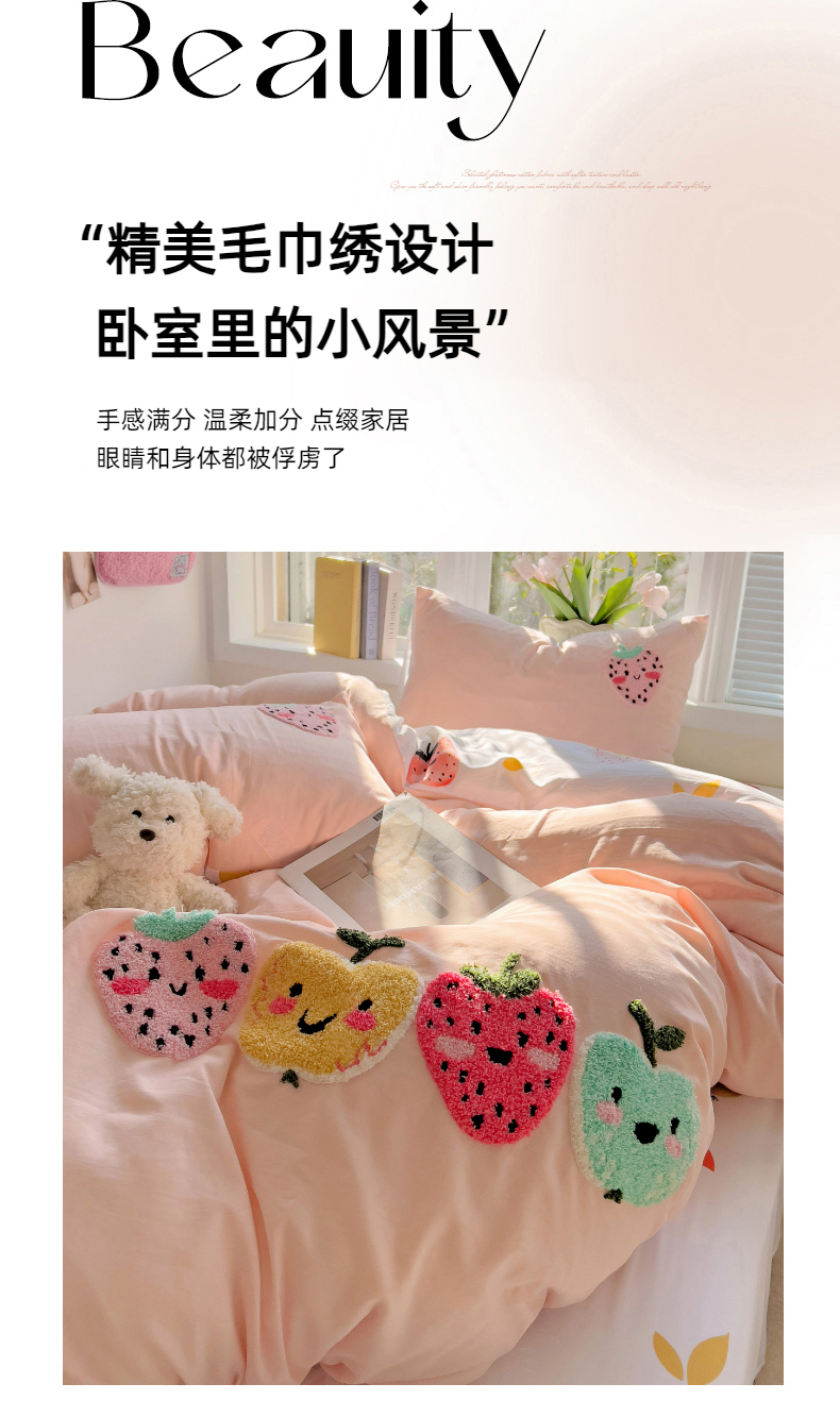 当前位置: 91家纺网 > 商品网购 > 床品套件 > 四件套 > 水洗棉四件套 > 凯洛奇 2025新款1卡通水洗棉印+绣毛巾绣四件套 莓果乐园