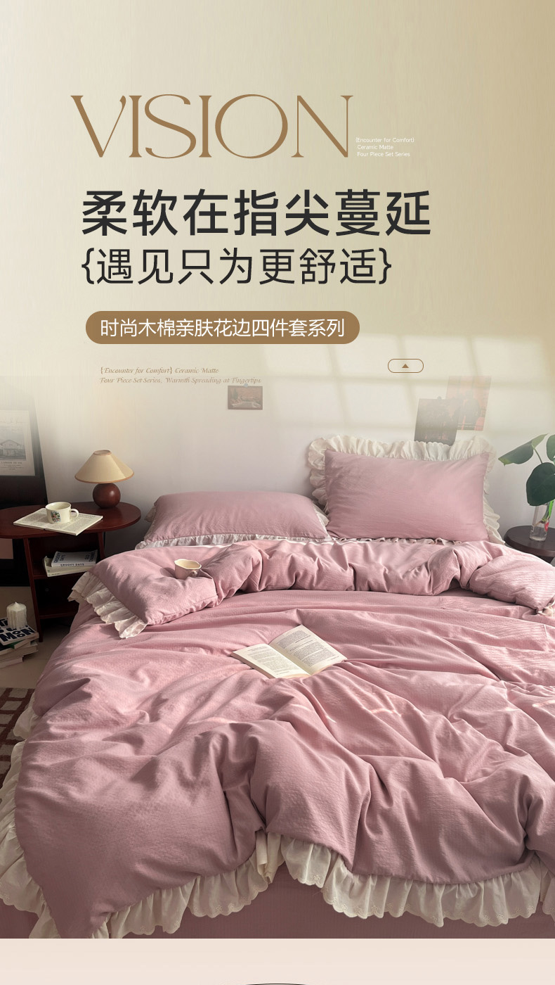 (总)慕澄家纺 2022新款华夫格雪纺花边四件套,湖水绿,魅惑紫,奶白色,奶黄色,浅豆沙,情调灰,天空蓝,樱花粉