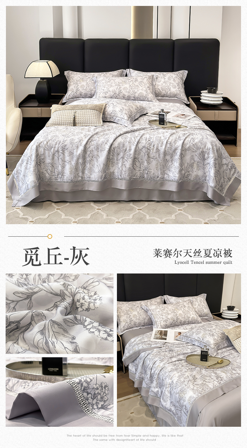 商品名称:娇逸家居 2025新款50支印花莱赛尔天丝夏被镂空款花边夏凉被 觅丘-灰