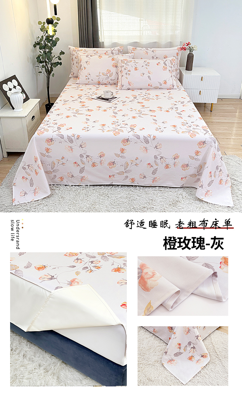 伊而梦蚊帐 2025新款A类老粗布抗菌床单 橙玫瑰-灰