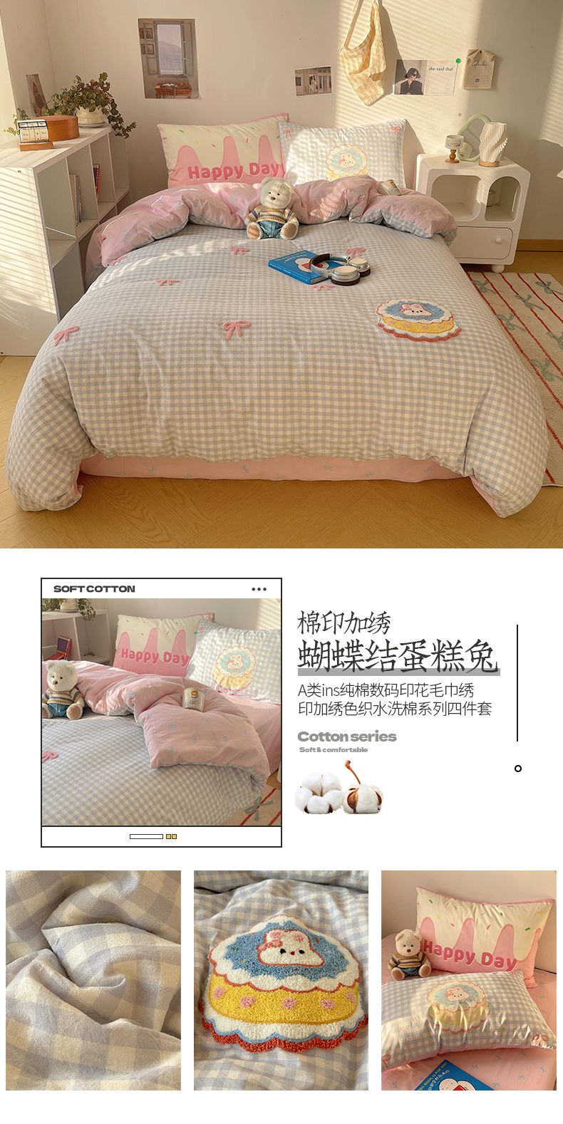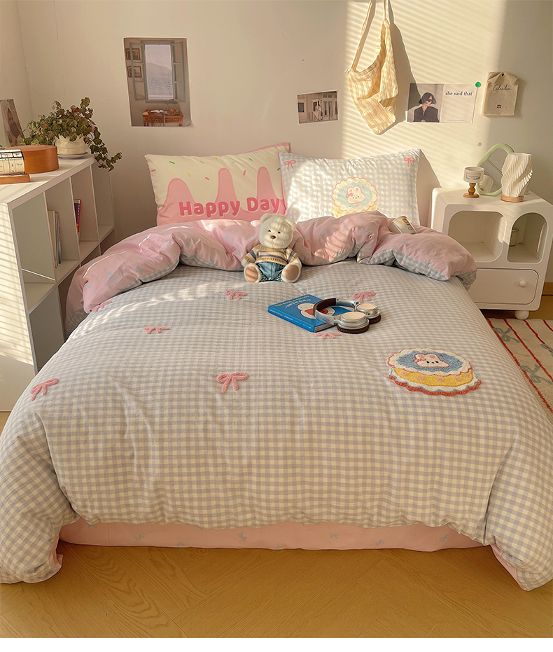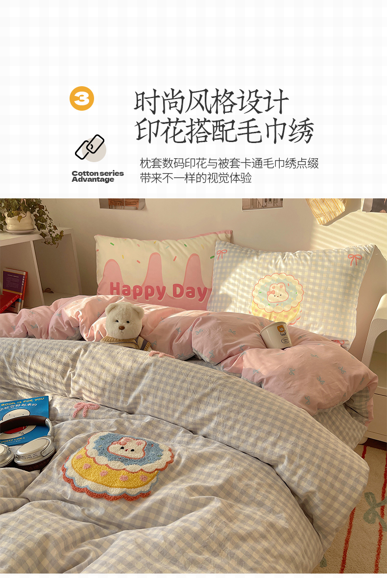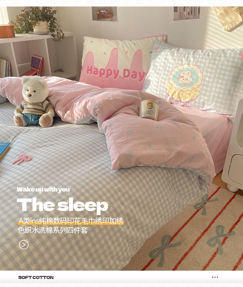 当前位置: 91家纺网 > 商品网购 > 床品套件 > 四件套 > 全棉普通四件套 > 桃子家居2025新款A类ins纯棉数码印花毛巾绣印加绣色织水洗棉系列四件套 棉印加绣-蝴蝶结蛋糕兔