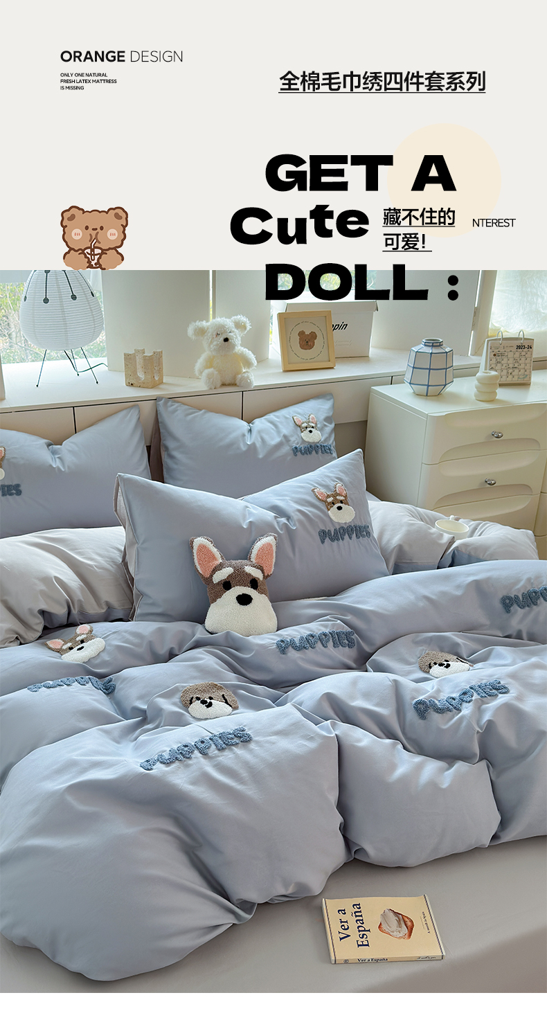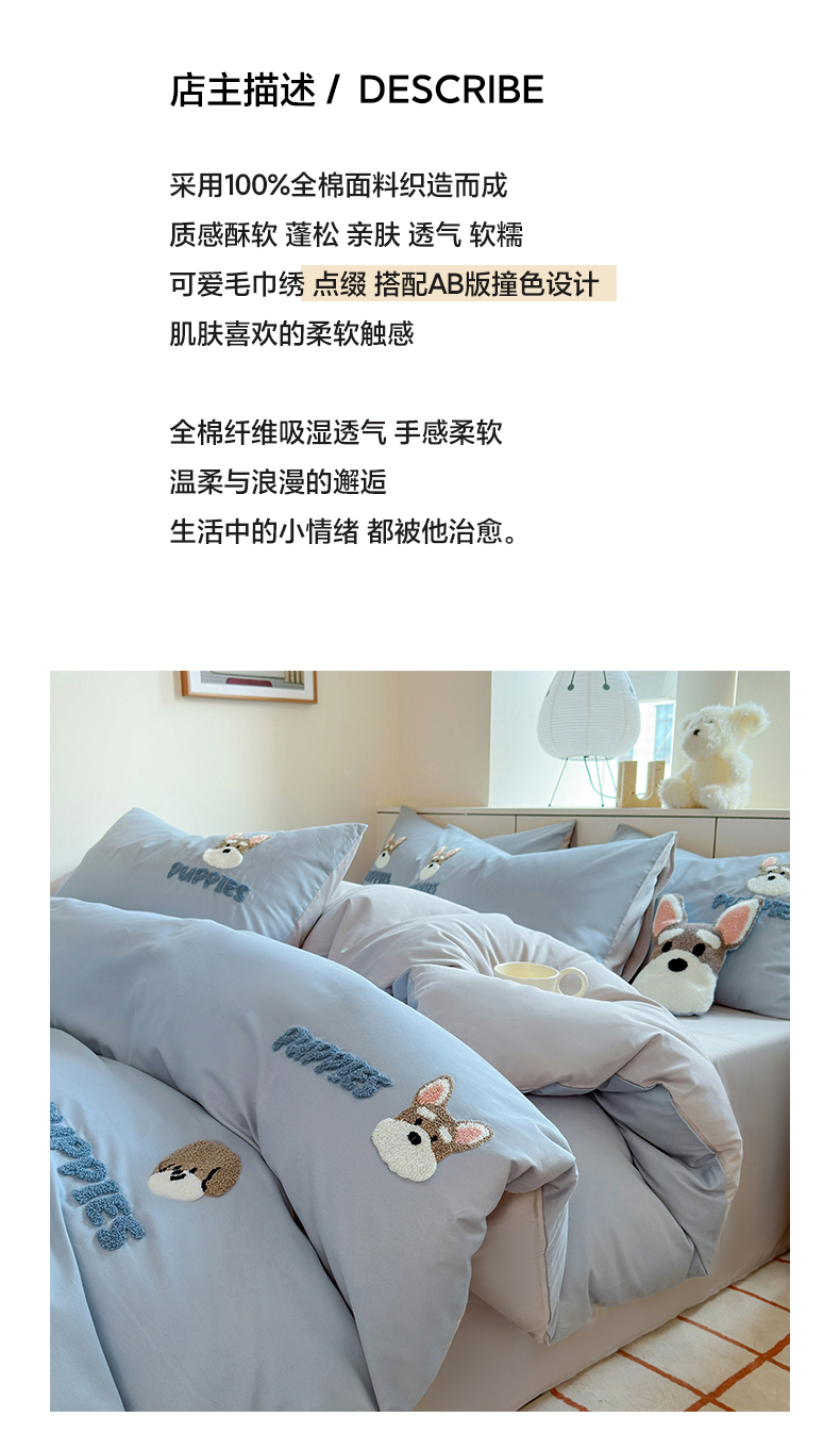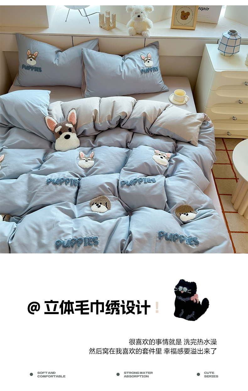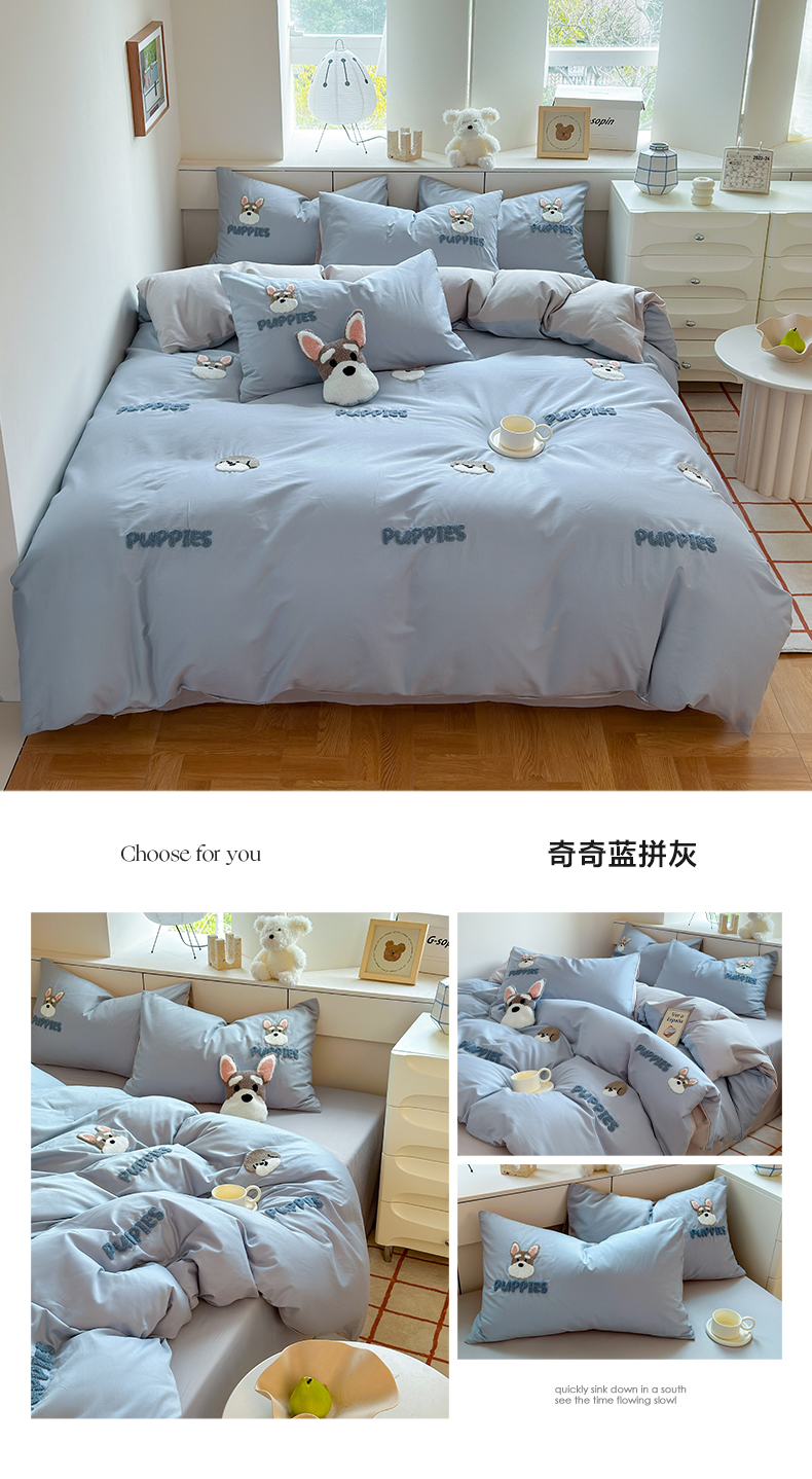 当前位置: 91家纺网 > 商品网购 > 床品套件 > 四件套 > 全棉普通四件套 > 莱登卡奴 2025新款A类全棉13372毛巾绣四件套 奇奇蓝拼灰