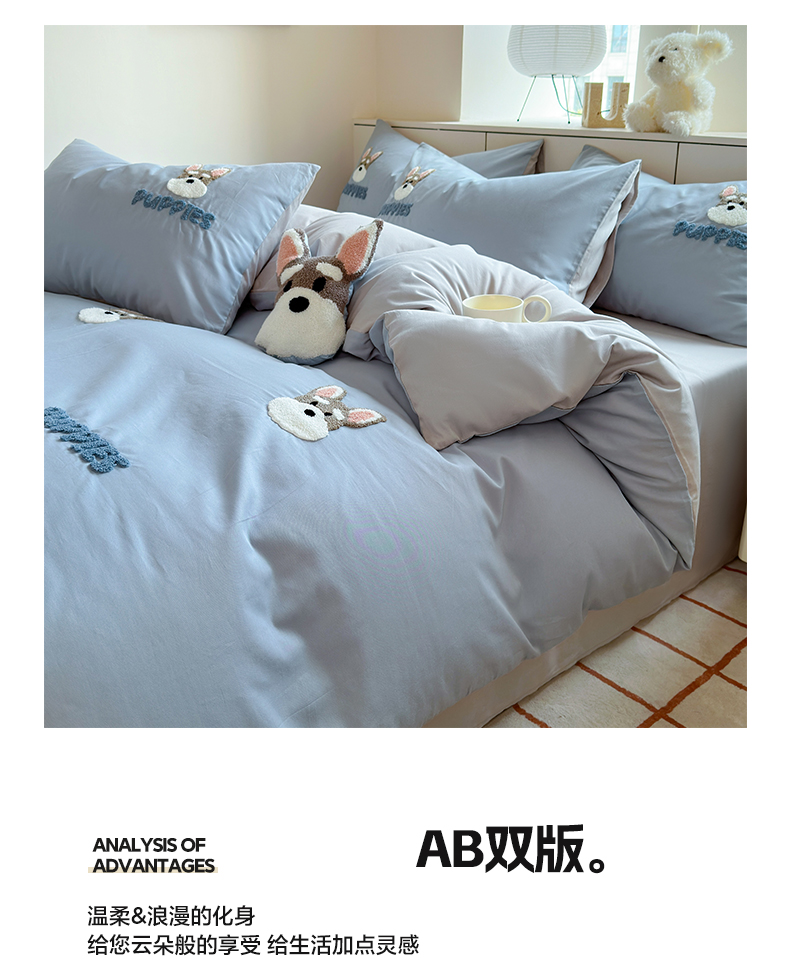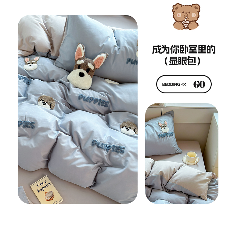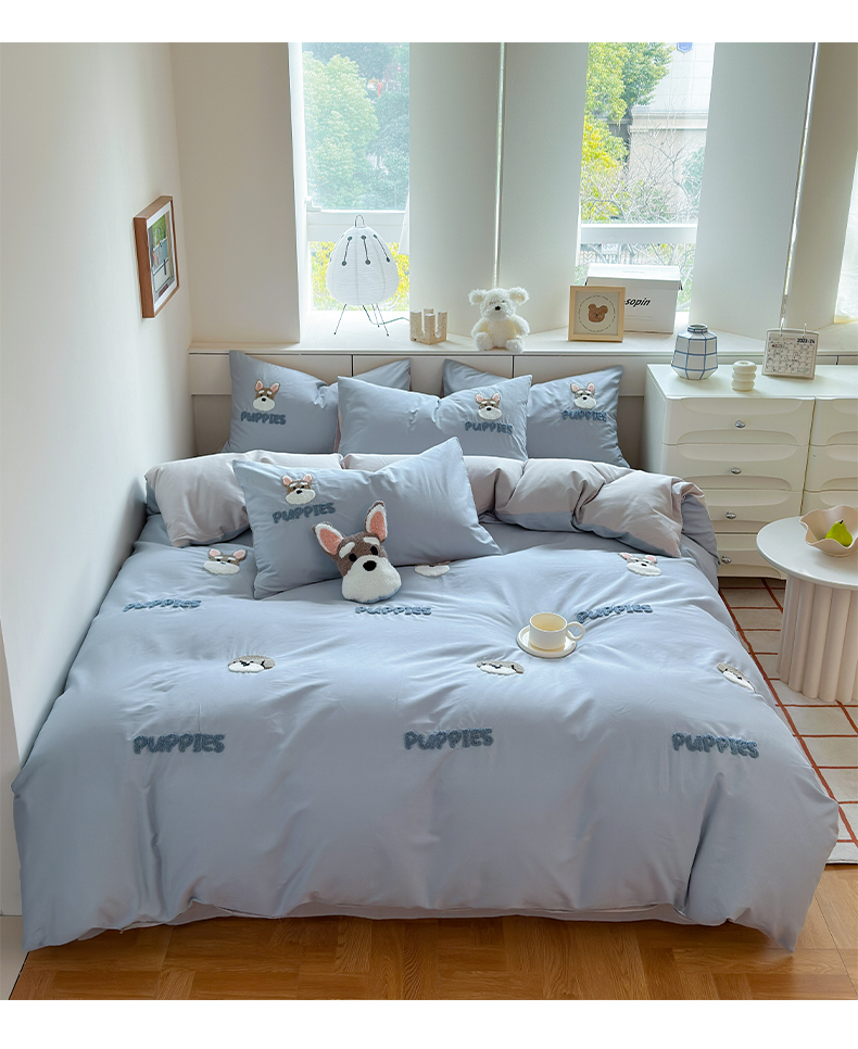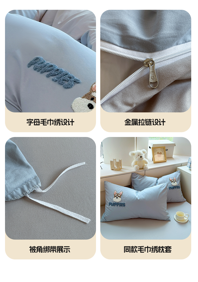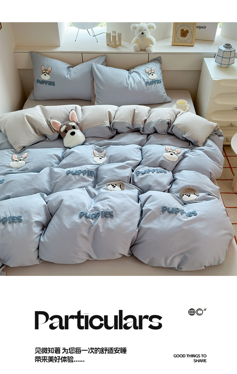 当前位置: 91家纺网 > 商品网购 > 床品套件 > 四件套 > 全棉普通四件套 > 莱登卡奴 2025新款A类全棉13372毛巾绣四件套 奇奇蓝拼灰
