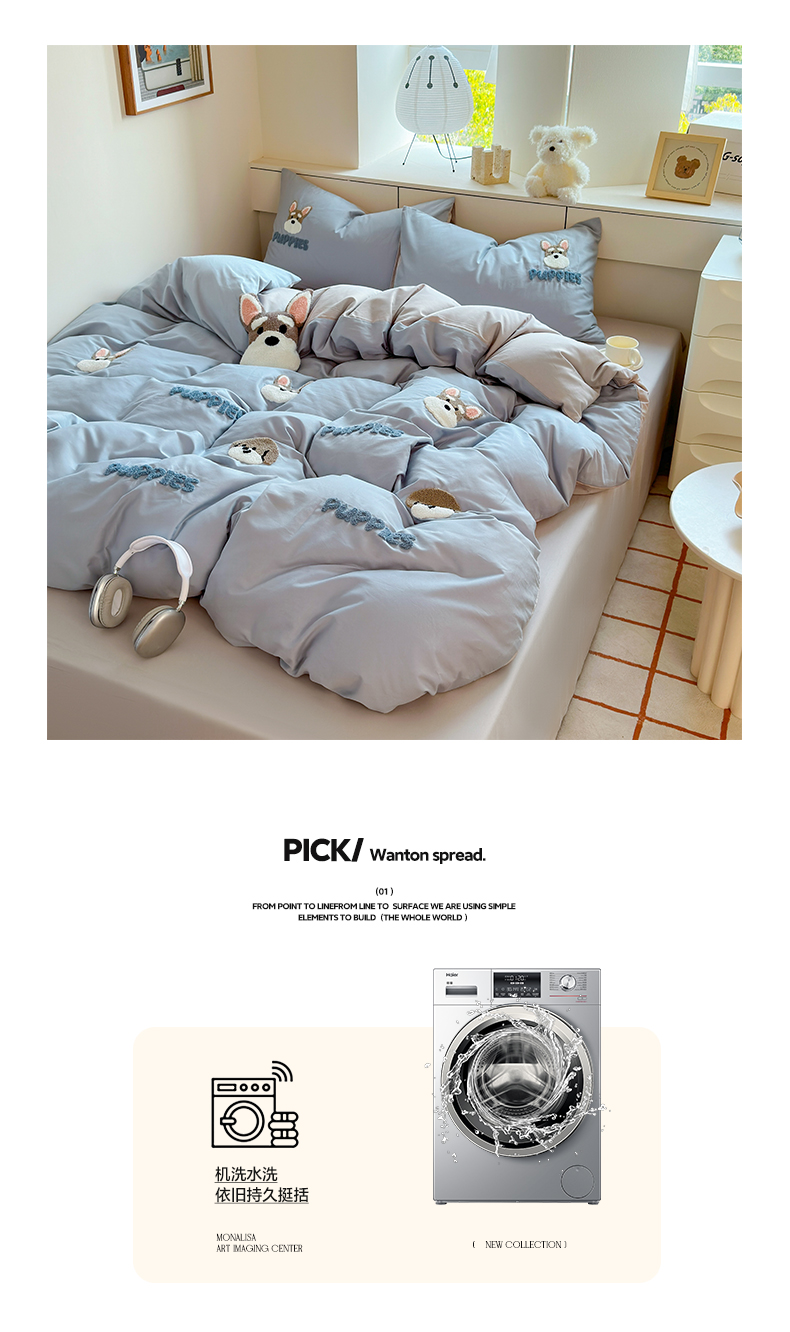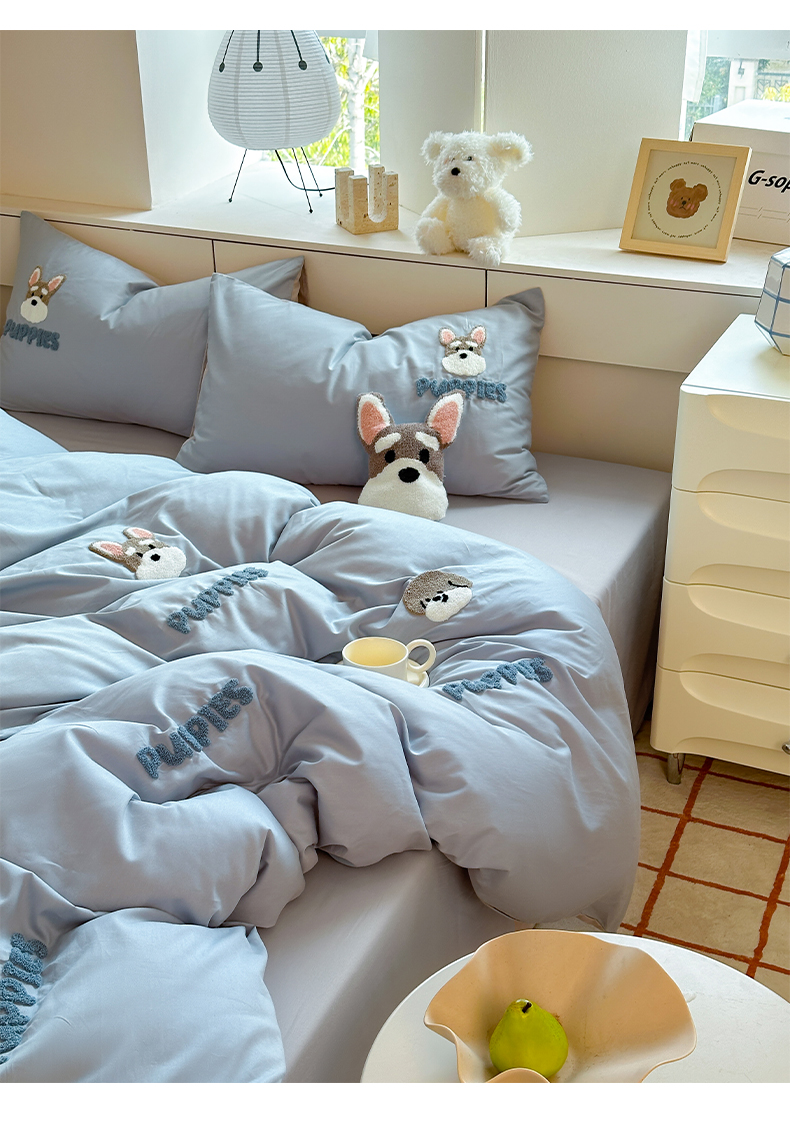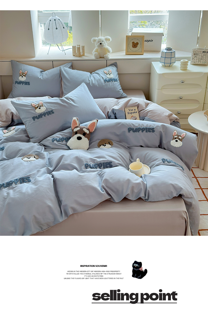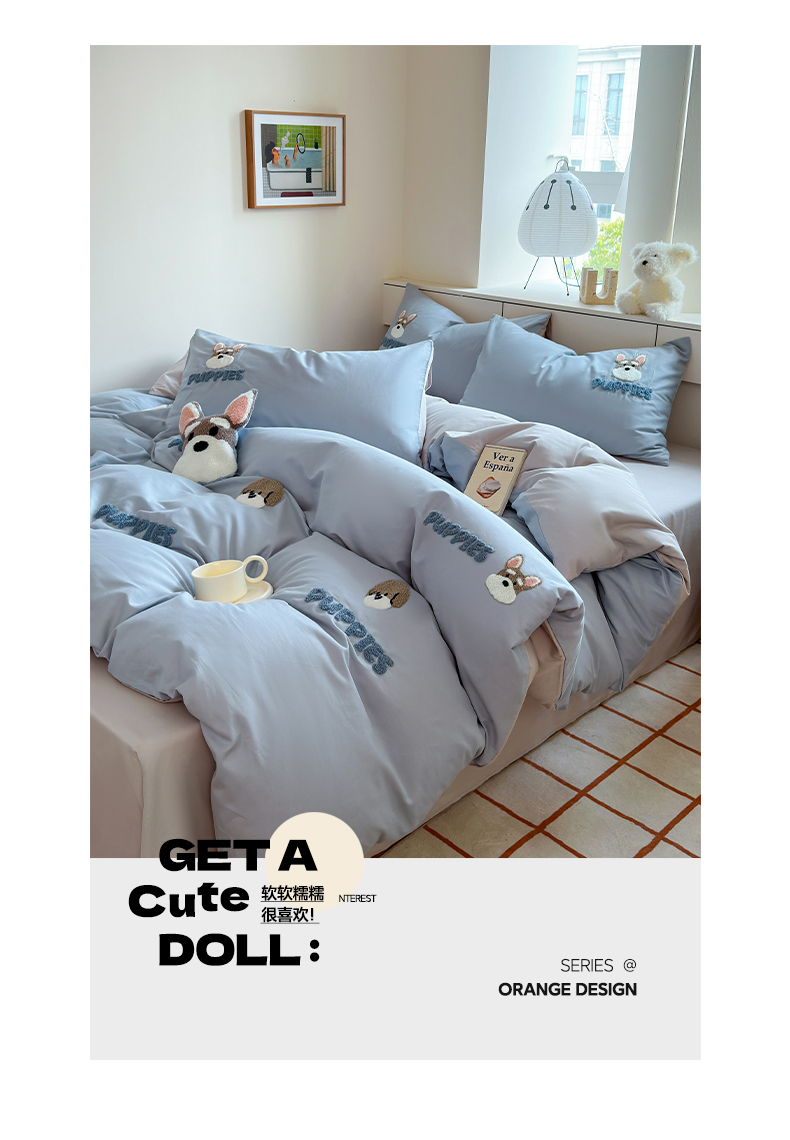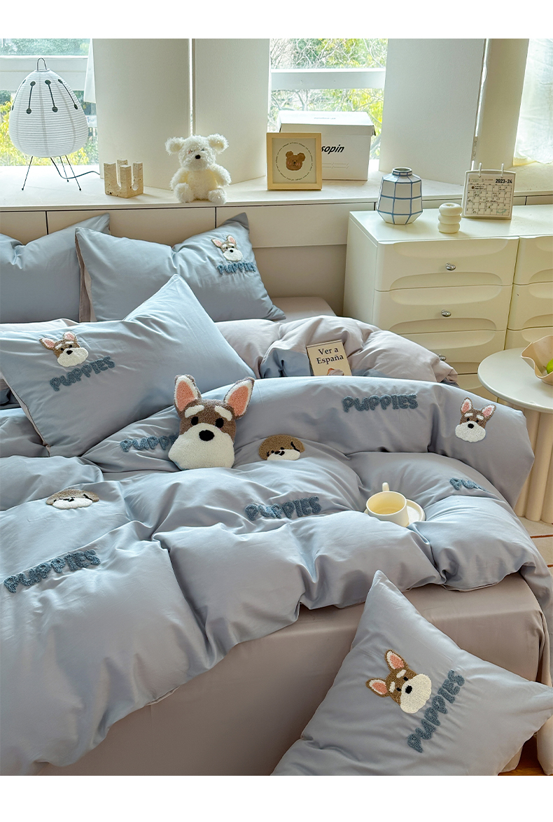当前位置: 91家纺网 > 商品网购 > 床品套件 > 四件套 > 全棉普通四件套 > 莱登卡奴 2025新款A类全棉13372毛巾绣四件套 奇奇蓝拼灰