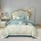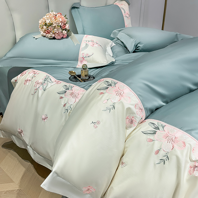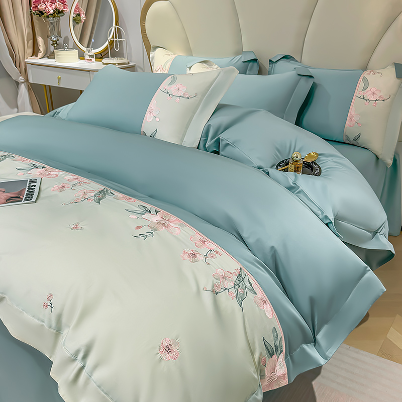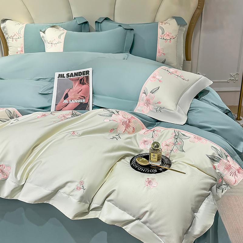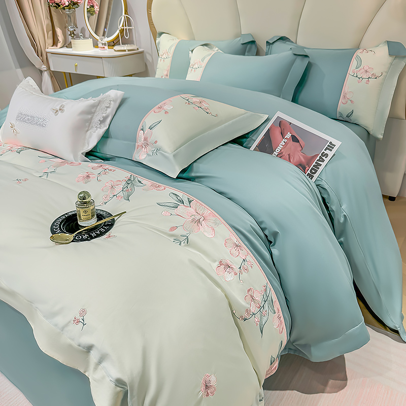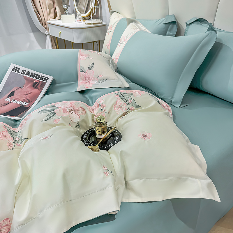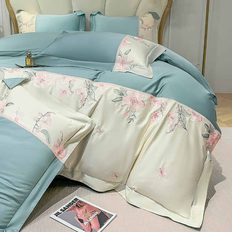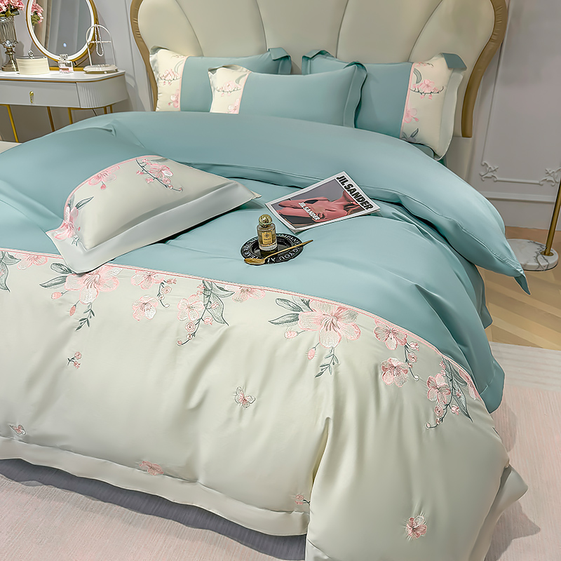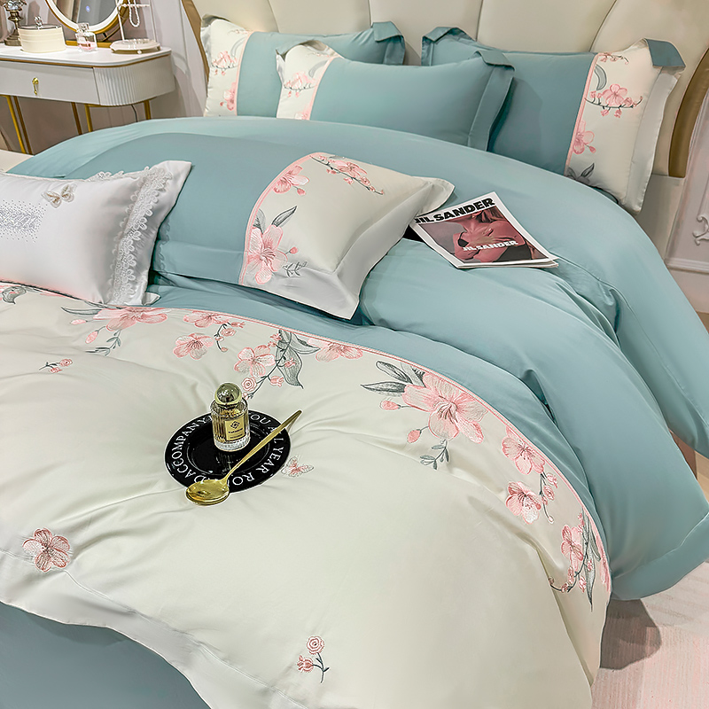 宅家居 2025轻奢法式小香风双面纯棉刺绣拼接款长绒棉四件套-樱花恋 松石绿