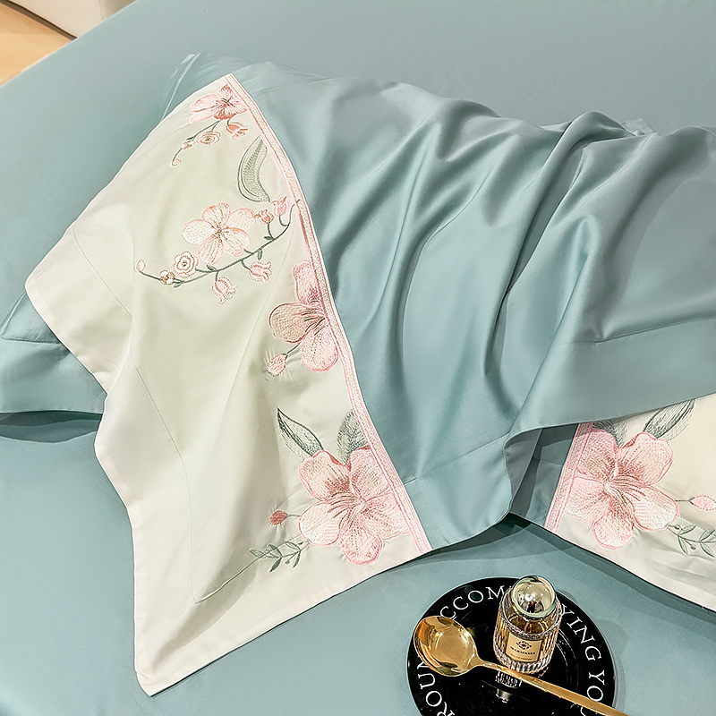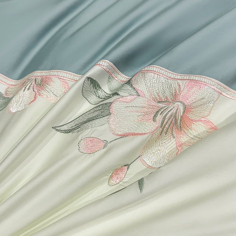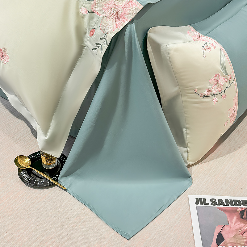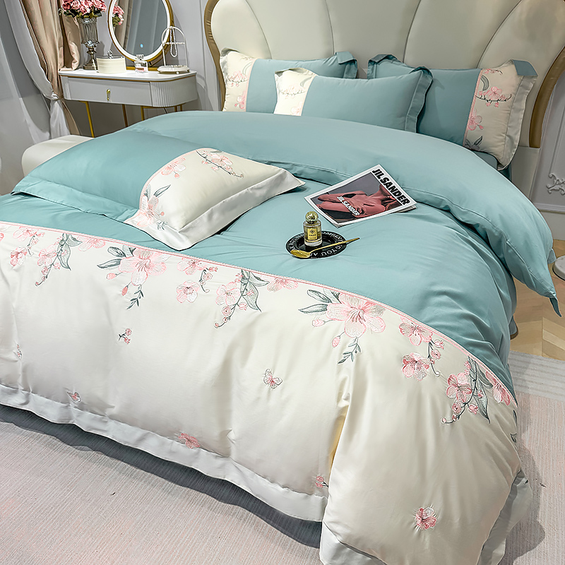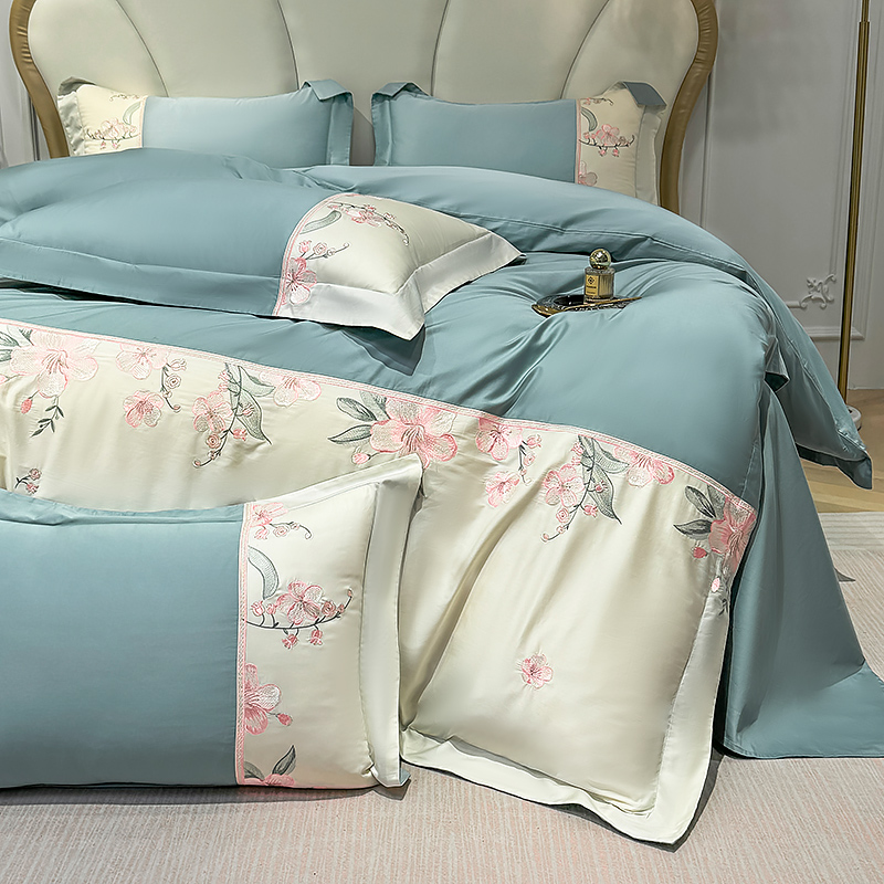 商品名称:宅家居 2025轻奢法式小香风双面纯棉刺绣拼接款长绒棉四件套-樱花恋 松石绿
