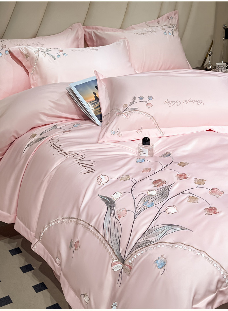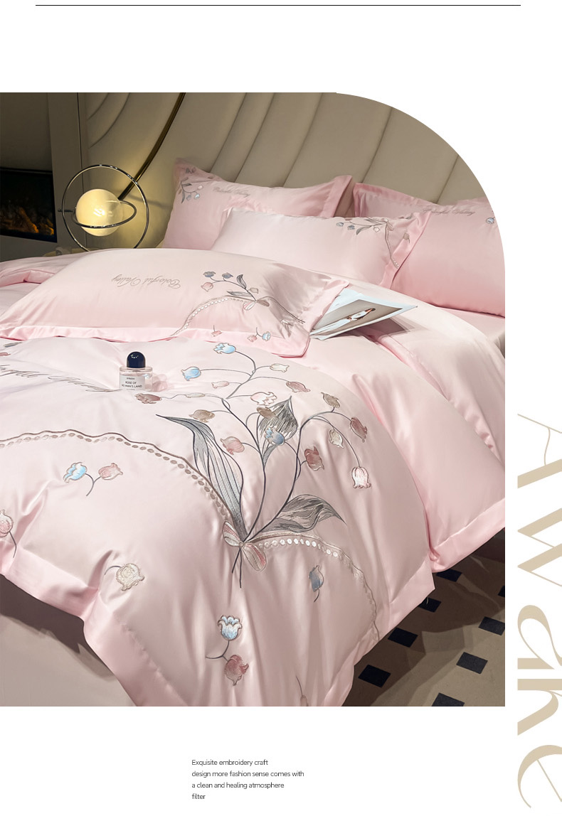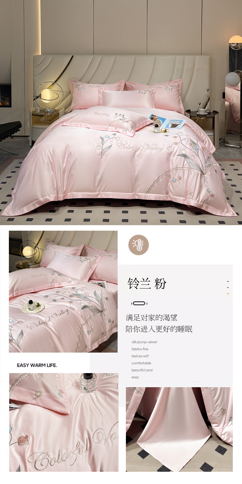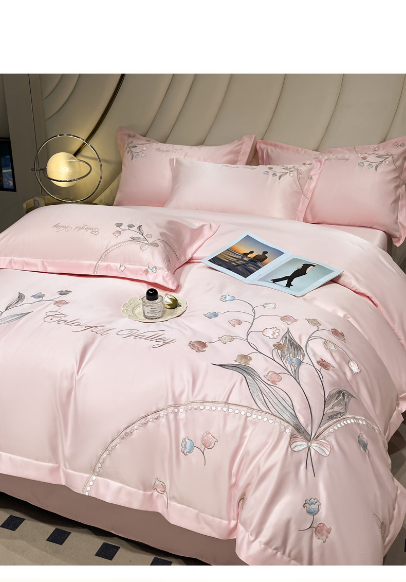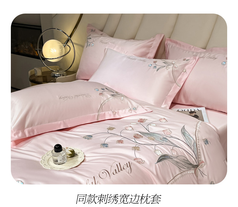 菲儿家纺 2025新款轻奢简约冰丝刺绣四件套-铃兰 铃兰-粉