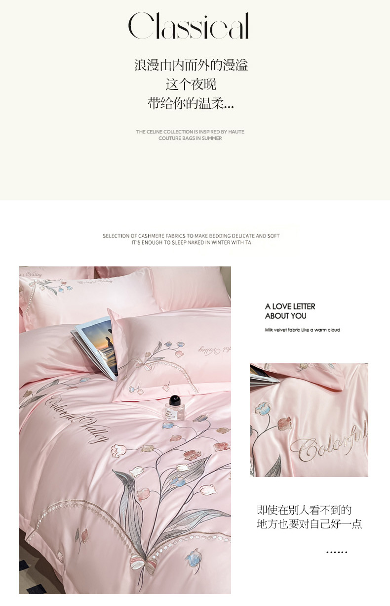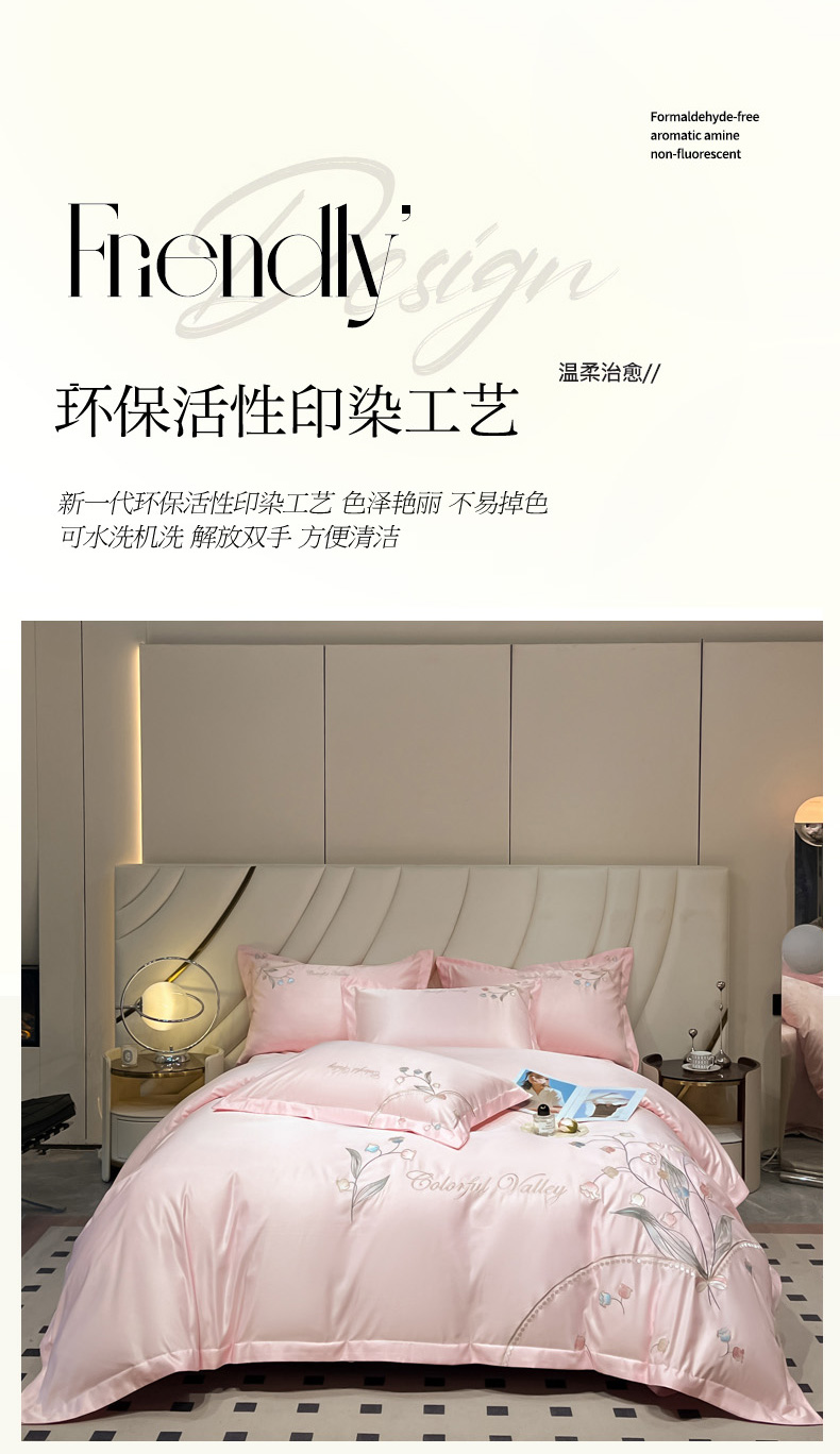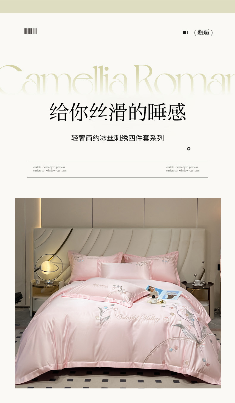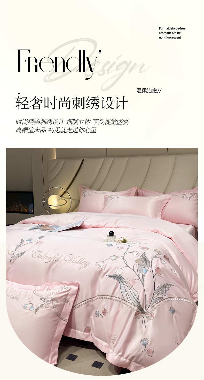菲儿家纺 2025新款轻奢简约冰丝刺绣四件套-铃兰 铃兰-粉