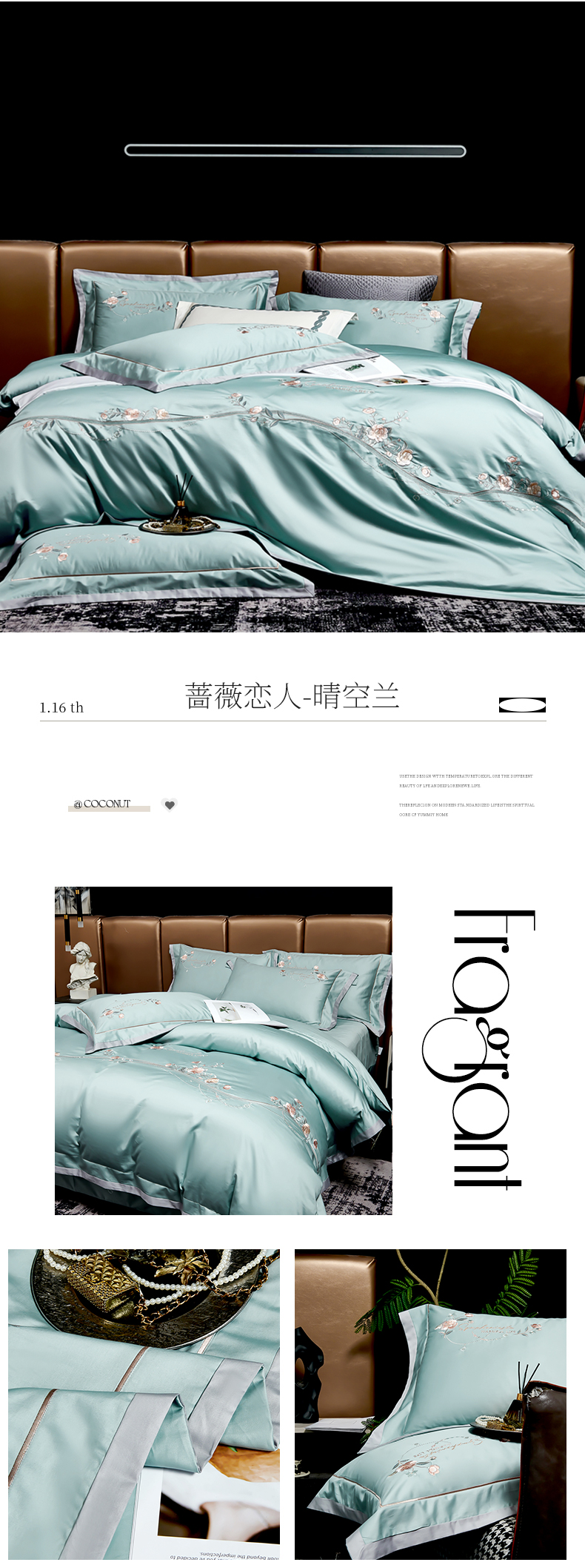 商品名称:U品汇 2025新品120支60s双股贡缎长绒棉重工刺绣花纯棉全棉四件套 蔷薇恋人-晴空兰