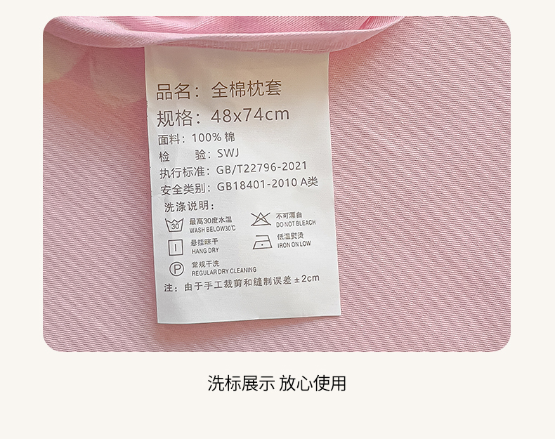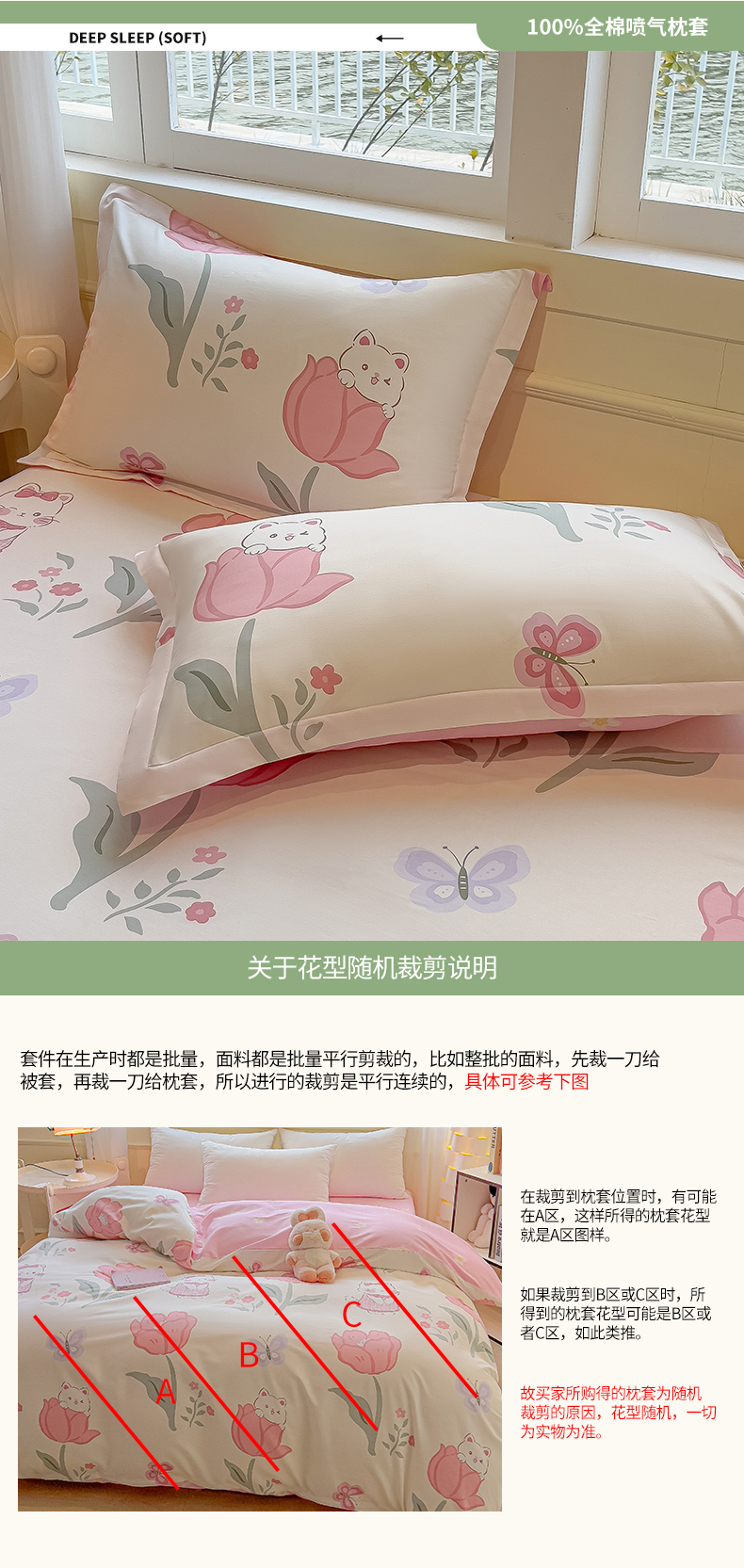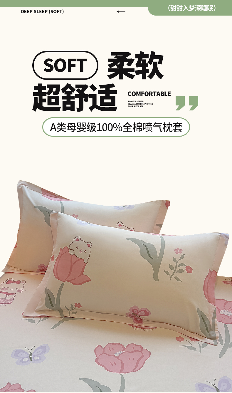商品名称:拾物记 2025新款A类无荧光全喷气全棉12868单枕套 花欣猫趣-粉