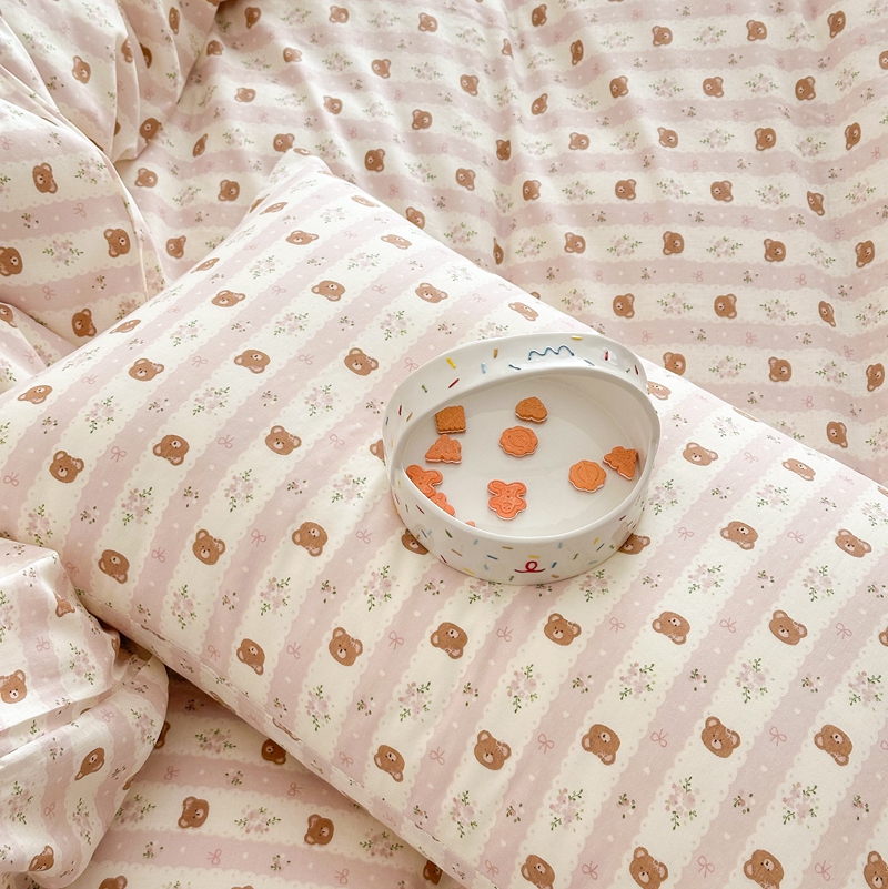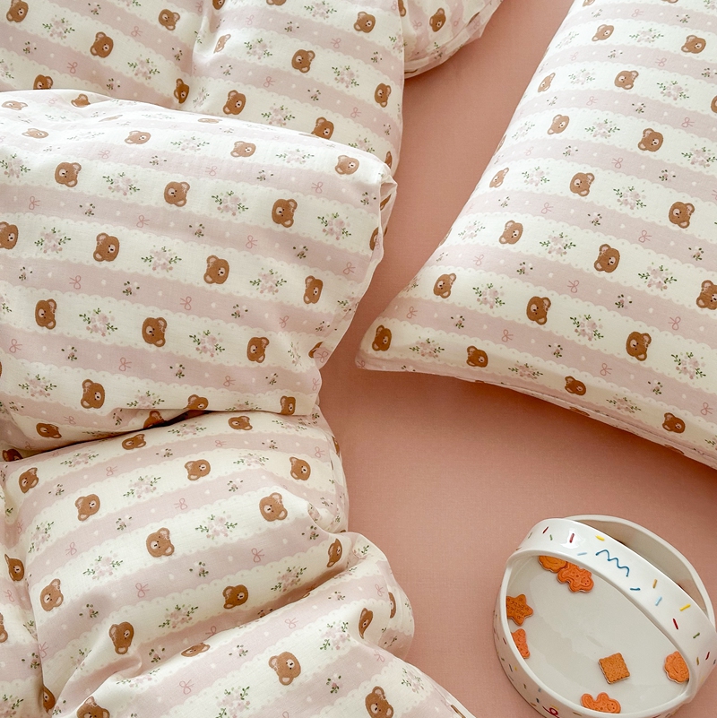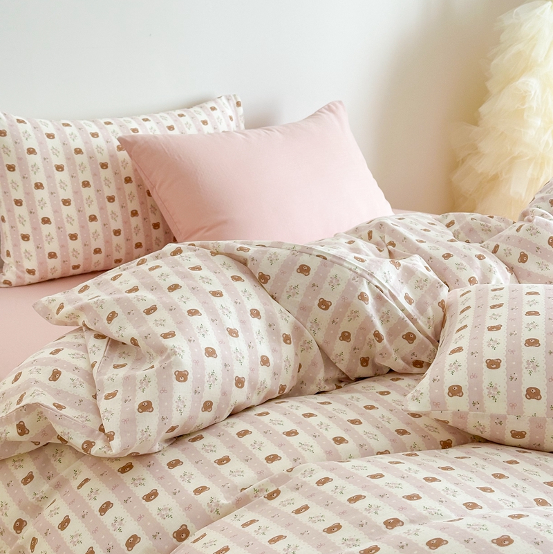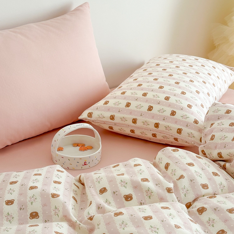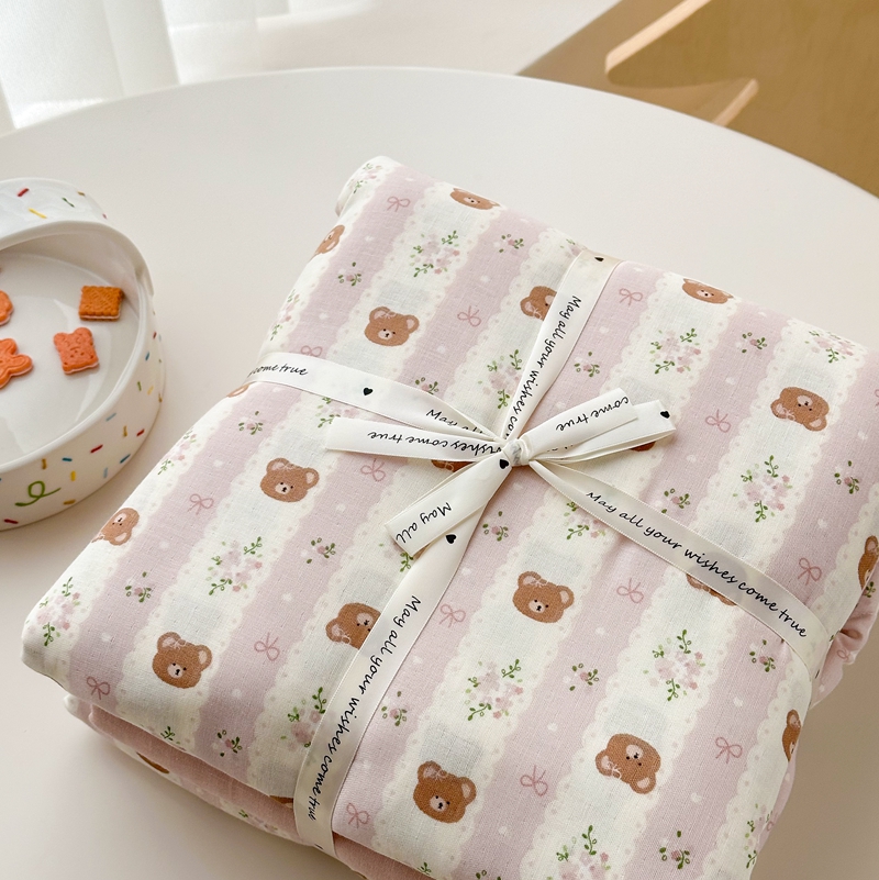 商品名称:桃喜 2025新款春夏双层纱卡通系列四件套 条纹小熊粉