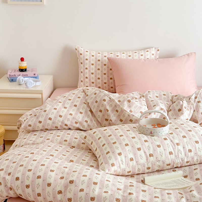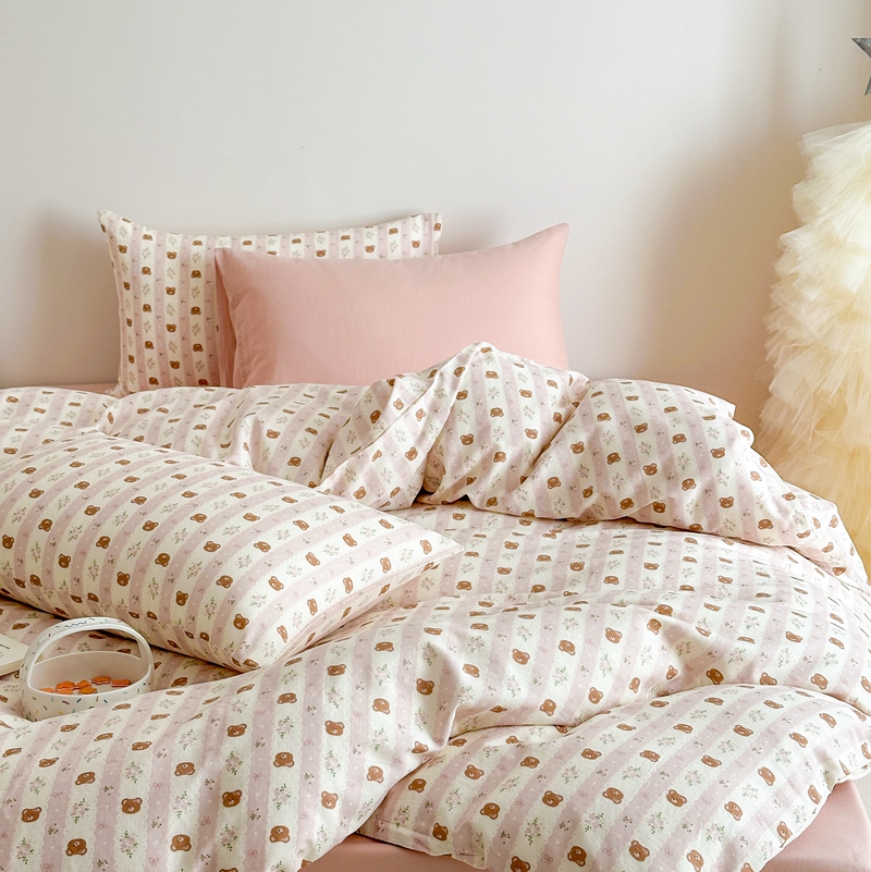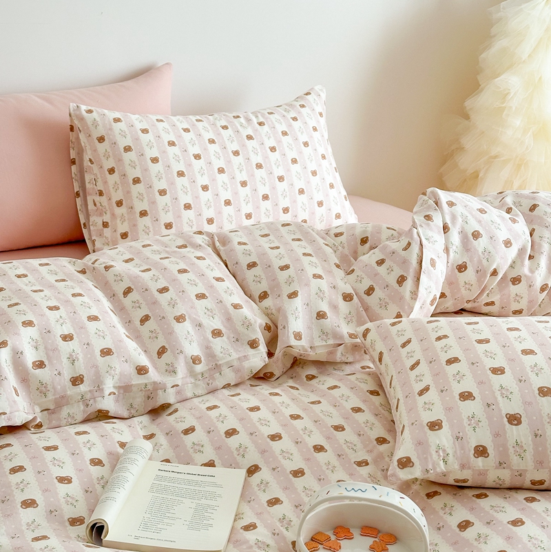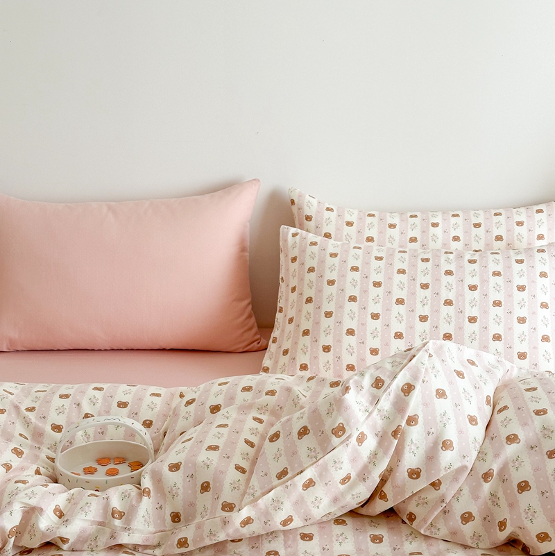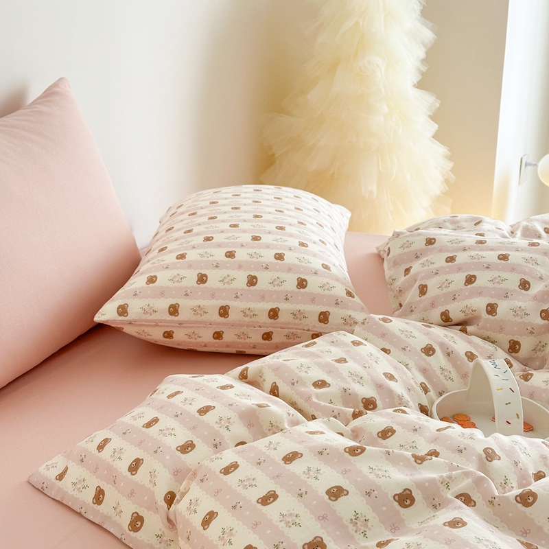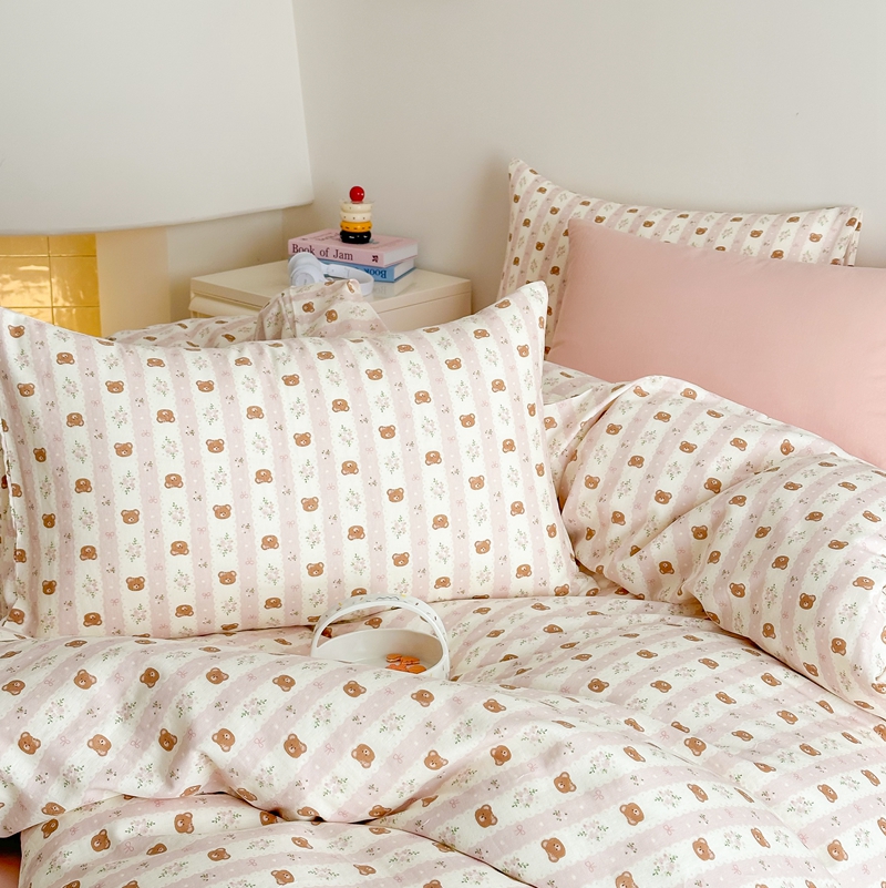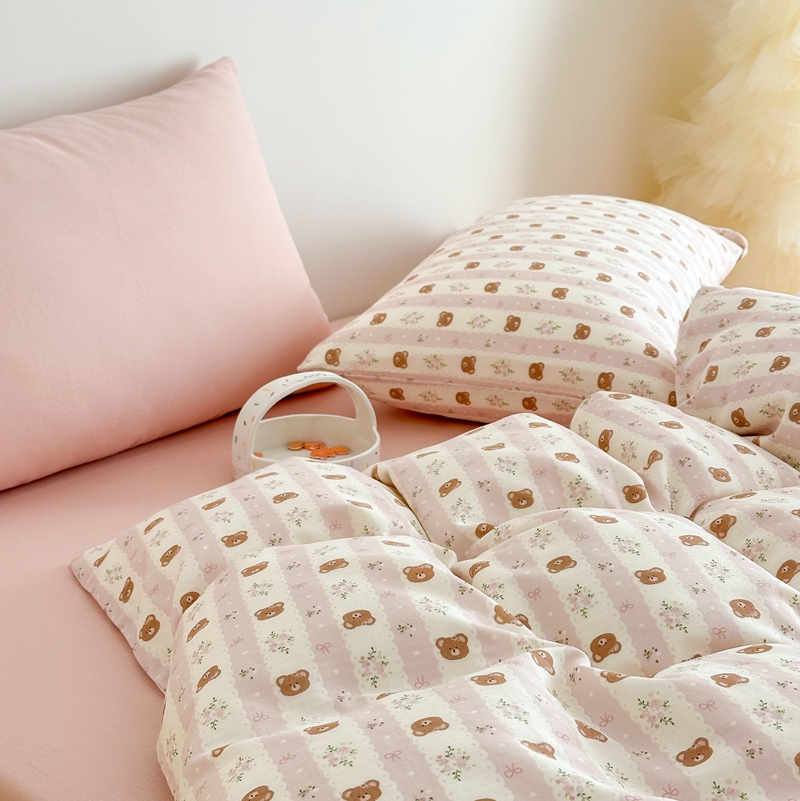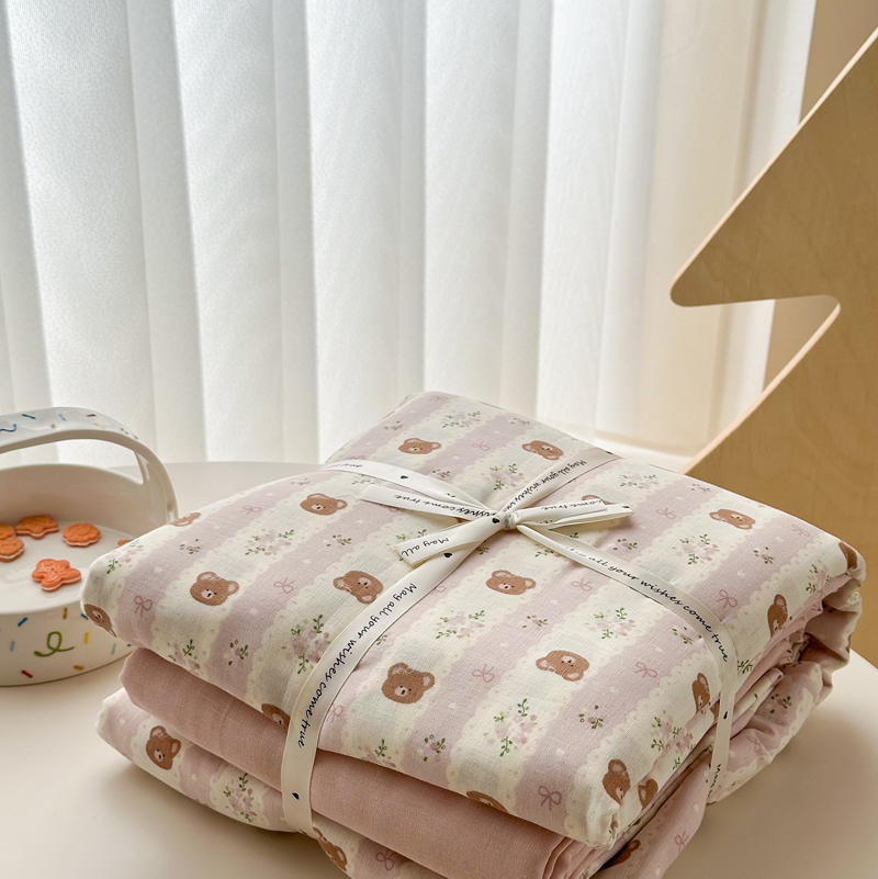 桃喜 2025新款春夏双层纱卡通系列四件套 条纹小熊粉
