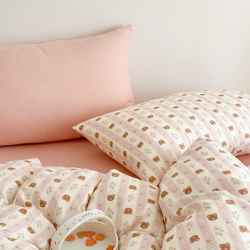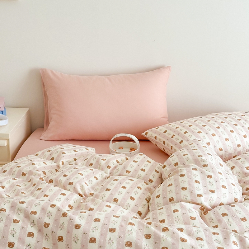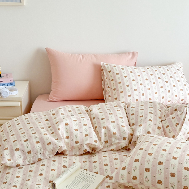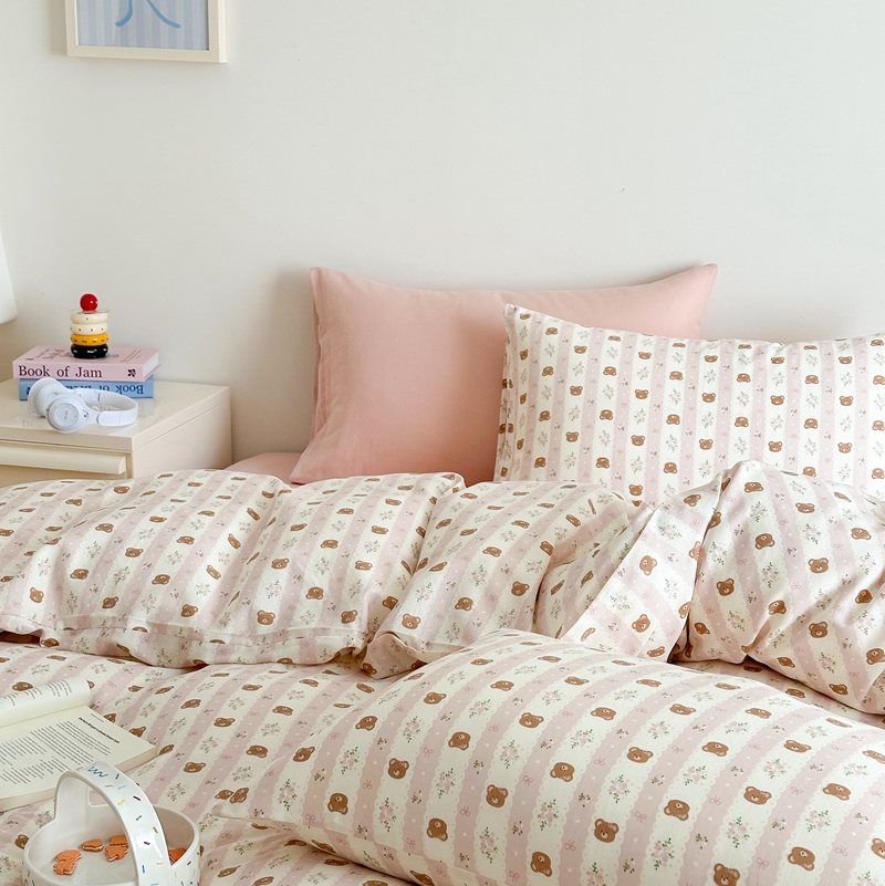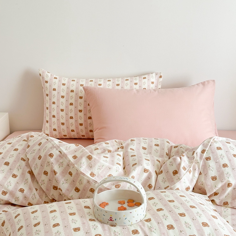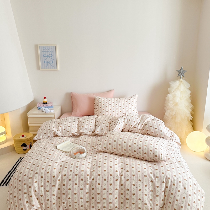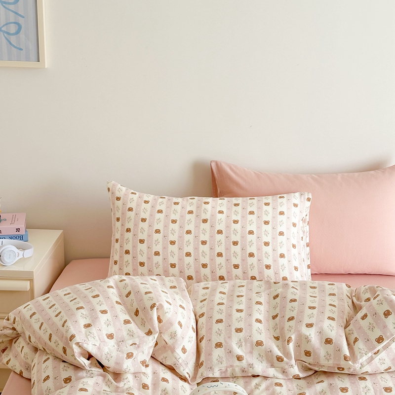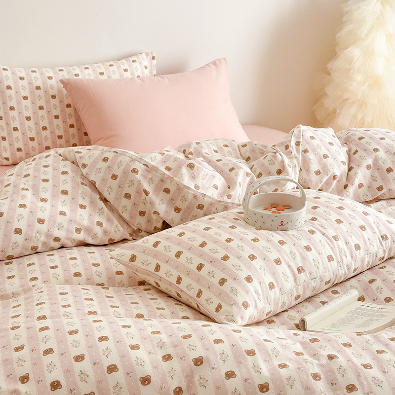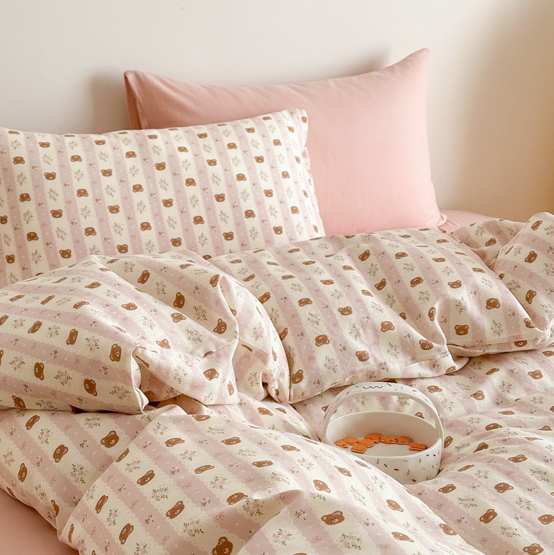 桃喜 2025新款春夏双层纱卡通系列四件套 条纹小熊粉