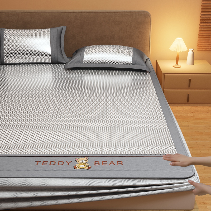 • 91家纺网 家纺一手货源 找家纺 席佬大 2025新款A级抗菌提花双面绣花床席床笠款冰藤席 泰迪熊-灰色-床笠款