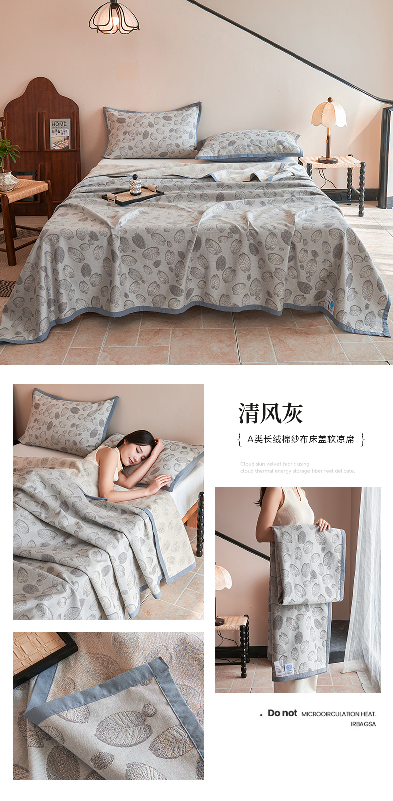 棠薇家纺2025新款全棉纱布床盖软凉席长绒棉纱布毯单毯子三件套 清风灰