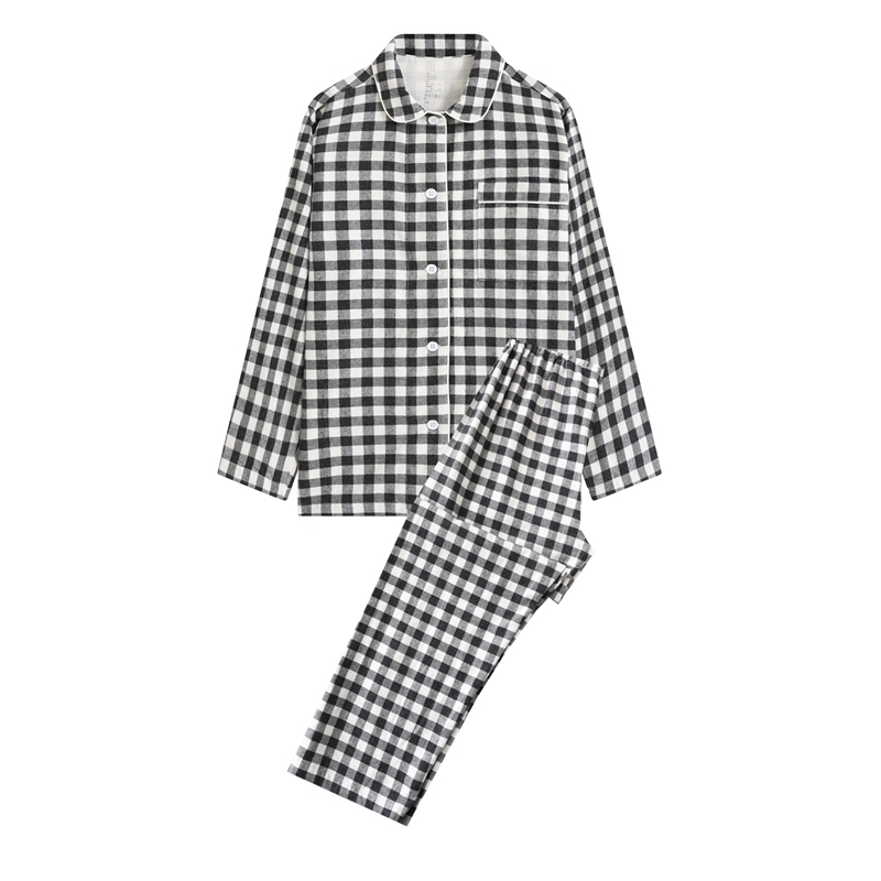 商品名称:伊嫚家居 2025新款无印日式双股全棉法兰绒家居服良品睡衣女纯棉直播秋冬款情侣睡衣 碳灰小格女