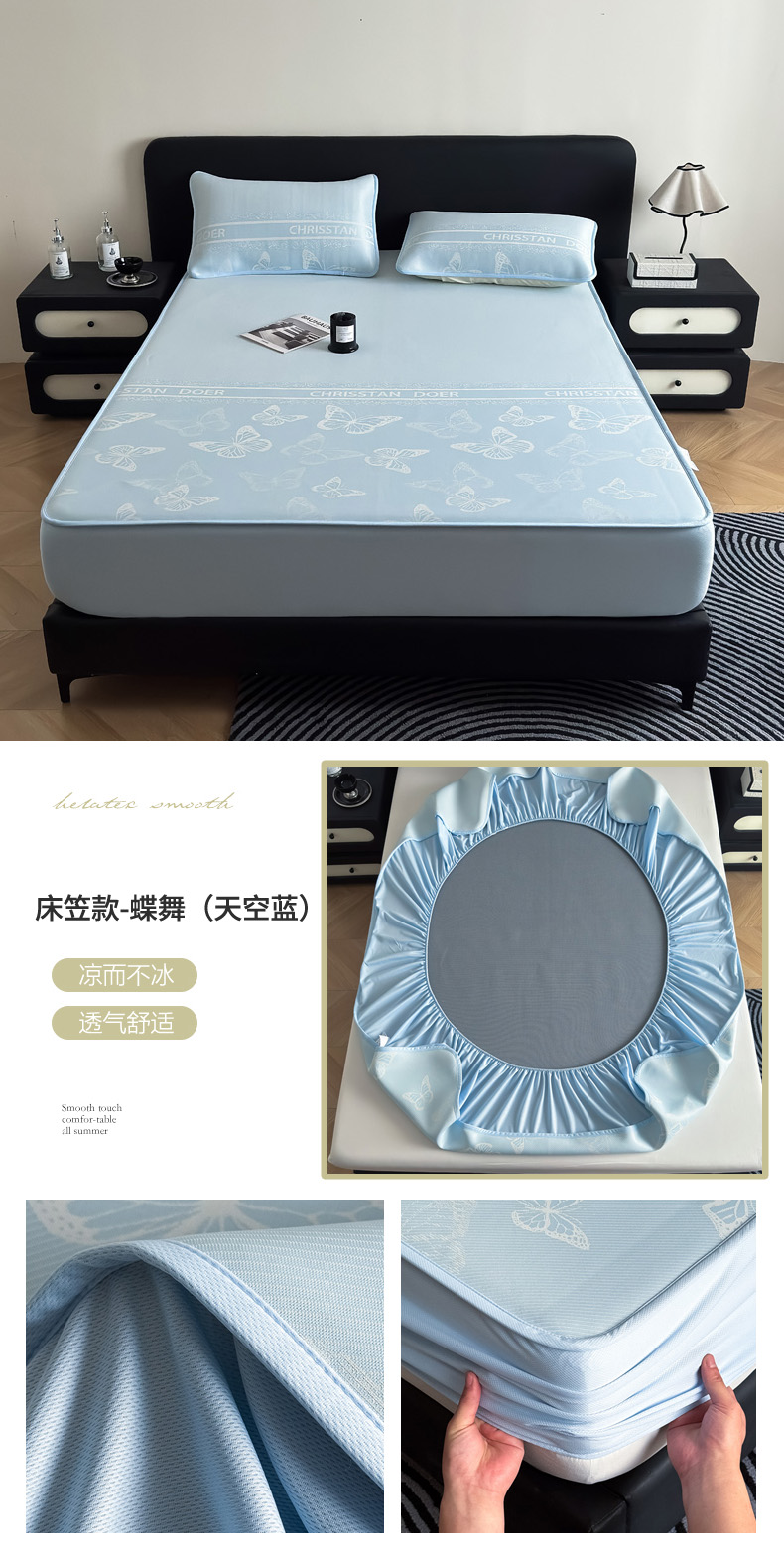 商品名称:九花鹿 2025新款A类PE凉感提花床笠款冰丝凉席软凉席可机洗可水洗 炫染流线(浅蓝)