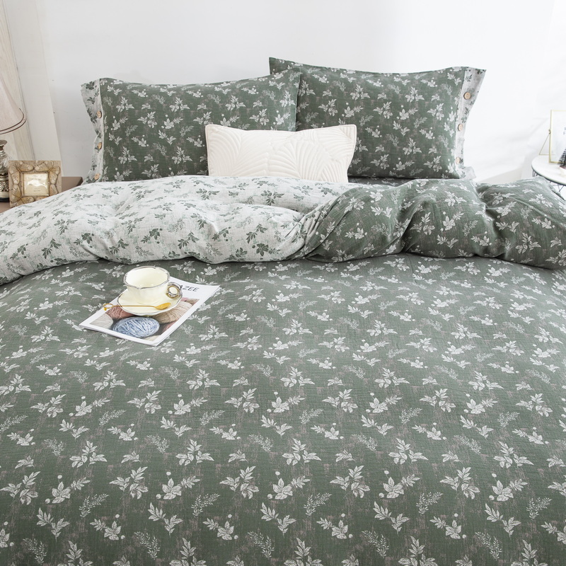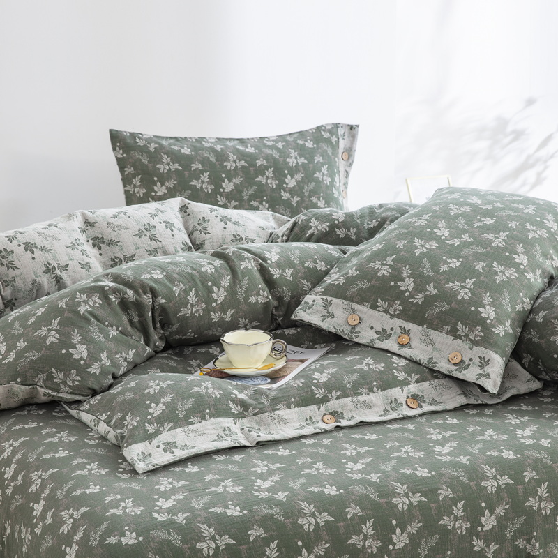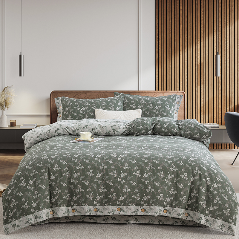 商品名称:2025新款全棉色织双层纱纽扣款四件套 倾城-绿