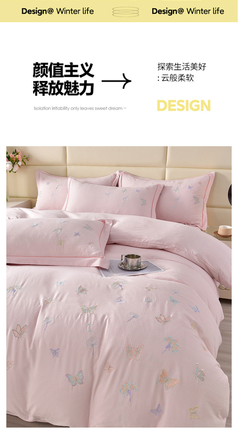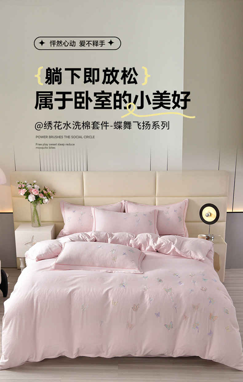 星窝2025新款绣花水洗棉四件套-蝶舞飞扬系列 温馨粉
