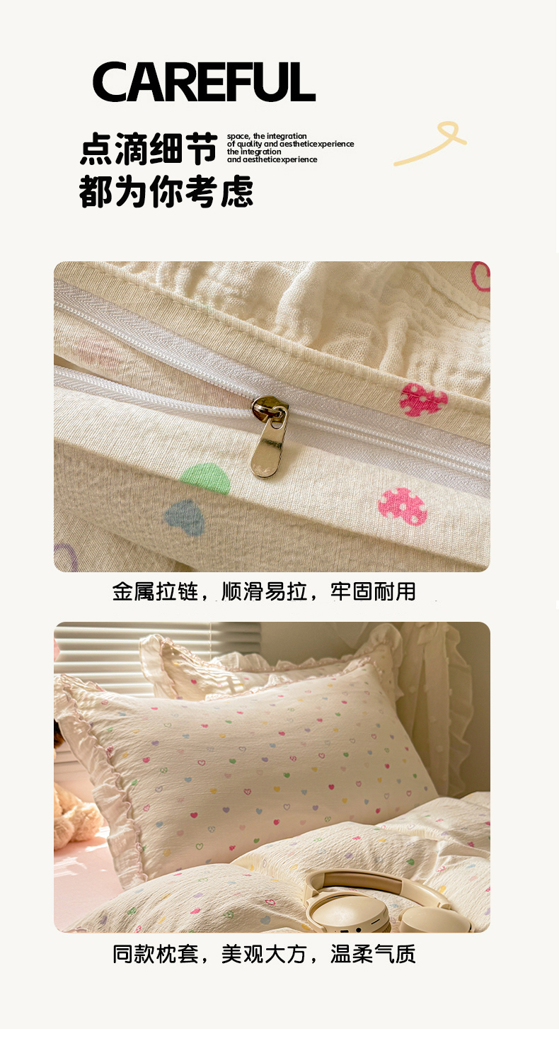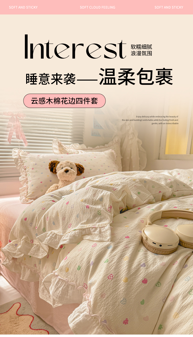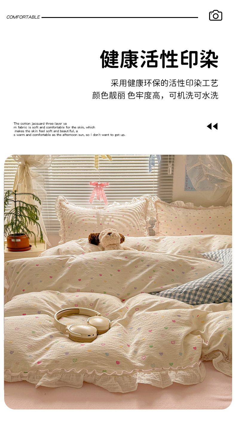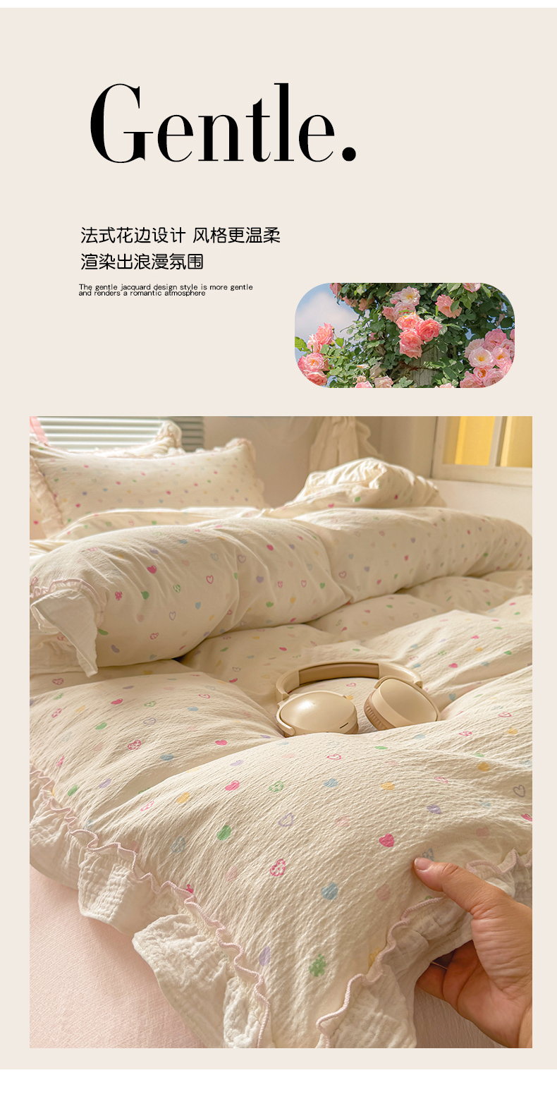 当前位置: 91家纺网 > 商品网购 > 床品套件 > 四件套 > 提花四件套 > 繁花家居 2025新款云感棉提花学生季超温柔小花边四件套 心型糖露