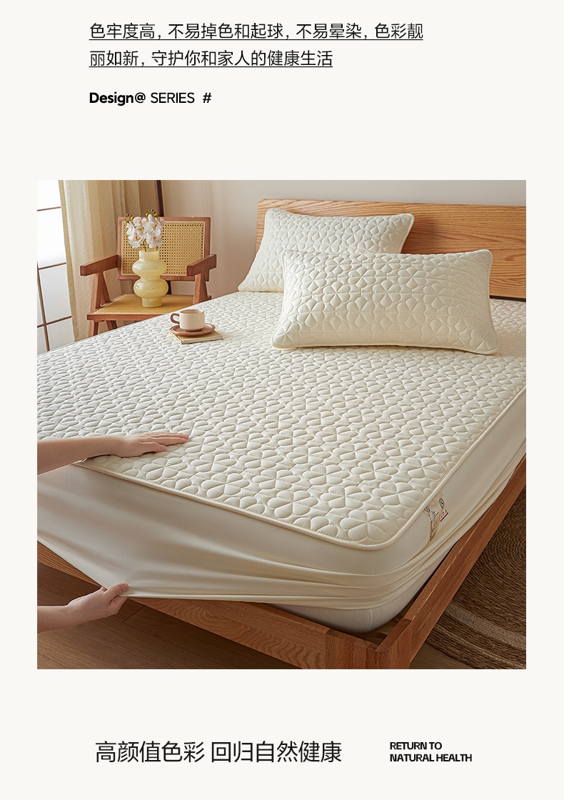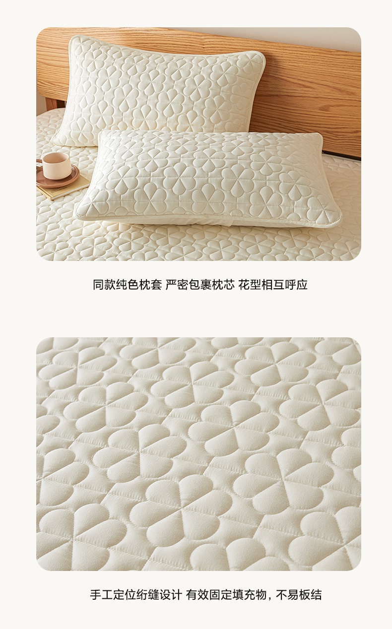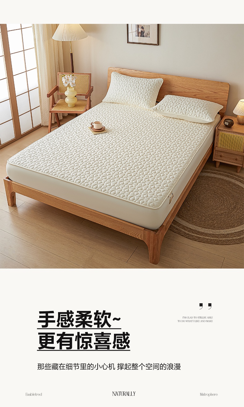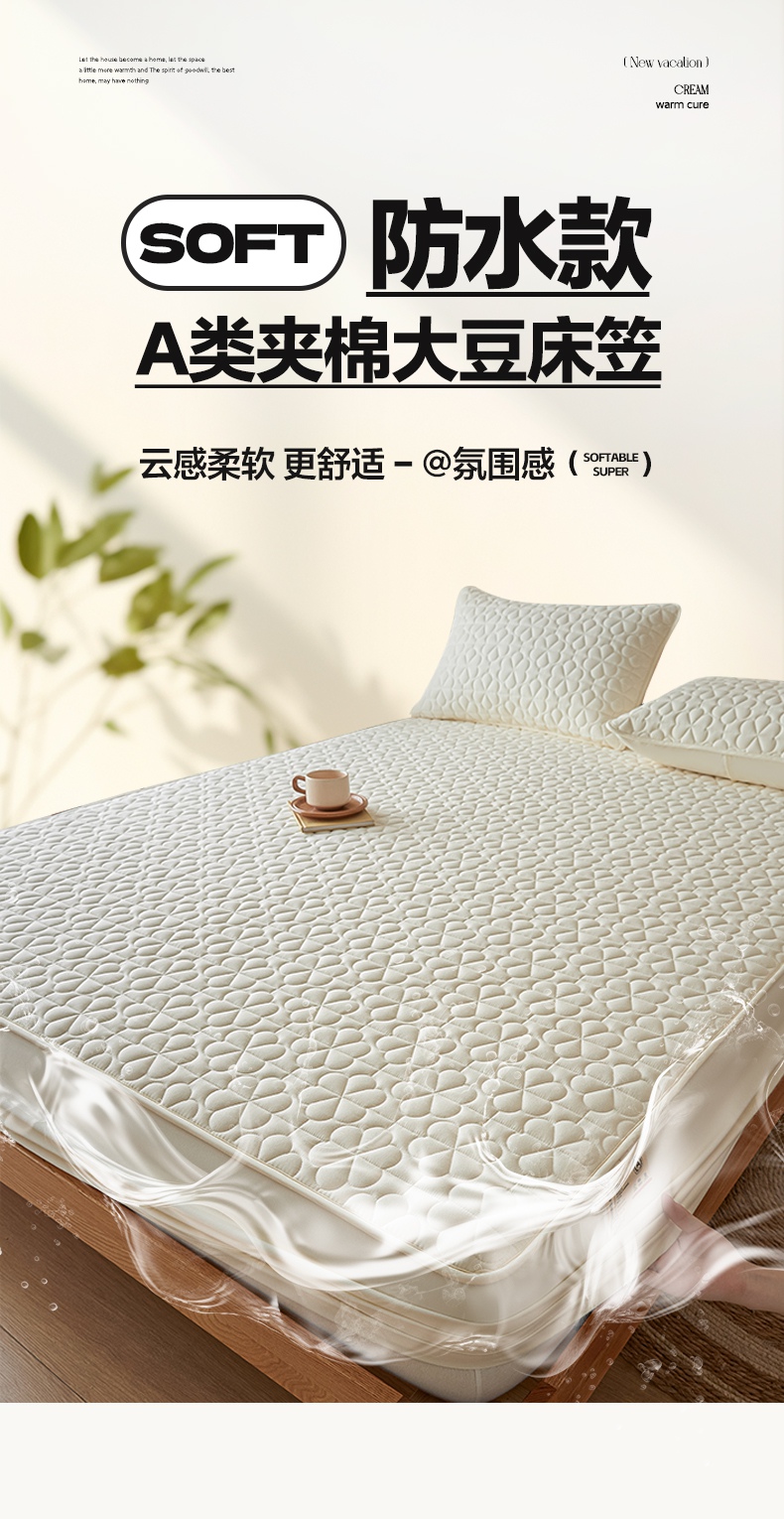 • 91家纺网 家纺一手货源 找家纺 芬晴家纺 2025新款A类母婴级大豆防水夹棉床笠系列-约定-心动-繁花 繁花-米白