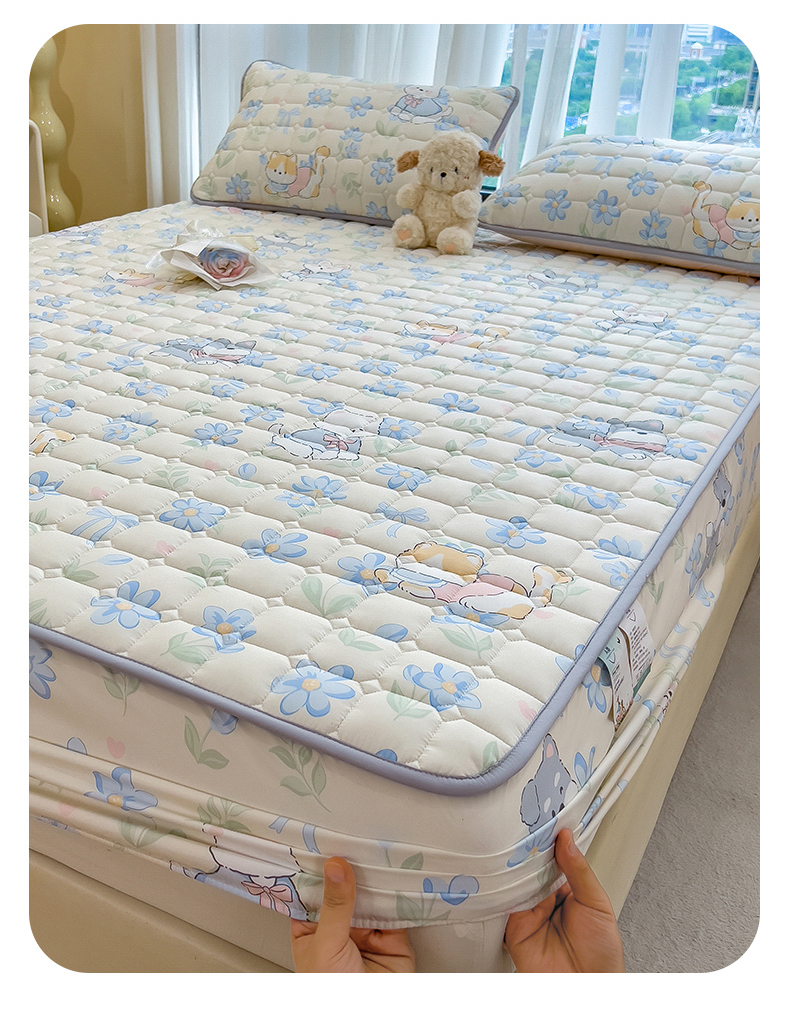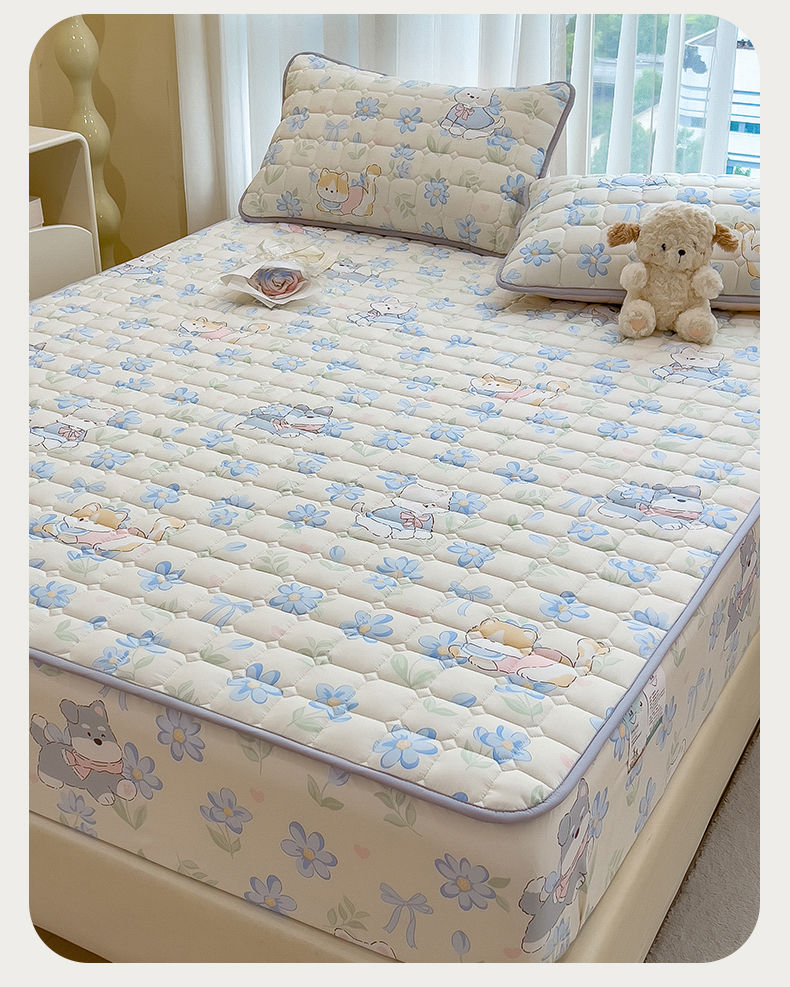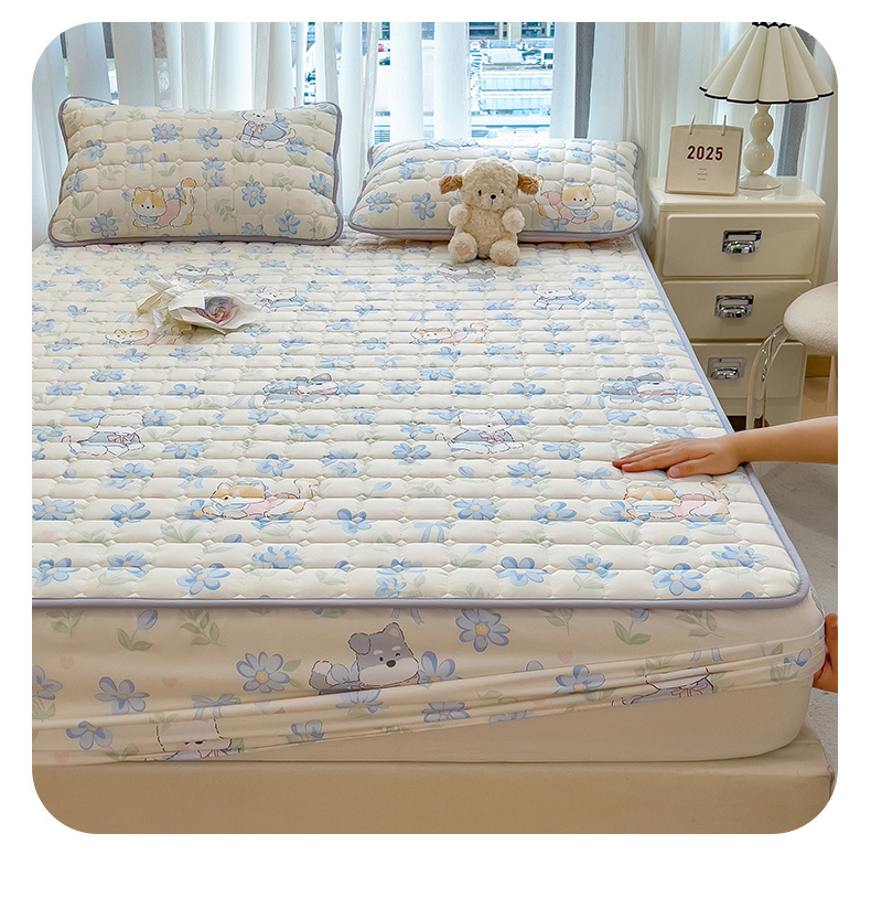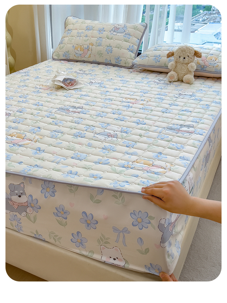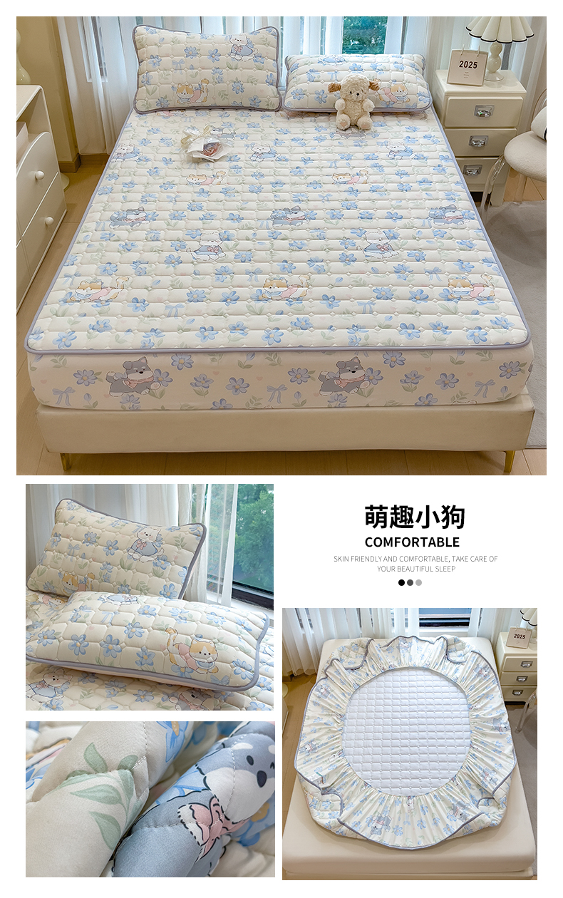 • 91家纺网 家纺一手货源 找家纺 雯豆家纺 2025四季款新品夹棉床笠三件套水洗棉磨毛小清新印花床垫保护套 萌趣小狗